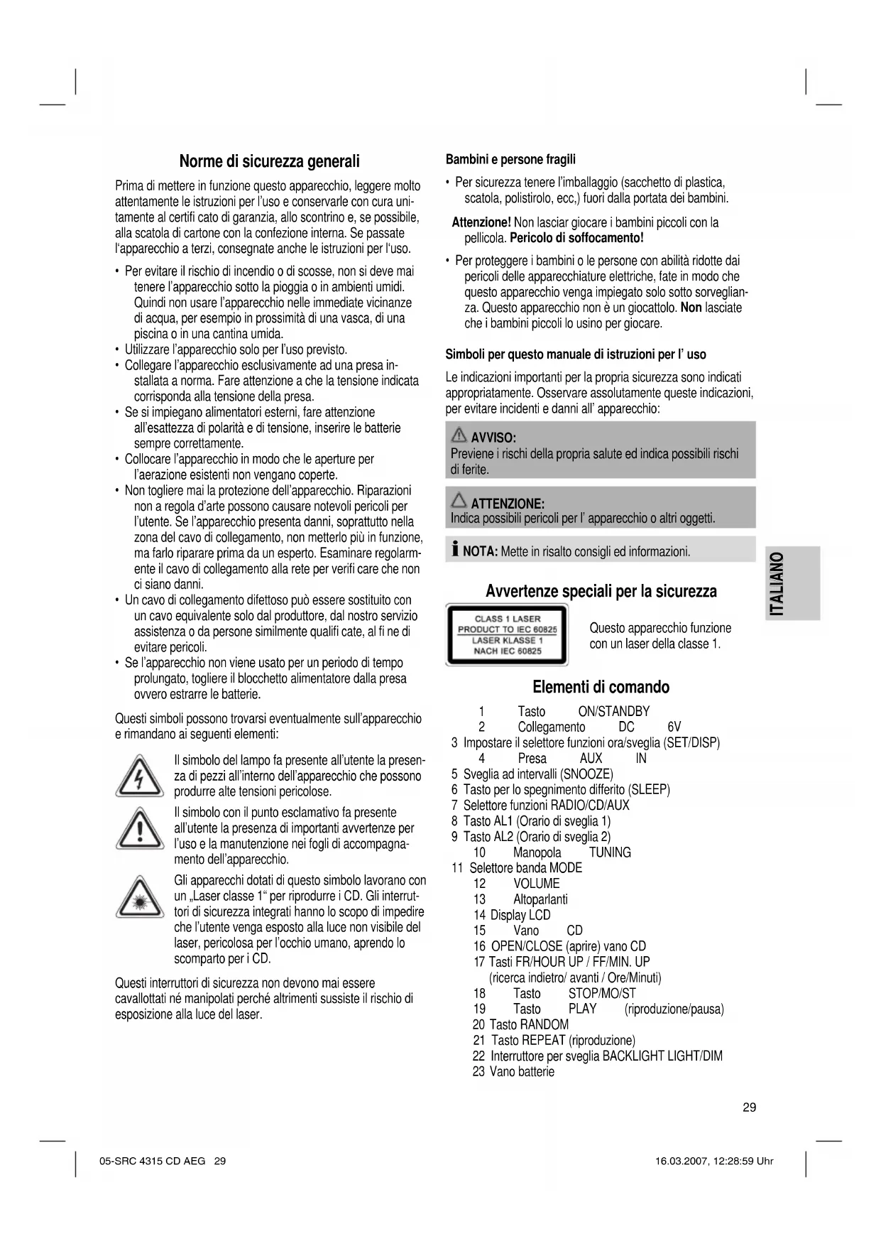 - Per proteggere i bambini o le persone con abilità ridotte dai pericoli delle apparecchiature elettriche, fate in modo che questo apparecchio venga impiegato solo sotto sorveglian- za. Questo apparecchio non è un giocattolo. Non lasciate che i bambini piccoli lo usino per giocare. Simboli per questo manuale di istruzioni per l’ uso Le indicazioni importanti per la propria sicurezza sono indicati appropriatamente. Osservare assolutamente queste indicazioni, per evitare incidenti e danni all’ apparecchio: AVVISO: Previene i rischi della propria salute ed indica possibili rischi di ferite. ATTENZIONE: Indica possibili pericoli per l’ apparecchio o altri oggetti. NOTA: Mette in risalto consigli ed informazioni. Avvertenze speciali per la sicurezza Questo apparecchio funzione con un laser della classe 1. Elementi di comando 1 Tasto ON/STANDBY 2 Collegamento DC 6V 3 Impostare il selettore funzioni ora/sveglia (SET/DISP) 4 Presa AUX IN 5 Sveglia ad intervalli (SNOOZE) 6 Tasto per lo spegnimento differito (SLEEP) 7 Selettore funzioni RADIO/CD/AUX 8 Tasto AL1 (Orario di sveglia 1) 9 Tasto AL2 (Orario di sveglia 2) 10 Manopola TUNING 11 Selettore banda MODE 12 VOLUME 13 Altoparlanti 14 Display LCD 15 Vano CD 16 OPEN/CLOSE (aprire) vano CD 17 Tasti FR/HOUR UP / FF/MIN. UP (ricerca indietro/ avanti / Ore/Minuti) 18 Tasto STOP/MO/ST 19 Tasto PLAY (riproduzione/pausa) 20 Tasto RANDOM 21 Tasto REPEAT (riproduzione) 22 Interruttore per sveglia BACKLIGHT LIGHT/DIM 23 Vano batterie 05-SRC 4315 CD AEG 29 16.03.2007, 12:28:59 Uhr30 ITALIANO ITALIANO Messa in funzione dell’apparecchio / Introduzione