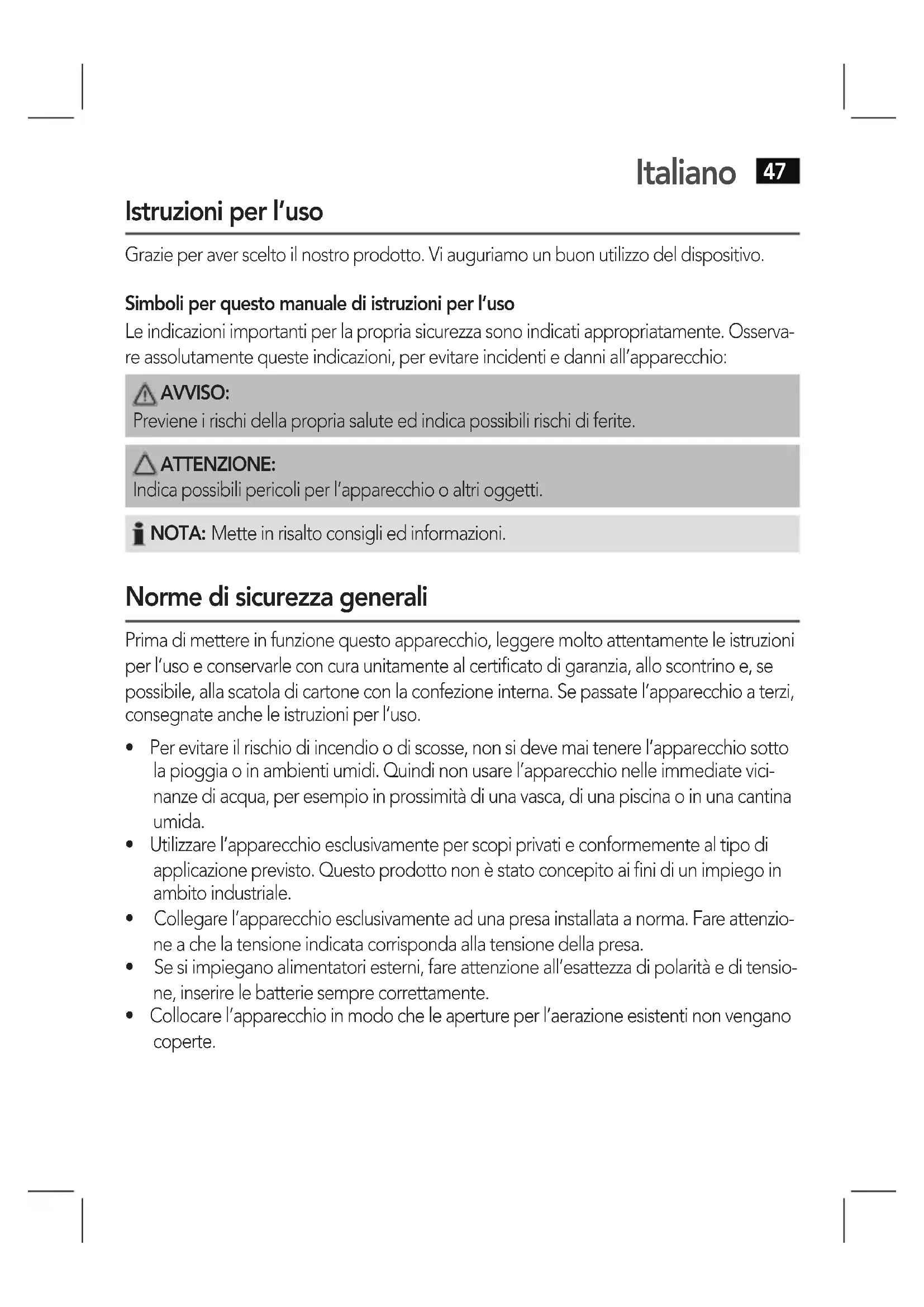 Istruzioni per l’uso Grazie per aver scelto il nostro prodotto. Vi auguriamo un buon utilizzo del dispositivo. Simboli per questo manuale di istruzioni per l’uso Le indicazioni importanti per la propria sicurezza sono indicati appropriatamente. Osserva- re assolutamente queste indicazioni, per evitare incidenti e danni all’apparecchio: AVVISO: Previene i rischi della propria salute ed indica possibili rischi di ferite. ATTENZIONE: Indica possibili pericoli per l’apparecchio o altri oggetti. NOTA: Mette in risalto consigli ed informazioni. Norme di sicurezza generali Prima di mettere in funzione questo apparecchio, leggere molto attentamente le istruzioni per l’uso e conservarle con cura unitamente al certificato di garanzia, allo scontrino e, se possibile,allascatoladicartoneconlaconfezioneinterna.Sepassatel‘apparecchioaterzi, consegnateancheleistruzioniperl‘uso.