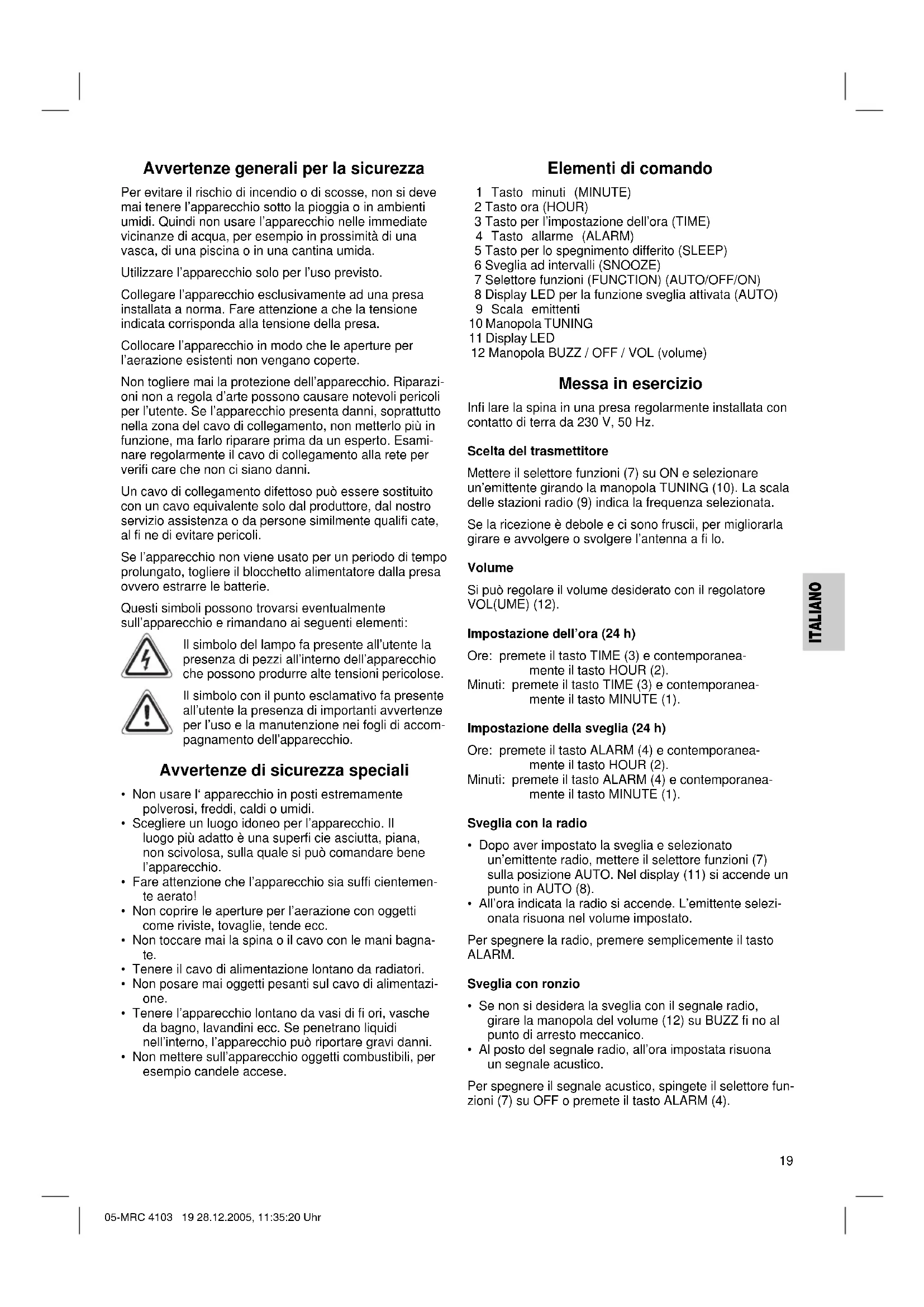 - Al posto del segnale radio, all’ora impostata risuona un segnale acustico. Per spegnere il segnale acustico, spingete il selettore fun- zioni (7) su OFF o premete il tasto ALARM (4). 05-MRC 4103 19 28.12.2005, 11:35:20 Uhr20 ITALIANO Allarme ad intervalli L’allarme inserito automaticamente si può spegnere con il tasto SNOOZE (6) per ca. 9 minuti. Spegnere Quando il selettore funzioni (7) è su “OFF”, l’apparecchio non è in funzione. Spegnimento a tempo Si può utilizzare la funzione sleep quando l’apparecchio è impostato su AUTO o OFF.