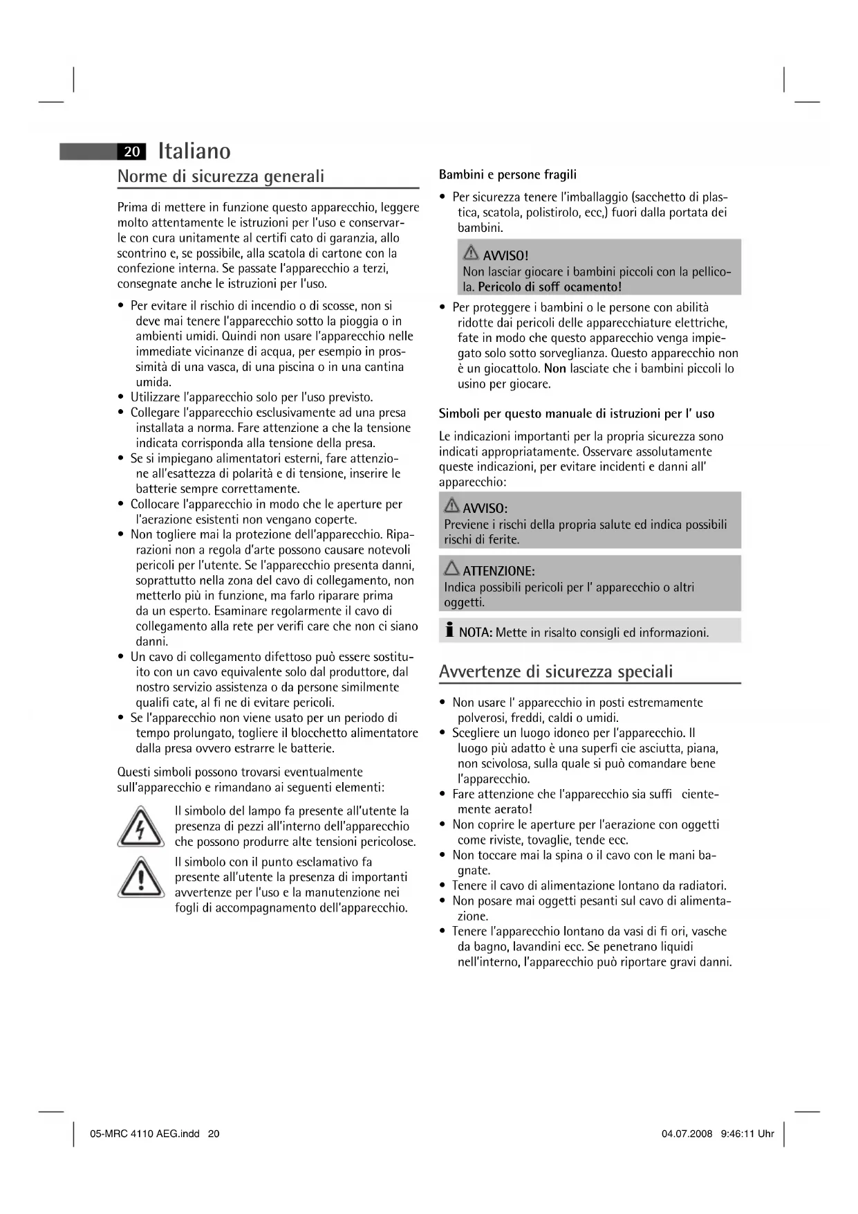 - Non immergete l’apparecchio in acqua. Dati tecnici Modello: ............................................................................MRC 4110 Alimentazione rete: ........................................2 0-240 V, 50 Hz Consumo di energia:.............................................................. W Batterie di riserva: .........................................................9 blocco V Classe di protezione: ......................................................................ΙΙ Peso netto: .............................................................................0,35 kg Componente della radio: Gamma di frequenza: ...... UKW / FM 88,0 ~ 108,0 MHz ............MW / AM 540 ~ 1600 kHz Questo apparecchio è stato controllato sulla base di tutte le direttive CE attuali in vigore in questo settore, quali per esempio la normativa in materia di compati- bilità elettromagnetica e la direttiva in materia di bassa tensione, ed è stato costruito conformemente alle norme di sicurezza più moderne. Con riserva di apportare modi che tecniche. Signi cato del simbolo „Eliminazione“ Salvaguardare l’ ambiente, gli elettrodomestici non vanno eliminati come ri uti domestici. Per l’ eliminazione degli elettrodomestici, fare uso dei posti di raccolta previsti per questo tipo e porre quegli elettrodomestici che non sono più in uso. Si contribuisce così ad evitare un e etto potenziale sull’ ambiente e sulla salute, dovuto magari ad una eliminazi- one sbagliata. Questo signi ca un contributo personale alla riutiliz- zazione, al riciclaggio e altre forme di utilizzazione di elettrodomestici ed apparecchi elettronici usati. Si possono trovare le corrispondenti informazioni sugli appositi luoghi di raccolta, nelle amministrazioni dei comuni. 05-MRC 4110 AEG.indd 2205-MRC 4110 AEG.indd 22 04.07.2008 9:46:12 Uhr04.07.2008 9:46:12 Uhr