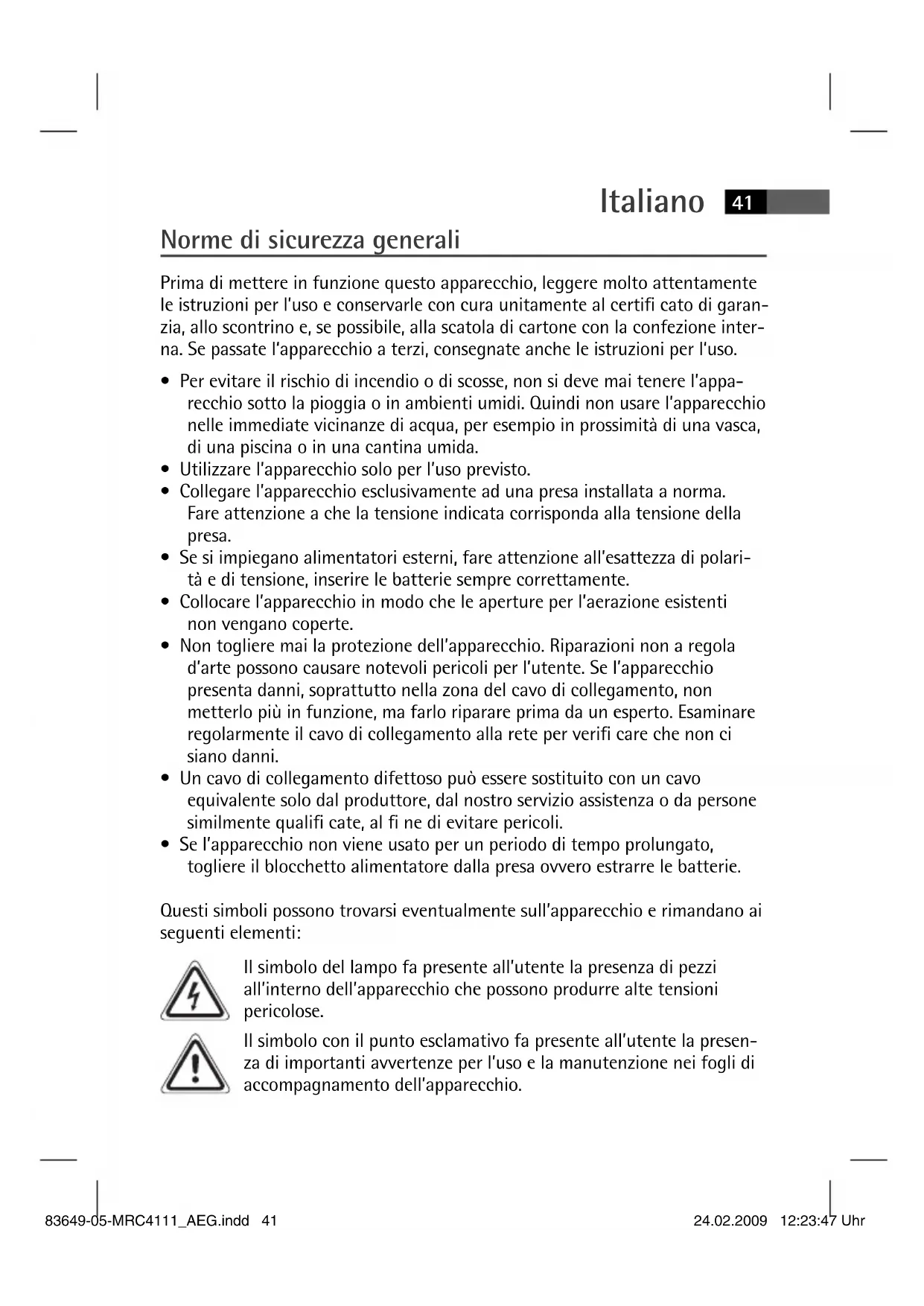 - Se l’apparecchio non viene usato per un periodo di tempo prolungato, togliere il blocchetto alimentatore dalla presa ovvero estrarre le batterie. Questi simboli possono trovarsi eventualmente sull’apparecchio e rimandano ai seguenti elementi: Il simbolo del lampo fa presente all’utente la presenza di pezzi all’interno dell’apparecchio che possono produrre alte tensioni pericolose. Il simbolo con il punto esclamativo fa presente all’utente la presen- za di importanti avvertenze per l’uso e la manutenzione nei fogli di accompagnamento dell’apparecchio. 83649-05-MRC4111_AEG.indd 4183649-05-MRC4111_AEG.indd 41 24.02.2009 12:23:47 Uhr24.02.2009 12:23:47 UhrItaliano