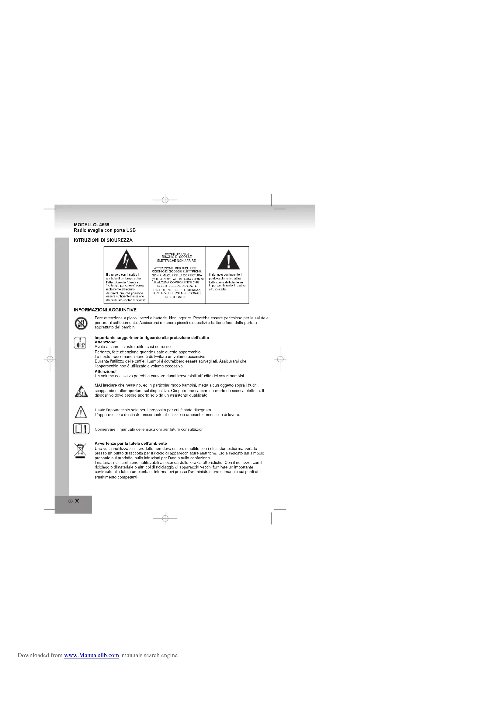 Il triangolo con inscritto il punto esclamativo attira l’attenzione dell’utente su importanti istruzioni relative all’uso e alla.Il triangolo con inscritto il simbolo di un lampo attira l’attenzione dell’utente su “voltaggio pericoloso” senza isolamento all’interno dell‘involucro, che potrebbe essere sufficientemente alto da costituire rischio di scosse.Fare attenzione a piccoli pezzi e batterie. Non ingerire. Potrebbe essere pericoloso per la salute e portare al soffocamento. Assicurarsi di tenere piccoli dispositivi e batterie fuori dalla portata soprattutto dei bambini.Importante suggerimento riguardo alla protezione dell’uditoAttenzione:Avete a cuore il vostro udito, così come noi.Pertanto, fate attenzione quando usate questo apparecchio.La nostra raccomandazione è di: Evitare un volume eccessivoDurante l'utilizzo delle cuffie, i bambini dovrebbero essere sorvegliati. Assicurarsi che l'apparecchio non è utilizzato a volume eccessivo.Attenzione!Un volume eccessivo potrebbe causare danni irreversibili all’udito dei vostri bambini.MAI lasciare che nessuno, ed in particolar modo bambini, metta alcun oggetto sopra i buchi, scappatoie o alter aperture sul dispositivo. Ciò potrebbe causare la morte da scossa elettrica. Il dispositivo deve essere aperto solo da un assistente qualificato.Usate l'apparecchio solo per il proposito per cui è stato disegnato.L'apparecchio è destinato unicamente all'utilizzo in ambienti domestici e di lavoro.Conservare il manuale delle istruzioni per future consultazioni.Avvertenze per la tutela dell’ambienteUna volta inutilizzabile il prodotto non deve essere smaltito con i rifiuti domestici ma portato presso un punto di raccolta per il riciclo di apparecchiature elettriche. Ciò è indicato dal simbolo presente sul prodotto, sulle istruzioni per l’uso o sulla confezione.I materiali riciclabili sono riutilizzabili a seconda delle loro caratteristiche. Con il riutilizzo, con il riciclaggio dimateriale o altri tipi di riciclaggio di apparecchi vecchi fornirete un importante contributo alla tutela ambientale. Informatevi presso l’amministrazione comunale sui punti di smaltimento competenti. INFORMAZIONI AGGIUNTIVE AVVERTIMENTORISCHIO DI SCOSSEELETTRICHE NON APRIRE ATTENZIONE: PER RIDURRE IL RISCHIO DI SCOSSE ELETTRICHE, NON RIMUOVERE LA COPERTURA (O IL FONDO). ALL’INTERNO NON VI È ALCUNA COMPONENTE CHE POSSA ESSERE RIPARATA DALL’UTENTE. PER LE RIPARAZ IONI, RIVOLGERSI A PERSONALE QUALIFICATO. Downloaded from www.Manualslib.com manuals search engine31. Non ostacolate la ventilazione del dispositivo. Assicuratevi che né tende, giornali, coperte o mobili blocchino le scappatoie della ventilazione dell’apparato. La ventilazione dev’essere costantemente assicurata! Un eventuale surriscaldamento potrebbe causare seri danni al dispositivo e ridurre sia le prestazioni che la durata del funzionamento.Riscaldamento e caloreNon esponete l’apparecchio a luce del sole diretta. Assicuratevi che l’apparecchio non sia soggetto a fonti di calore dirette come stufe o fiamme. Assicuratevi che le vie di ventilazione dell’apparecchio non siano coperte.Umidità e puliziaQuesto apparecchio non è impermeabile! Non immergere il dispositivo in acqua. Evitare che il dispositivo entri in contatto con l'acqua. L'ingresso di acqua all'interno del dispositivo potrebbe danneggiarlo gravemente. Non utilizzare detergenti che contengono alcol, ammoniaca, benzene o sostanze abrasive poiché potrebbero danneggiare l'apparecchio. Per la pulizia, utilizzare un panno morbido inumidito.Riciclaggio professionaleLe batterie e l’imballaggio non fanno parte della vostra spazzatura casalinga. Le batterie devono essere passate ad un centro di raccolta per batterie usate. Disporre separatamente dei materiali d’imballaggio è un aiuto alla conservazione dell’ambiente.