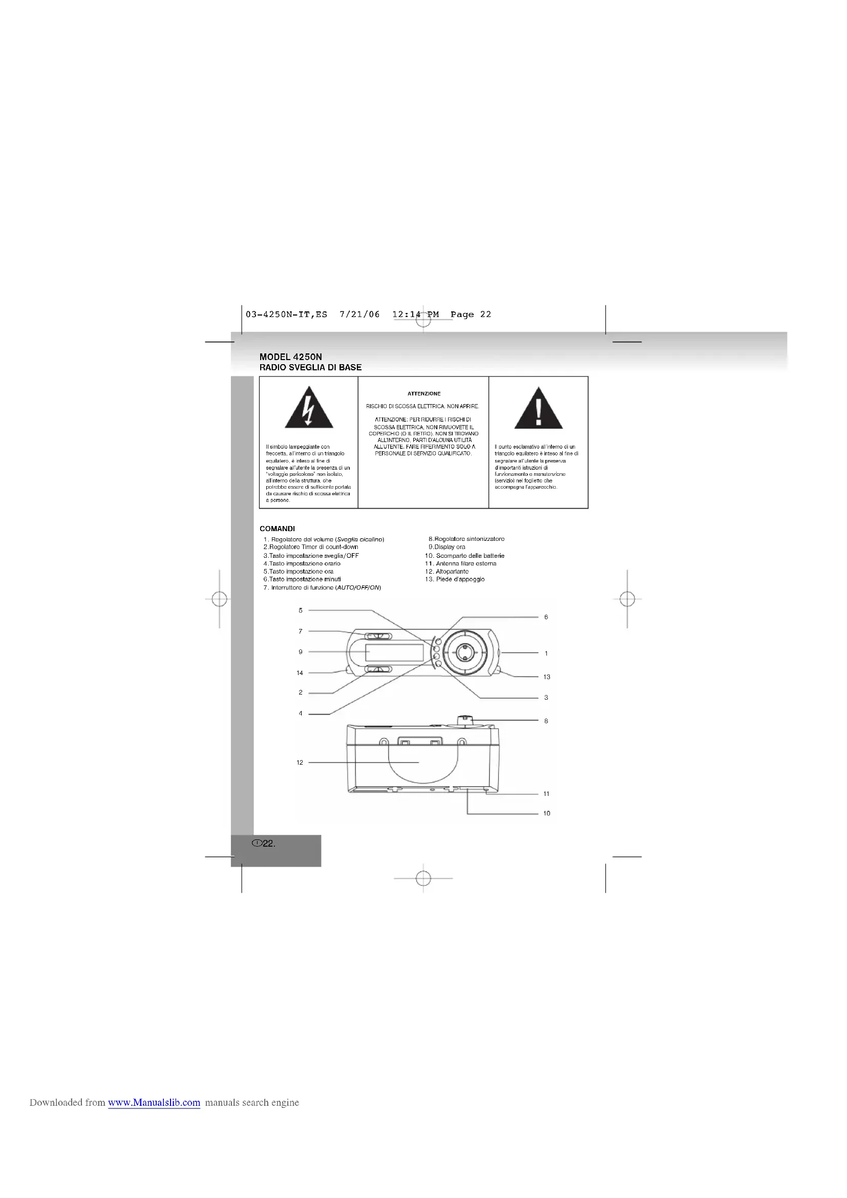 03-4250N-IT,ES 7/21/06 12:14 PM Page 22 Downloaded from www.Manualslib.com manuals search engineALLACCIAMENTO DELLA RETE ELETTRICA Inserire una batteria di 9 Volt (dimensioni 006P) nello scomparto batterie (10) per salvaguardare l'orario in caso di mancanza di corrente. Prima di inserire il cavo di rete controllare l’etichetta dell’apparecchio. Deve CORRISPONDERE alla potenza dell’allacciamento della rete elettrica domestica, poi è possibile inserire la spina nella presa. NOTA: Rimuovere le batterie dallo scomparto se l’apparecchio non è utilizzato per lungo tempo. Ciò per evitare che le batterie rovinino l’apparecchio a causa di perdite. Per una prestazione migliore si consigliano batterie alcaline.COLLOCAZIONEQuesto apparecchio è costruito per essere montato sotto dispense o utilizzando il piede d’appoggio su scrivanie. Vedere il paragrafo STRUTTURA per montare l’unità sotto dispense.