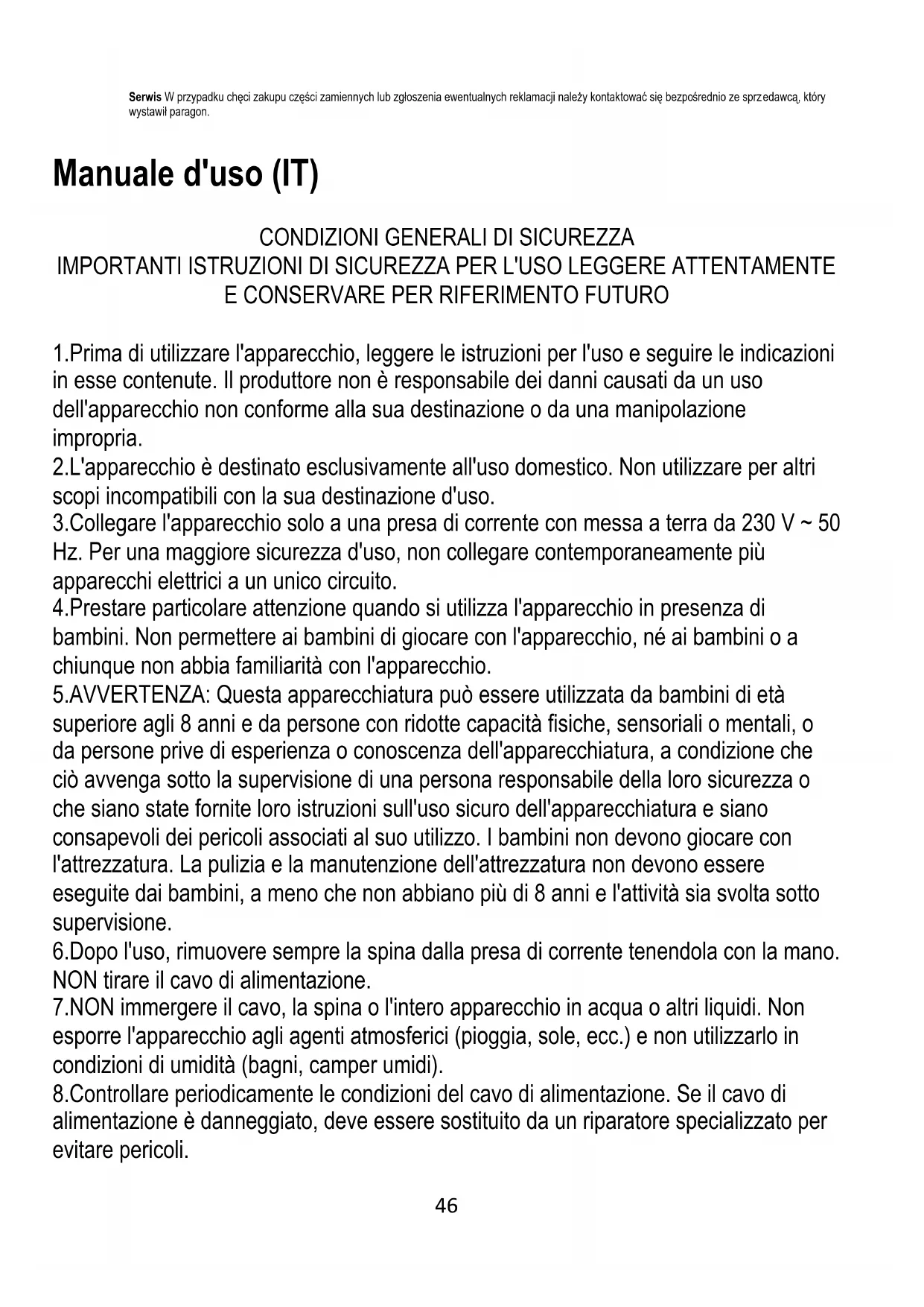 1.Prima di utilizzare l'apparecchio, leggere le istruzioni per l'uso e seguire le indicazioni in esse contenute. Il produttore non è responsabile dei danni causati da un uso dell'apparecchio non conforme alla sua destinazione o da una manipolazione impropria. 2.L'apparecchio è destinato esclusivamente all'uso domestico. Non utilizzare per altri scopi incompatibili con la sua destinazione d'uso. 3.Collegare l'apparecchio solo a una presa di corrente con messa a terra da 230 V ~ 50 Hz. Per una maggiore sicurezza d'uso, non collegare contemporaneamente più apparecchi elettrici a un unico circuito. 4.Prestare particolare attenzione quando si utilizza l'apparecchio in presenza di bambini. Non permettere ai bambini di giocare con l'apparecchio, né ai bambini o a chiunque non abbia familiarità con l'apparecchio. 5.AVVERTENZA: Questa apparecchiatura può essere utilizzata da bambini di età superiore agli 8 anni e da persone con ridotte capacità fisiche, sensoriali o mentali, o da persone prive di esperienza o conoscenza dell'apparecchiatura, a condizione che ciò avvenga sotto la supervisione di una persona responsabile della loro sicurezza o che siano state fornite loro istruzioni sull'uso sicuro dell'apparecchiatura e siano consapevoli dei pericoli associati al suo utilizzo. I bambini non devono giocare con l'attrezzatura. La pulizia e la manutenzione dell'attrezzatura non devono essere eseguite dai bambini, a meno che non abbiano più di 8 anni e l'attività sia svolta sotto supervisione. 6.Dopo l'uso, rimuovere sempre la spina dalla presa di corrente tenendola con la mano. NON tirare il cavo di alimentazione. 7.NON immergere il cavo, la spina o l'intero apparecchio in acqua o altri liquidi. Non esporre l'apparecchio agli agenti atmosferici (pioggia, sole, ecc.) e non utilizzarlo in condizioni di umidità (bagni, camper umidi). 8.Controllare periodicamente le condizioni del cavo di alimentazione. Se il cavo di alimentazione è danneggiato, deve essere sostituito da un riparatore specializzato per evitare pericoli.47 9.Non utilizzare l'apparecchio con un cavo di alimentazione danneggiato o se è caduto o è stato danneggiato in altro modo o non funziona correttamente. Non riparare l'apparecchio da soli, perché c'è il rischio di scosse. Portare l'apparecchio danneggiato presso un centro di assistenza competente per l'ispezione o la riparazione. Le riparazioni possono essere effettuate solo da centri di assistenza autorizzati. Una riparazione non corretta può comportare gravi rischi per l'utente. 10.Collocare l'apparecchio su una superficie fresca, stabile e piana, lontano da apparecchi di cottura caldi come fornelli elettrici, bruciatori a gas, ecc. 11.Non utilizzare l'apparecchio in prossimità di materiali infiammabili. 12.Il cavo di alimentazione non deve pendere oltre il bordo del tavolo o toccare superfici calde. 13.Non lasciare incustodito l'apparecchio o l'alimentatore collegato alla presa di corrente. 14.Per una maggiore protezione, si consiglia di installare nel circuito elettrico un interruttore differenziale (RCD) con una corrente residua nominale non superiore a 30 mA. A tale proposito, si consiglia di rivolgersi a un elettricista specializzato.