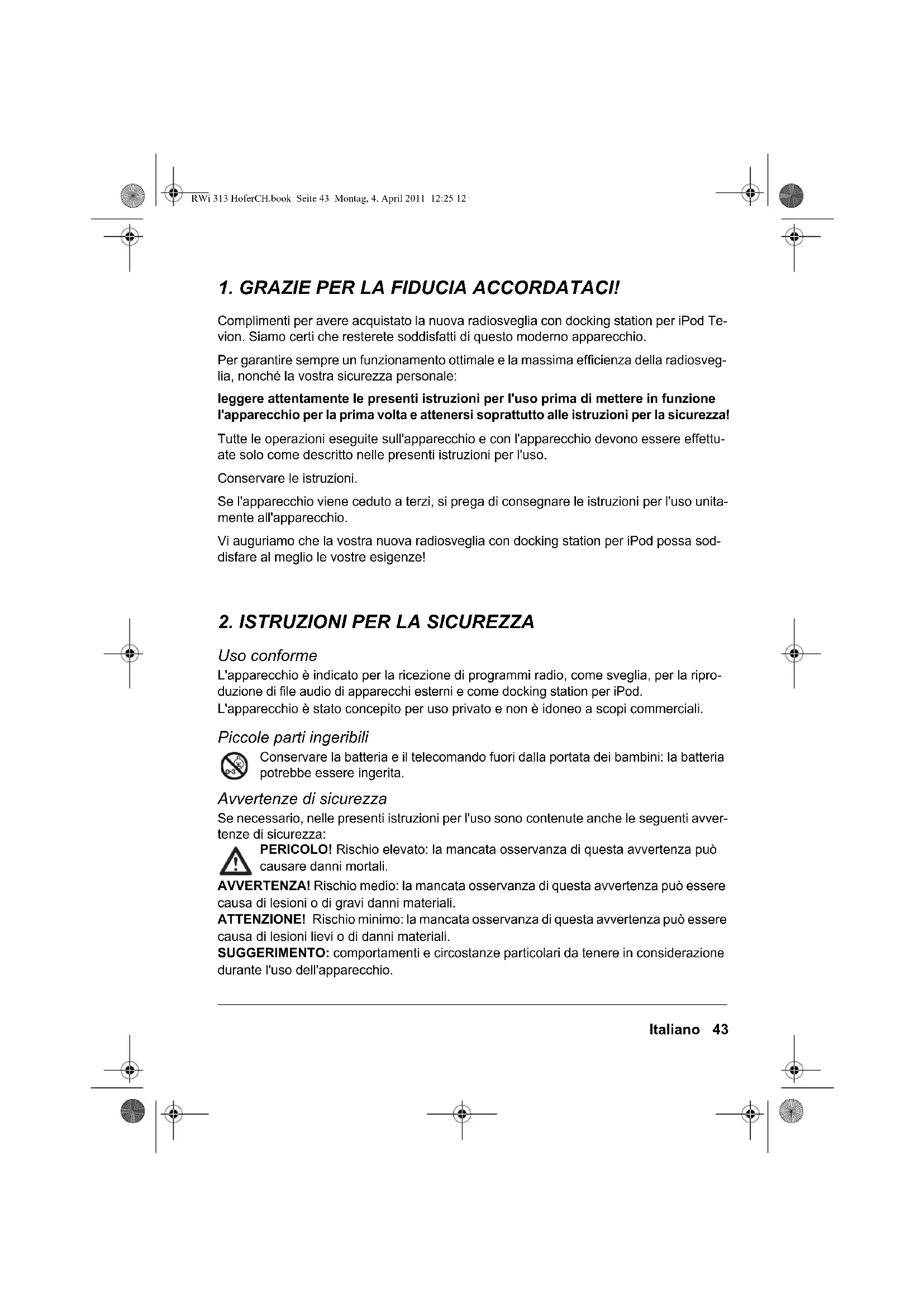 Uso conforme L'apparecchio è indicato per la ricezione di programmi radio, come sveglia, per la ripro- duzione di file audio di apparecchi esterni e come docking station per iPod. L'apparecchio è stato concepito per uso privato e non è idoneo a scopi commerciali. Piccole parti ingeribili Conservare la batteria e il telecomando fuori dalla portata dei bambini: la batteria potrebbe essere ingerita. Avvertenze di sicurezza Se necessario, nelle presenti istruzioni per l'uso sono contenute anche le seguenti avver- tenze di sicurezza: PERICOLO! Rischio elevato: la mancata osservanza di questa avvertenza può causare danni mortali. AVVERTENZA! Rischio medio: la mancata osservanza di questa avvertenza può essere causa di lesioni o di gravi danni materiali. ATTENZIONE! Rischio minimo: la mancata osservanza di questa avvertenza può essere causa di lesioni lievi o di danni materiali. SUGGERIMENTO: comportamenti e circostanze particolari da tenere in considerazione durante l'uso dell'apparecchio. RWi 313 HoferCH.book Seite 43 Montag, 4. April 2011 12:25 1244 Italiano Note generali