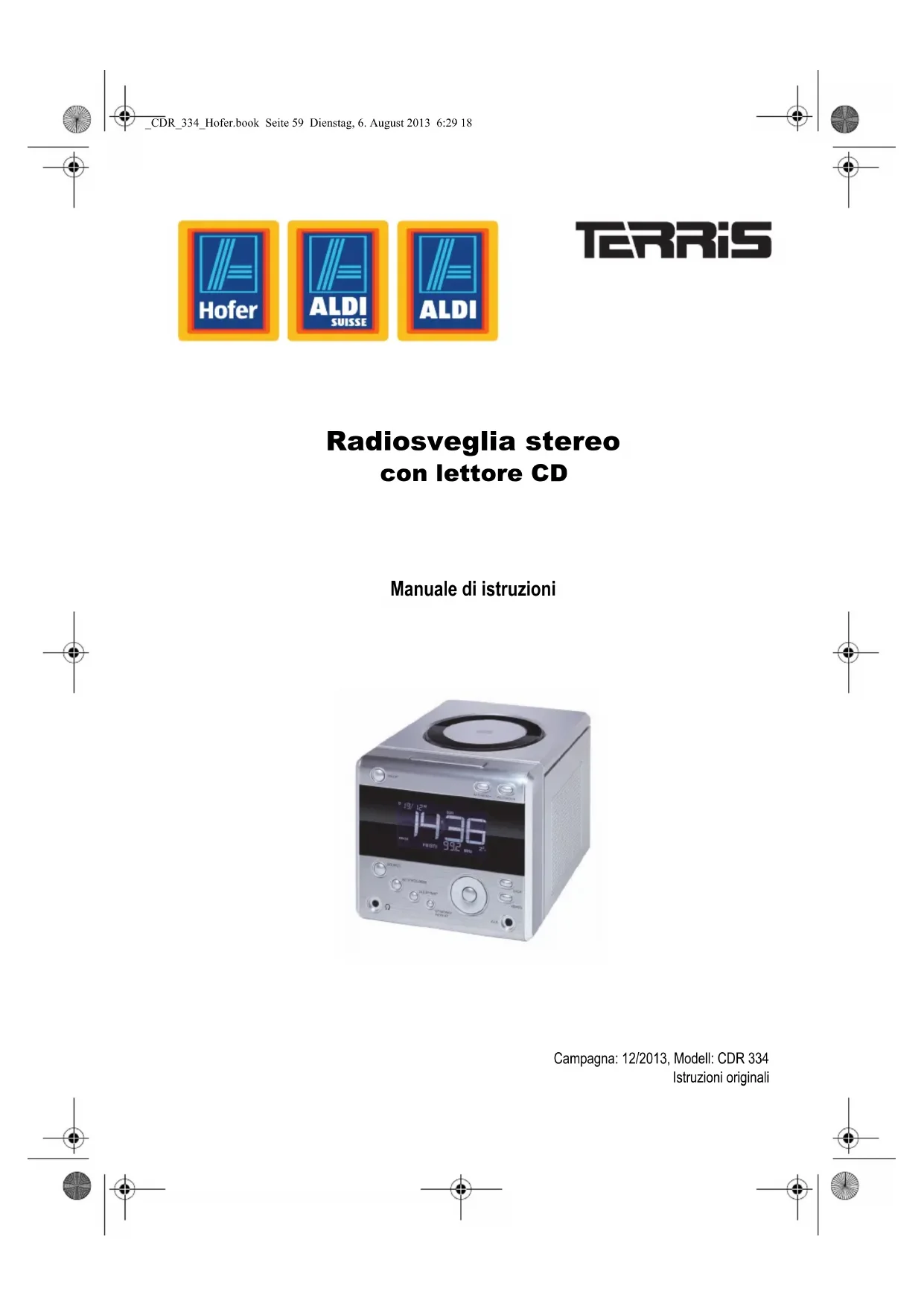 Rue : .................................................................................... Tél./courriel : .................................................................................... Signature : .................................................................................... _CDR_334_Hofer.book Seite 58 Dienstag, 6. August 2013 6:29 18Radiosveglia stereo con lettore CD Manuale di istruzioni Campagna: 12/2013, Modell: CDR 334 Istruzioni originali _CDR_334_Hofer.book Seite 59 Dienstag, 6. August 2013 6:29 1860 Grazie per la fiducia accordataci! Congratulazioni per l'acquisto della vostra nuova radiosveglia con let- tore CD. Siamo certi che sarete soddisfatti di questo apparecchio. Per assicurare sempre un funzionamento ottimale e la costante dispo- nibilità della radiosveglia con lettore CD e garantire la vostra sicurezza personale: Leggere attentamente il presente manuale di istruzioni per l'uso prima della prima messa in funzione e attenersi soprattutto alle istruzioni per la sicurezza! Ci auguriamo che la radiosveglia con lettore CD possa darvi molte sod- disfazioni. Nota sulla dichiarazione di conformità Dichiariamo che questo prodotto è conforme ai requisiti fonda- mentali e alle altre prescrizioni pertinenti della Direttiva CEM 2004/108/CE, della Direttiva ErP 2009/125/CE, della Direttiva bassa tensione 2006/95/CE e della Direttiva RoHS 2011/65/UE. L'intero testo della dichiarazione di conformità è disponibile in in- ternet all'indirizzo www.gt-support.de. _CDR_334_Hofer.book Seite 60 Dienstag, 6. August 2013 6:29 1861 Materiale in dotazione Italiano Panoramica dei dati