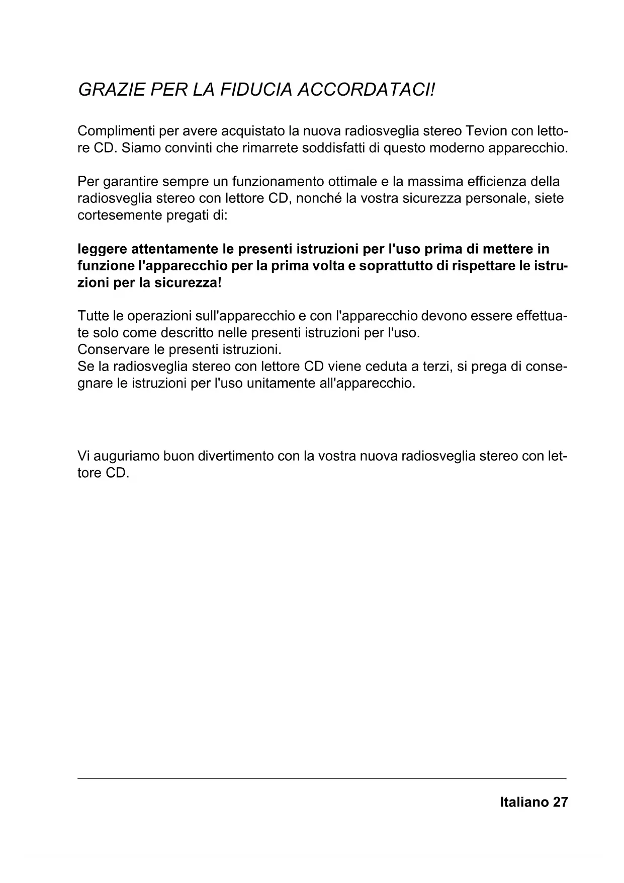 CDR 2009.book Seite 26 Donnerstag, 25. September 2008 3:46 15Italiano 27 GRAZIE PER LA FIDUCIA ACCORDATACI! Complimenti per avere acquistato la nuova radiosveglia stereo Tevion con letto- re CD. Siamo convinti che rimarrete soddisfatti di questo moderno apparecchio. Per garantire sempre un funzionamento ottimale e la massima efficienza della radiosveglia stereo con lettore CD, nonché la vostra sicurezza personale, siete cortesemente pregati di: leggere attentamente le presenti istruzioni per l'uso prima di mettere in funzione l'apparecchio per la prima volta e soprattutto di rispettare le istru