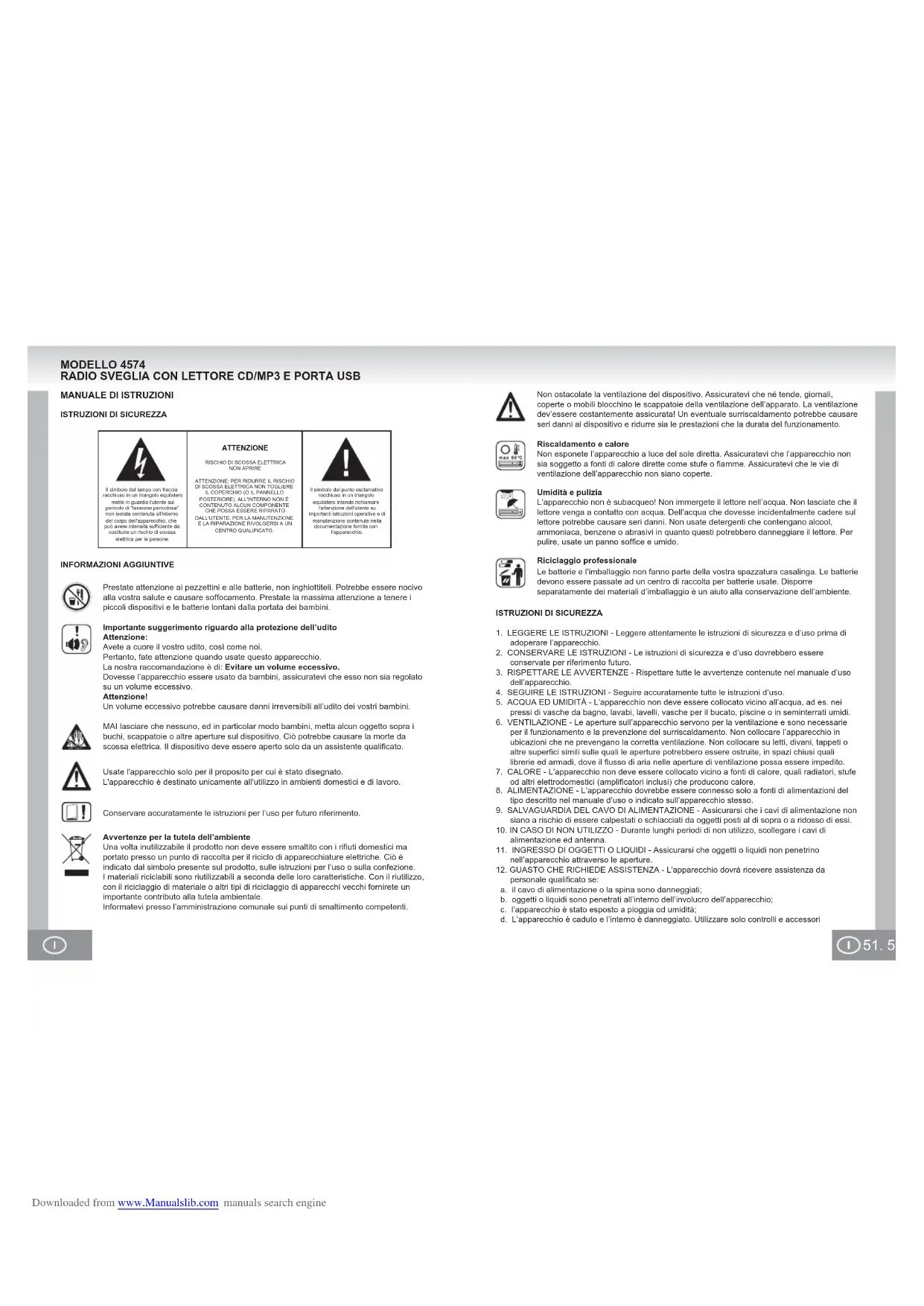 Frekvenciatartomány: UKW (FM) 87,5MHz -108MHz MW (AM) 525kHz - 1615kHz Hangszórók: 2,25 hüvelyk, 8Ω Áramellátás: AC 230V ~ w50Hz Óra memóriájának megőrzése: 1 x DC 9 V elem (F22 / E-Block) Az elem élettartama: kb. 9 óra (az óra és az ébresztő) Méretek: kb. 208,6 x 164,5 x 103,6 mm Súly: kb. 1,2 kg (elem nélkül) Előzetes bejelentés nélkül változhatnak. A KÖZÉPTŐL A SZÉLE FELÉ HELYES HELYTELEN Downloaded from www.Manualslib.com manuals search engine51. 50. Il simbolo del lampo con freccia racchiuso in un triangolo equilatero mette in guardia l'utente sul pericolo di "tensione pericolosa" non isolata contenuta all'interno del corpo dell'apparecchio, che può avere intensità sufficiente da costituire un rischio di scossa elettrica per le persone.Il simbolo del punto esclamativo racchiuso in un triangolo equilatero intende richiamare l'attenzione dell'utente su importanti istruzioni operative e di manutenzione contenute nella documentazione fornita con l'apparecchio.ATTENZIONERISCHIO DI SCOSSA ELETTRICA NON APRIREATTENZIONE: PER RIDURRE IL RISCHIO DI SCOSSA ELETTRICA NON TOGLIERE IL COPERCHIO (O IL PANNELLO POSTERIORE). ALL'INTERNO NON È CONTENUTO ALCUN COMPONENTE CHE POSSA ESSERE RIPARATO DALL'UTENTE. PER LA MANUTENZIONE E LA RIPARAZIONE RIVOLGERSI A UN CENTRO QUALIFICATO. MODELLO 4574 RADIO SVEGLIA CON LETTORE CD/MP3 E PORTA USB Usate l'apparecchio solo per il proposito per cui è stato disegnato.L'apparecchio è destinato unicamente all'utilizzo in ambienti domestici e di lavoro.Conservare accuratamente le istruzioni per l’uso per futuro riferimento.Avvertenze per la tutela dell’ambienteUna volta inutilizzabile il prodotto non deve essere smaltito con i rifiuti domestici ma portato presso un punto di raccolta per il riciclo di apparecchiature elettriche. Ciò è indicato dal simbolo presente sul prodotto, sulle istruzioni per l’uso o sulla confezione. I materiali riciclabili sono riutilizzabili a seconda delle loro caratteristiche. Con il riutilizzo, con il riciclaggio di materiale o altri tipi di riciclaggio di apparecchi vecchi fornirete un importante contributo alla tutela ambientale.Informatevi presso l’amministrazione comunale sui punti di smaltimento competenti.MAI lasciare che nessuno, ed in particolar modo bambini, metta alcun oggetto sopra i buchi, scappatoie o altre aperture sul dispositivo. Ciò potrebbe causare la morte da scossa elettrica. Il dispositivo deve essere aperto solo da un assistente qualificato.Prestate attenzione ai pezzettini e alle batterie, non inghiottiteli. Potrebbe essere nocivo alla vostra salute e causare soffocamento. Prestate la massima attenzione a tenere i piccoli dispositivi e le batterie lontani dalla portata dei bambini.Importante suggerimento riguardo alla protezione dell’uditoAttenzione:Avete a cuore il vostro udito, così come noi.Pertanto, fate attenzione quando usate questo apparecchio.La nostra raccomandazione è di: Evitare un volume eccessivo.Dovesse l’apparecchio essere usato da bambini, assicuratevi che esso non sia regolato su un volume eccessivo.Attenzione!Un volume eccessivo potrebbe causare danni irreversibili all’udito dei vostri bambini.MANUALE DI ISTRUZIONIISTRUZIONI DI SICUREZZAINFORMAZIONI AGGIUNTIVEISTRUZIONI DI SICUREZZA1. LEGGERE LE ISTRUZIONI - Leggere attentamente le istruzioni di sicurezza e d’uso prima di adoperare l’apparecchio.2. CONSERVARE LE ISTRUZIONI - Le istruzioni di sicurezza e d’uso dovrebbero essere conservate per riferimento futuro.3. RISPETTARE LE AVVERTENZE - Rispettare tutte le avvertenze contenute nel manuale d’uso dell’apparecchio.4. SEGUIRE LE ISTRUZIONI - Seguire accuratamente tutte le istruzioni d’uso.5. ACQUA ED UMIDITÀ - L’apparecchio non deve essere collocato vicino all’acqua, ad es. nei pressi di vasche da bagno, lavabi, lavelli, vasche per il bucato, piscine o in seminterrati umidi.6. VENTILAZIONE - Le aperture sull’apparecchio servono per la ventilazione e sono necessarie per il funzionamento e la prevenzione del surriscaldamento. Non collocare l’apparecchio in ubicazioni che ne prevengano la corretta ventilazione. Non collocare su letti, divani, tappeti o altre superfici simili sulle quali le aperture potrebbero essere ostruite, in spazi chiusi quali librerie ed armadi, dove il flusso di aria nelle aperture di ventilazione possa essere impedito.7. CALORE - L’apparecchio non deve essere collocato vicino a fonti di calore, quali radiatori, stufe od altri elettrodomestici (amplificatori inclusi) che producono calore.8. ALIMENTAZIONE - L’apparecchio dovrebbe essere connesso solo a fonti di alimentazioni del tipo descritto nel manuale d’uso o indicato sull’apparecchio stesso.9. SALVAGUARDIA DEL CAVO DI ALIMENTAZIONE - Assicurarsi che i cavi di alimentazione non siano a rischio di essere calpestati o schiacciati da oggetti posti al di sopra o a ridosso di essi.10. IN CASO DI NON UTILIZZO - Durante lunghi periodi di non utilizzo, scollegare i cavi di alimentazione ed antenna.11. INGRESSO DI OGGETTI O LIQUIDI - Assicurarsi che oggetti o liquidi non penetrino nell’apparecchio attraverso le aperture.12. GUASTO CHE RICHIEDE ASSISTENZA - L'apparecchio dovrà ricevere assistenza da personale qualificato se: a. il cavo di alimentazione o la spina sono danneggiati; b. oggetti o liquidi sono penetrati all’interno dell’involucro dell’apparecchio; c. l’apparecchio è stato esposto a pioggia od umidità; d. L’apparecchio è caduto e l’interno è danneggiato. Utilizzare solo controlli e accessori Non ostacolate la ventilazione del dispositivo. Assicuratevi che né tende, giornali, coperte o mobili blocchino le scappatoie della ventilazione dell’apparato. La ventilazione dev’essere costantemente assicurata! Un eventuale surriscaldamento potrebbe causare seri danni al dispositivo e ridurre sia le prestazioni che la durata del funzionamento.Riscaldamento e caloreNon esponete l’apparecchio a luce del sole diretta. Assicurat