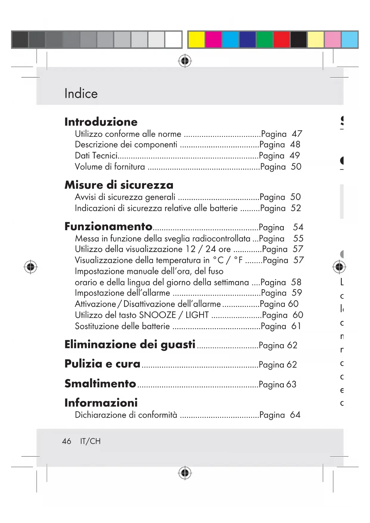 s46 IT/CH Introduzione Utilizzo conforme alle norme ...................................Pagina 47 Descrizione dei componenti ....................................Pagina 48 Dati Tecnici................................................................Pagina 49 Volume di fornitura ...................................................Pagina 50 Misure di sicurezza Avvisi di sicurezza generali .....................................Pagina 50 Indicazioni di sicurezza relative alle batterie .........Pagina 52 Funzionamento................................................Pagina 54 Messa in funzione della sveglia radiocontrollata ...Pagina 55 Utilizzo della visualizzazione 12 / 24 ore .............Pagina 57 Visualizzazione della temperatura in °C / °F ........Pagina 57 Impostazione manuale dell‘ora, del fuso orario e della lingua del giorno della settimana ....Pagina 58 Impostazione dell’allarme ........................................Pagina 59 Attivazione / Disattivazione dell’allarme .................Pagina 60 Utilizzo del tasto SNOOZE / LIGHT .......................Pagina 60 Sostituzione delle batterie ........................................Pagina 61 Eliminazione dei guasti ............................Pagina 62 Pulizia e cura .....................................................Pagina 62 Smaltimento .......................................................Pagina 63 Informazioni Dichiarazione di conformità ....................................Pagina 64