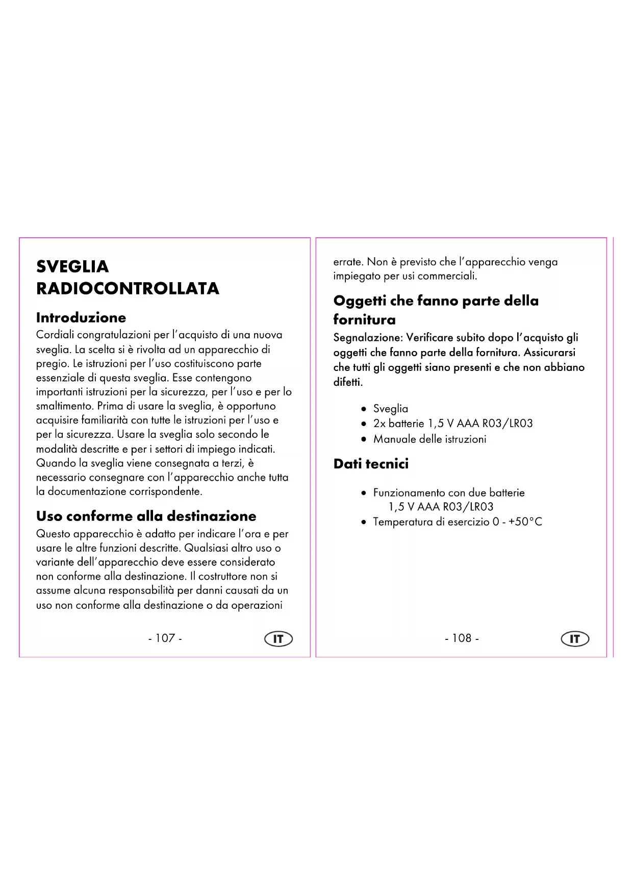 SVEGLIA RADIOCONTROLLATA Introduzione Cordiali congratulazioni per l’acquisto di una nuova sveglia. La scelta si è rivolta ad un apparecchio di pregio. Le istruzioni per l’uso costituiscono parte essenziale di questa sveglia. Esse contengono importanti istruzioni per la sicurezza, per l’uso e per lo smaltimento. Prima di usare la sveglia, è opportuno acquisire familiarità con tutte le istruzioni per l’uso e per la sicurezza. Usare la sveglia solo secondo le modalità descritte e per i settori di impiego indicati. Quando la sveglia viene consegnata a terzi, è necessario consegnare con l’apparecchio anche tutta la documentazione corrispondente. Uso conforme alla destinazione Questo apparecchio è adatto per indicare l’ora e per usare le altre funzioni descritte. Qualsiasi altro uso o variante dell’apparecchio deve essere considerato non conforme alla destinazione. Il costruttore non si assume alcuna responsabilità per danni causati da un uso non conforme alla destinazione o da operazioni