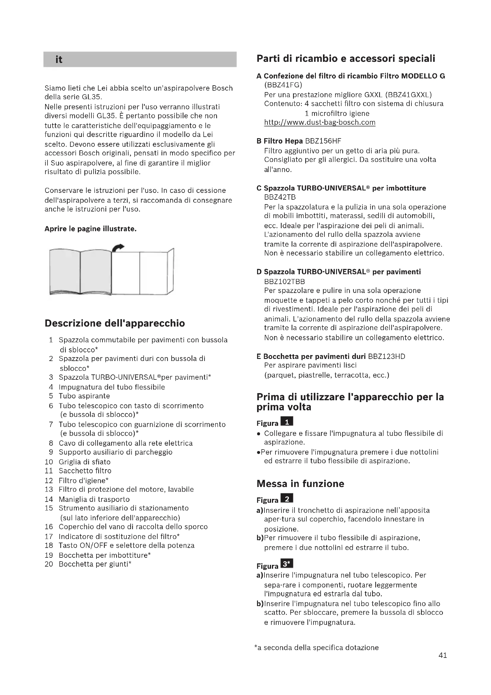 ella serie GL35. Nelle presenti istruzioni per l'uso verranno illustrati diversi modelli GL35. È pertanto possibile che non tutte le caratteristiche dell'equipaggiamento e le funzioni qui descritte riguardino il modello da Lei scelto. Devono essere utilizzati esclusivamente gli accessori Bosch originali, pensati in modo specifico per il Suo aspirapolvere, al fine di garantire il miglior risultato di pulizia possibile. Conservare le istruzioni per l'uso. In caso di cessione dell'aspirapolvere a terzi, si raccomanda di consegnare anche le istruzioni per l'uso. Aprire le pagine illustrate. Descrizione dell'apparecchio 1 Spazzola commutabile per pavimenti con bussola di sblocco* 2 Spazzola per pavimenti duri con bussola di sblocco* 3 Spazzola TURBO-UNIVERSAL®per pavimenti* 4 Impugnatura del tubo flessibile 5 Tubo aspirante 6 Tubo telescopico con tasto di scorrimento (e bussola di sblocco)* 7 Tubo telescopico con guarnizione di scorrimento (e bussola di sblocco)* 8 Cavo di collegamento alla rete elettrica 9 Supporto ausiliario di parcheggio 10 Griglia di sfiato 11 Sacchetto filtro 12 Filtro d'igiene* 13 Filtro di protezione del motore, lavabile 14 Maniglia di trasporto 15 Strumento ausiliario di stazionamento (sul lato inferiore dell'apparecchio) 16 Coperchio del vano di raccolta dello sporco 17 Indicatore di sostituzione del filtro* 18 Tasto ON/OFF e selettore della potenza 19 Bocchetta per imbottiture* 20 Bocchetta per giunti* Parti di ricambio e accessori speciali A Confezione del filtro di ricambio Filtro MODELLO G (BBZ41FG) Per una prestazione migliore GXXL (BBZ41GXXL) Contenuto: 4 sacchetti filtro con sistema di chiusura