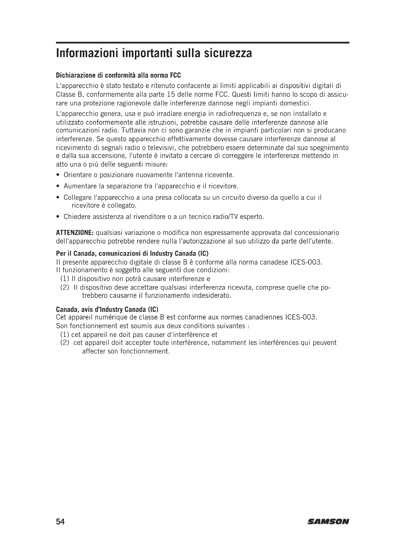 - Chiedere assistenza al rivenditore o a un tecnico radio/TV esperto. ATTENZIONE: qualsiasi variazione o modifica non espressamente approvata dal concessionario dell'apparecchio potrebbe rendere nulla l'autorizzazione al suo utilizzo da parte dell'utente. Per il Canada, comunicazioni di Industry Canada (IC) Il presente apparecchio digitale di classe B è conforme alla norma canadese ICES-003. Il funzionamento è soggetto alle seguenti due condizioni: (1) Il dispositivo non potrà causare interferenze e (2) Il dispositivo deve accettare qualsiasi interferenza ricevuta, comprese quelle che po- trebbero causarne il funzionamento indesiderato. Canada, avis d’Industry Canada (IC) Cet appareil numérique de classe B est conforme aux normes canadiennes ICES-003. Son fonctionnement est soumis aux deux conditions suivantes : (1) cet appareil ne doit pas causer d’interférence et (2) cet appareil doit accepter toute interférence, notamment les interférences qui peuvent affecter son fonctionnement. 54ENGLISH