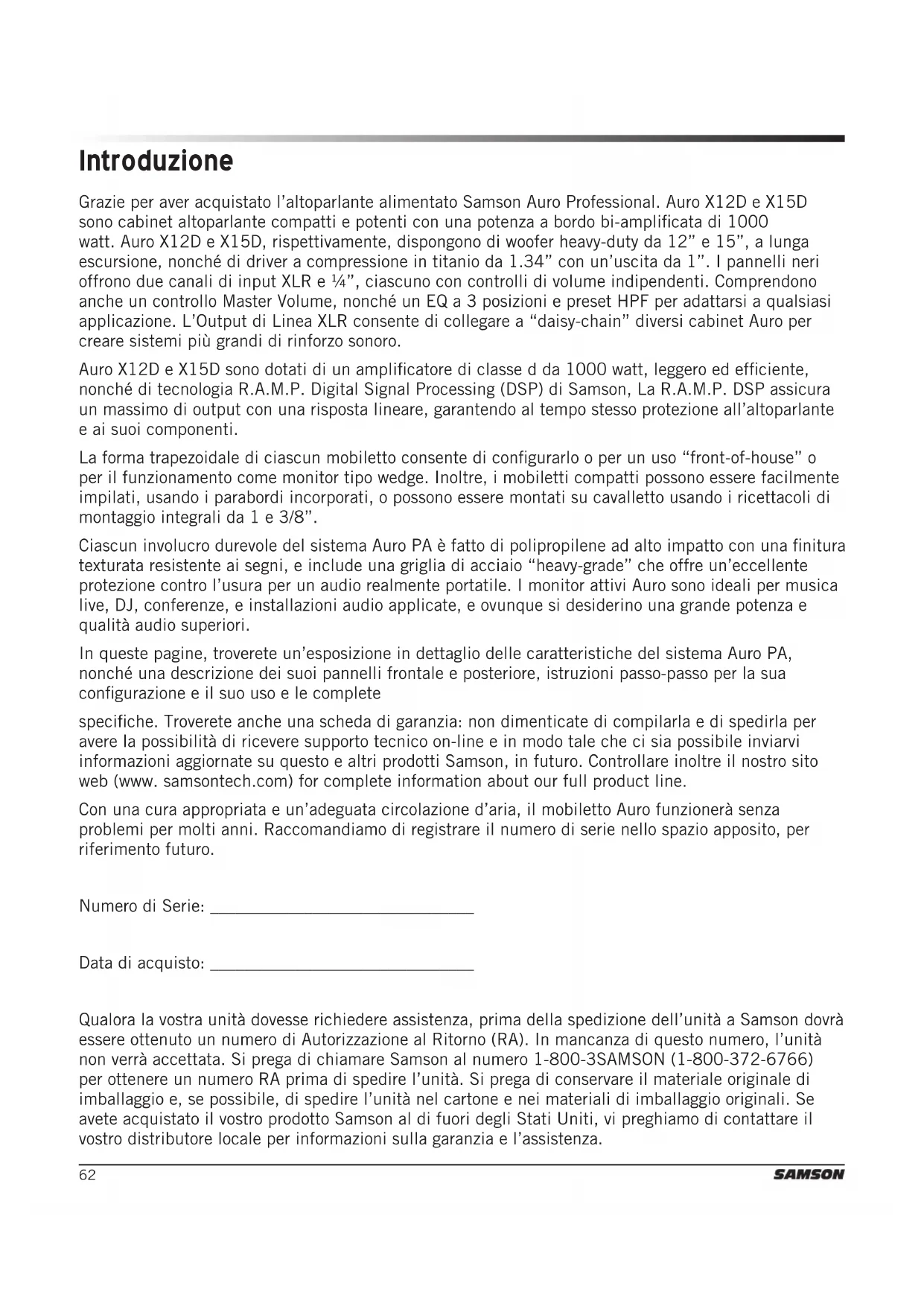 Qualora la vostra unità dovesse richiedere assistenza, prima della spedizione dell'unità a Samson dovrà essere ottenuto un numero di Autorizzazione al Ritorno (RA). In mancanza di questo numero, l'unità non verrà accettata. Si prega di chiamare Samson al numero 1-800-3SAMSON (1-800-372-6766) per ottenere un numero RA prima di spedire l'unità. Si prega di conservare il materiale originale di imballaggio e, se possibile, di spedire l'unità nel cartone e nei materiali di imballaggio originali. Se avete acquistato il vostro prodotto Samson al di fuori degli Stati Uniti, vi preghiamo di contattare il vostro distributore locale per informazioni sulla garanzia e l'assistenza.