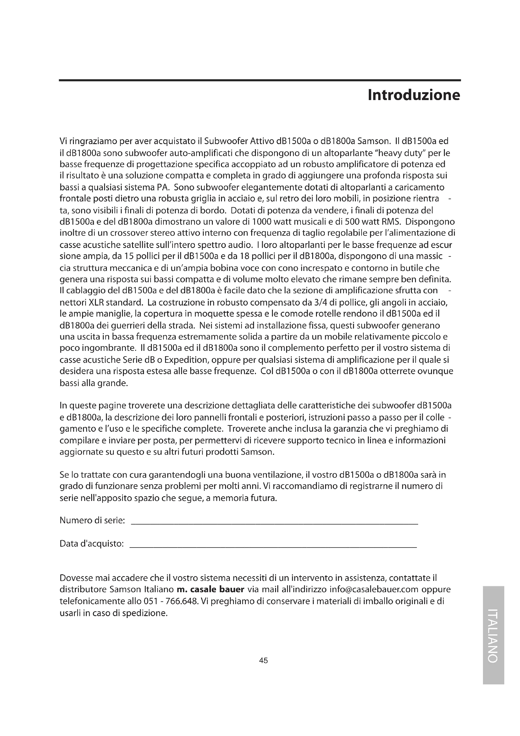 In queste pagine troverete una descrizione dettagliata delle caratteristiche dei subwoofer dB1500a e dB1800a, la descrizione dei loro pannelli frontali e posteriori, istruzioni passo a passo per il colle - gamento e l'uso e le specifiche complete. Troverete anche inclusa la garanzia che vi preghiamo di compilare e inviare per posta, per permettervi di ricevere supporto tecnico in linea e informazioni aggiornate su questo e su altri futuri prodotti Samson.