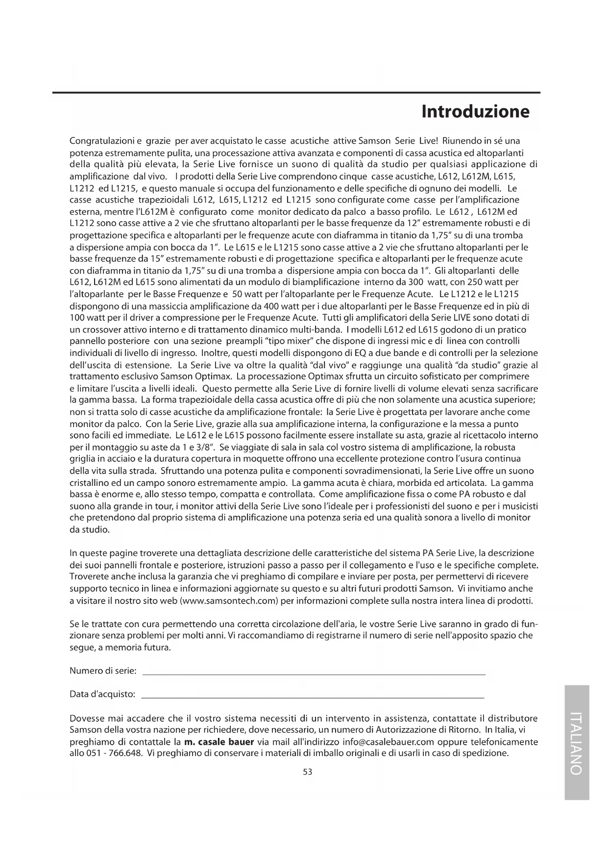 In queste pagine troverete una dettagliata descrizione delle caratteristiche delsystema PA Serie Live, la descrizione dei loro pannelli frontale e posteriori, istruzioni passo a passo per il collegamento e l'uso e le specifiche complete. Trovereteanche inclusa la garanzia che vi preghiamo di compilare e inviare per posta, per permeftervi di ricevere supporto tecnico in linea e informazioni aggiornate su quello e su altri futuri prodotti Samson. Vi invitiamo anche a visitare il nostro site web (www.samsontech.com) per informazioni complete sulla notre alla linea di prodotti.