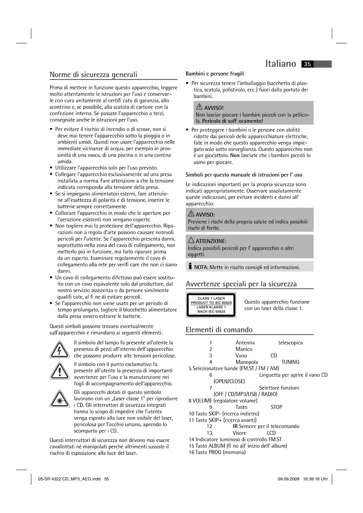 - Per proteggere i bambini o le persone con abilità ridotte dai pericoli delle apparecchiature elettriche, fate in modo che questo apparecchio venga impie- gato solo sotto sorveglianza. Questo apparecchio non è un giocattolo. Non lasciate che i bambini piccoli lo usino per giocare. Simboli per questo manuale di istruzioni per l’ uso Le indicazioni importanti per la propria sicurezza sono indicati appropriatamente. Osservare assolutamente queste indicazioni, per evitare incidenti e danni all’ apparecchio: AVVISO: Previene i rischi della propria salute ed indica possibili rischi di ferite. ATTENZIONE: Indica possibili pericoli per l’ apparecchio o altri oggetti. NOTA: Mette in risalto consigli ed informazioni. Avvertenze speciali per la sicurezza Questo apparecchio funzione con un laser della classe 1. Elementi di comando 1 Antenna telescopica 2 Manico 3 Vano CD 4 Manopola TUNING 5 Selezionatore bande (FM.ST / FM / AM) 6 Linguetta per aprire il vano CD (OPEN/CLOSE) 7 Selettore funzioni (OFF / CD/MP3/USB / RADIO) 8 VOLUME (regolatore volume) 9 Tasto STOP 10 Tasto SKIP- (ricerca indietro) 11 Tasto SKIP+ (ricerca avanti) 12 IR Sensore per il telecomando 13 Visore LCD 14 Indicatore luminoso di controllo FM.ST 15 Tasto ALBUM ( no all’ inizio dell’ album) 16 Tasto PROG (memoria) 05-SR 4322 CD_MP3_AEG.indd 3505-SR 4322 CD_MP3_AEG.indd 35 09.09.2008 16:39:16 Uhr09.09.2008 16:39:16 Uhr .Italiano
