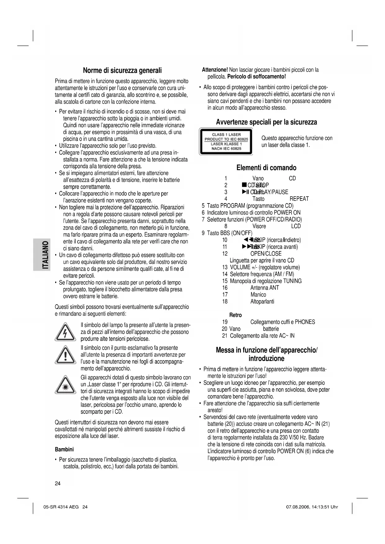 - Le macchie esterne si possono pulire con un panno umido, senza aggiunta di altre sostanze. Dati tecnici Modello: ................................................................. SR 4314 CD Alimentazione rete:................................................ 230 V, 50 Hz Consumo di energia: ..........................................................14 W Funzionamento batterie:.....................6 x 1,5 V, tipo UM2/LR 14 Potenza d‘uscita:...................................................... 60 W PMPO Classe di protezione:............................................................... ΙΙ Componente della radio: Gamma di frequenza: ................UKW / FM 87,5 ~ 108 MHz .................MW / AM 525 ~ 1615 kHz Questo apparecchio è stato controllato sulla base di tutte le direttive CE attuali in vigore in questo settore, quali per esempio la normativa in materia di compatibilità elettromagnetica e la direttiva in materia di bassa tensione, ed è stato costruito conformemente alle norme di sicurezza più moderne. Con riserva di apportare modifi che tecniche. Garanzia Per l’apparecchio da noi messo in commercio ci assumiamo una garanzia di 24 mesi dalla data di acquisto (scontrino). Durante la garanzia noi ci impegniamo ad eliminare gratuita- mente i guasti dell’apparecchio o degli accessori, dovuti a difetti di materiale o di fabbricazione, riparandoli o, a nostra discrezio- ne, sostituendoli. Le prestazioni in garanzia danno luogo a una proroga della garanzia né danno diritto ad una nuova garanzia! Per la garanzia è suffi ciente lo scontrino di acquisto. Senza questo scontrino non sussiste il diritto né ad una sostituzione né ad una riparazione gratuita. Nel caso si ricorra alla garanzia, restituire al rivenditore l’apparecchio completo in ogni sua parte, nell’imballaggio originale unitamente allo scontrino. La riparazione di pezzi d’uso ovvero soggetti a logoramento come anche operazioni di pulizia e manutenzione o la sostituzio- ne di pezzi soggetti a logoramento non rientrano nella garanzia e quindi sono a pagamento! La garanzia si annulla nel caso di intervento da parte di terzi. Dopo la garanzia Al termine della garanzia le riparazioni possono essere eseguite dietro pagamento dal corrispettivo negozio specializzato o servizio riparazioni. 05-SR 4314 AEG 26 07.08.2006, 14:13:56 UhrITALIANO