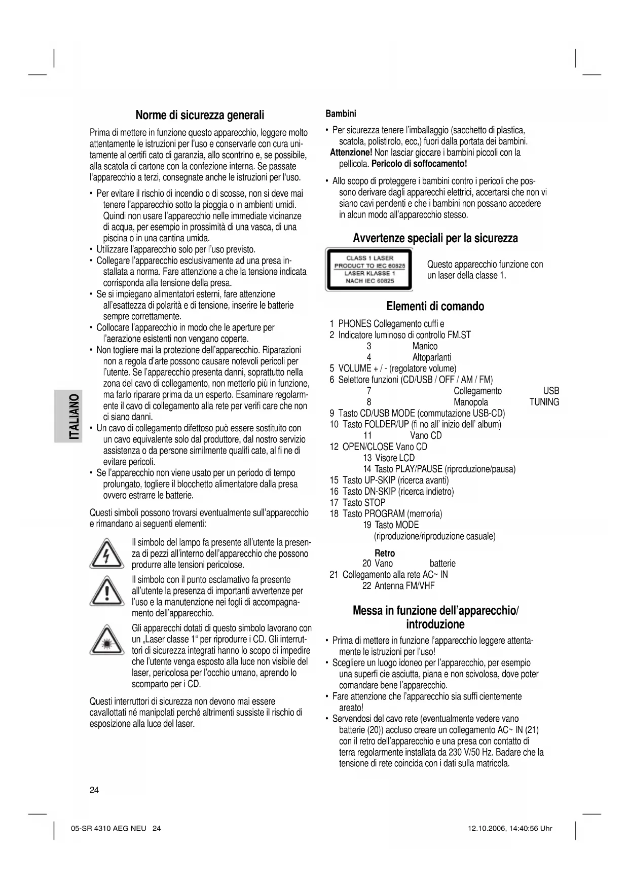 - Servendosi del cavo rete (eventualmente vedere vano batterie (20)) accluso creare un collegamento AC~ IN (21) con il retro dell’apparecchio e una presa con contatto di terra regolarmente installata da 230 V/50 Hz. Badare che la tensione di rete coincida con i dati sulla matricola. 05-SR 4310 AEG NEU 24 12.10.2006, 14:40:56 UhrITALIANO
