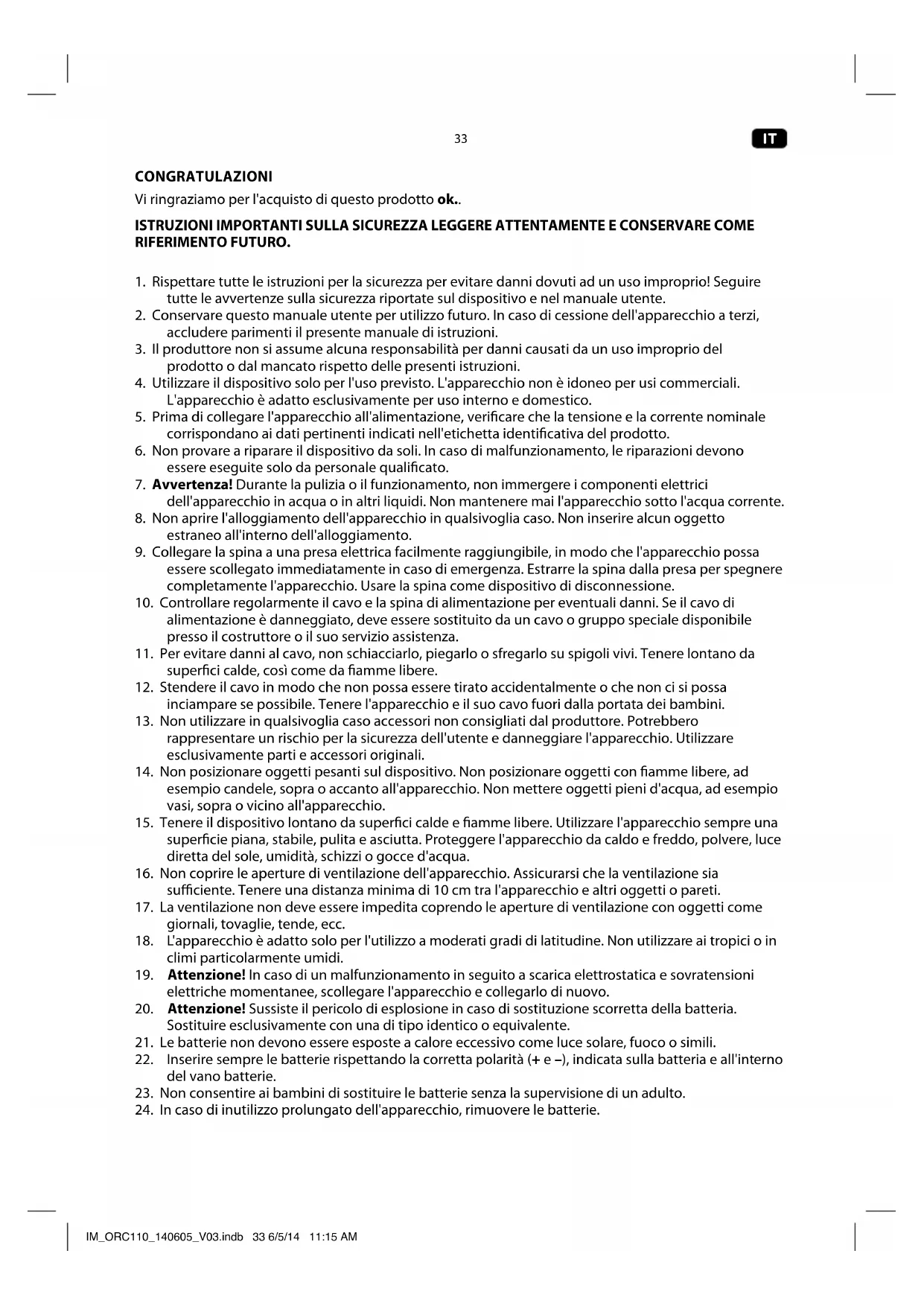 SMALTIMENTO Il logo con il cassonetto barrato indica l'obbligo di smaltimento separato dei riuti di apparecchiature elettriche ed elettroniche (RAEE). Apparecchiature elettriche ed elettroniche potrebbero contenere sostanza pericolose e rischiose. Non smaltire questo apparecchio come riuto urbano indierenziato. Riconsegnare il prodotto presso un punto di raccolta autorizzato per il riciclo RAEE. Facendo ciò, si aiuterà a conservare le risorse e proteggere l'ambiente. Contattare il proprio rivenditore o le autorità locali per maggiori informazioni. IM_ORC110_140605_V03.indb 37 6/5/14 11:15 AM38