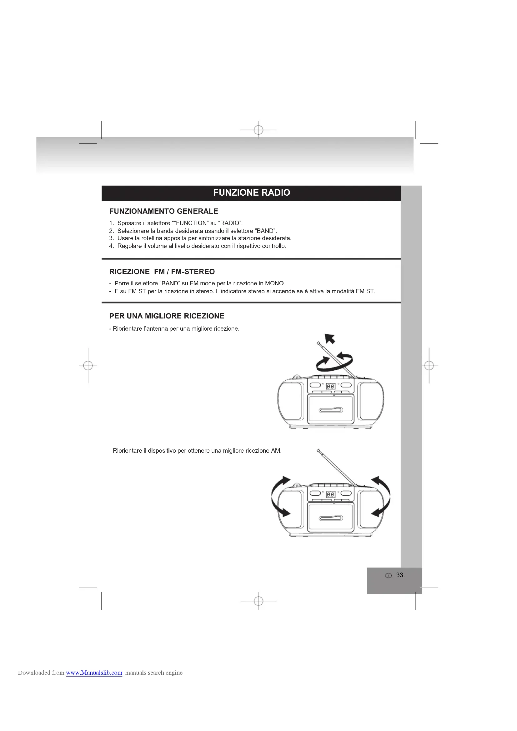 - Porre il selettore “BAND” su FM mode per la ricezione in MONO.- E su FM ST per la ricezione in stereo. L’indicatore stereo si accende se è attiva la modalità FM ST.1. Sposatre il selettore ““FUNCTION” su “RADIO”.2. Selezionare la banda desiderata usando il selettore “BAND”.3. Usare la rotellina apposita per sintonizzare la stazione desiderata.4. Regolare il volume al livello desiderato con il rispettivo controllo.- Riorientare l’antenna per una migliore ricezione.- Riorientare il dispositivo per ottenere una migliore ricezione AM. Downloaded from www.Manualslib.com manuals search engine34. FUNZIONAMENTO PLAYER FUNZIONAMENTO GENERALE 1. Porre su “FUNCTION” il selettore sulla modalità “TAPE”.2. Premere il tasto “STOP / EJECT” per aprire lo sportellino ed inserire la cassetta.3. Chiudere lo sportellino.4. Premere il tasto “PLAY” per iniziare la riproduzione.5. Regolare il volume al livello desiderato con il rispettivo controllo.6. Premere il tasto “PAUSE” ancora quando si vuole fermare la riproduzione temporaneamente.7. Premere il tasto “STOP / EJECT” quando si finisce.PLAY Premere per iniziare la riproduzione.PAUSE Premere il tasto “PAUSE”ancora quando si vuole fermare la riproduzione temporaneamente. Premere di nuovo per riprendere la riproduzione.STOP / EJECT Premere per fermare tutte le operazioni in atto. Premere di nuovo per aprire lo sportellino dopo aver fermato la. FAST FORWARD Premere per far scorrere velocemente il nastro in avanti.REWIND Premere per far scorrere velocemente il nastro indietro.RECORD/PLAY / Premere insieme a “PLAY” per iniziare la registrazione. / Premere per iniziare la riproduzione. RIPRODUZIONE 1. Premere “STOP / EJECT” per aprire lo sportellino ed inserire una cassetta vergine.2. Selezionare da quale fonte si vuole registrare. Per registrare dalla radio – porre “FUNCTION” su “RADIO” e sintonizzare la stazione desiderata. Per registrare da CD / MP3 – porre un disco sul piatto. porre “FUNCTION” su “CD / MP3” e selezionare la traccia desiderata.3. Premere insieme i tasti “RECORD” e “PLAY” per cominciare la registrazione.4. Premere “STOP / EJECT” quando si finisce. REGISTRAZIONE FUNZIONAMENTO CD OPERAZIONIGENRALI PLAY / PAUSE Premere per riprodurre un disco CD.Premere ancora per fermare la riproduzione di un disco CD.Premere ancora per riprenderne la riproduzione.SKIP + & Premere per andare alla prossima o alla precedente traccia.SKIP - Premere e tenere premuto finché si trova il punto della canzone voluto.STOP Premere per terminare le operazioni USB / SD. Downloaded from www.Manualslib.com manuals search engine35. RIPRODUZIONE 1. Porre su “FUNCTION” il selettore sulla modalità “TAPE”.2. Aprire la porta del CD e mettere un disco CD con l’etichetta all’insù nel vano CD.3. Chiudere lo sportellino.4. Quando il disco è all’interno inizia la ricerca delle info sul disco. Apparirà il numero totale delle tracce sul display.5. Premere il tasto “PLAY / PAUSE” per iniziare la riproduzione.6. Regolare il volume al livello desiderato con il rispettivo controllo.7. Premere il tasto “PLAY / PAUSE”ancora quando si vuole fermare la riproduzione temporaneamente.8. Premere il tasto “STOP” quando si finisce. FUNZIONE CD PROGRAMMA Premere il tasto “REPEAT” prima o durante la riproduzione audio CD, una traccia o tutte le tracce saranno ripetute. premendo la funzione mode cambia da:1 - RIPETI 1 ( L’indicatore lampeggia)2 - RIPETI TUTTO ( L’indicatore è acceso fisso)3 - RIPRODUZIONE NORMALESi possono programmare fino a 20 tracce in qualsiasi ordine.Premere “STOP” prima di cominciare.1. Premere il tasto “PROGRAM”, il display mostrerà “P01” e lampeggerà.2. Selezionare la traccia desiderata usando il tasto “SKIP-. ( Si può scegliere un album premendo “ALBUM UP”).3. Premere “Program” di nuovo, per confermare la traccia nella memoria del programma.4. Ripetere i passi 2 e 3 per inserire tracce addizionali nella memoria del programma.5. Quando tutte le tracce sono state programmate Premere “PLAY / PAUSE” per ottenere la riproduzione come da programma. Lampeggerà la spia.6. Premere due volte “STOP” per terminare la riproduzione del programma, e la spia si spegnerà.