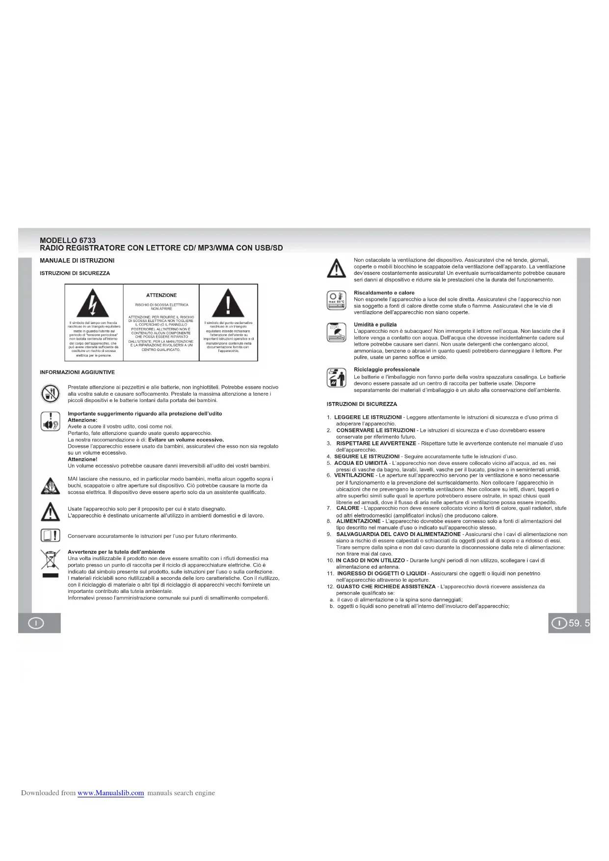 Általános tudnivalók Áramellátás: 230 V ~ 50 Hz váltakozóáram 12V egyenáram (6 LR14 / UM-2 / C, 1,5V típusú elem) (Az elemek nincsenek mellékelve) Frekvenciatartomány: AM (MW) 525 - 1615 kHz FM (UKW) 87,5 - 108 MHz Audio Hangszóró impedanciája: 8 Ohm Méretek: kb. 290 x 275 x 380 mm Súly: kb. 2 kg ELŐZETES BEJELENTÉS NÉLKÜL VÁLTOZHATNAK. Downloaded from www.Manualslib.com manuals search engine59. 58. Il simbolo del lampo con freccia racchiuso in un triangolo equilatero mette in guardia l'utente sul pericolo di "tensione pericolosa" non isolata contenuta all'interno del corpo dell'apparecchio, che può avere intensità sufficiente da costituire un rischio di scossa elettrica per le persone.Il simbolo del punto esclamativo racchiuso in un triangolo equilatero intende richiamare l'attenzione dell'utente su importanti istruzioni operative e di manutenzione contenute nella documentazione fornita con l'apparecchio.ATTENZIONERISCHIO DI SCOSSA ELETTRICA NON APRIREATTENZIONE: PER RIDURRE IL RISCHIO DI SCOSSA ELETTRICA NON TOGLIERE IL COPERCHIO (O IL PANNELLO POSTERIORE). ALL'INTERNO NON È CONTENUTO ALCUN COMPONENTE CHE POSSA ESSERE RIPARATO DALL'UTENTE. PER LA MANUTENZIONE E LA RIPARAZIONE RIVOLGERSI A UN CENTRO QUALIFICATO. MODELLO 6733 RADIO REGISTRATORE CON LETTORE CD/ MP3/WMA CON USB/SD Usate l'apparecchio solo per il proposito per cui è stato disegnato.L'apparecchio è destinato unicamente all'utilizzo in ambienti domestici e di lavoro.Conservare accuratamente le istruzioni per l’uso per futuro riferimento.Avvertenze per la tutela dell’ambienteUna volta inutilizzabile il prodotto non deve essere smaltito con i rifiuti domestici ma portato presso un punto di raccolta per il riciclo di apparecchiature elettriche. Ciò è indicato dal simbolo presente sul prodotto, sulle istruzioni per l’uso o sulla confezione. I materiali riciclabili sono riutilizzabili a seconda delle loro caratteristiche. Con il riutilizzo, con il riciclaggio di materiale o altri tipi di riciclaggio di apparecchi vecchi fornirete un importante contributo alla tutela ambientale.Informatevi presso l’amministrazione comunale sui punti di smaltimento competenti.MAI lasciare che nessuno, ed in particolar modo bambini, metta alcun oggetto sopra i buchi, scappatoie o altre aperture sul dispositivo. Ciò potrebbe causare la morte da scossa elettrica. Il dispositivo deve essere aperto solo da un assistente qualificato.Prestate attenzione ai pezzettini e alle batterie, non inghiottiteli. Potrebbe essere nocivo alla vostra salute e causare soffocamento. Prestate la massima attenzione a tenere i piccoli dispositivi e le batterie lontani dalla portata dei bambini.Importante suggerimento riguardo alla protezione dell’uditoAttenzione:Avete a cuore il vostro udito, così come noi.Pertanto, fate attenzione quando usate questo apparecchio.La nostra raccomandazione è di: Evitare un volume eccessivo.Dovesse l’apparecchio essere usato da bambini, assicuratevi che esso non sia regolato su un volume eccessivo.Attenzione!Un volume eccessivo potrebbe causare danni irreversibili all’udito dei vostri bambini.MANUALE DI ISTRUZIONIISTRUZIONI DI SICUREZZAINFORMAZIONI AGGIUNTIVEISTRUZIONI DI SICUREZZA1. LEGGERE LE ISTRUZIONI - Leggere attentamente le istruzioni di sicurezza e d’uso prima di adoperare l’apparecchio.