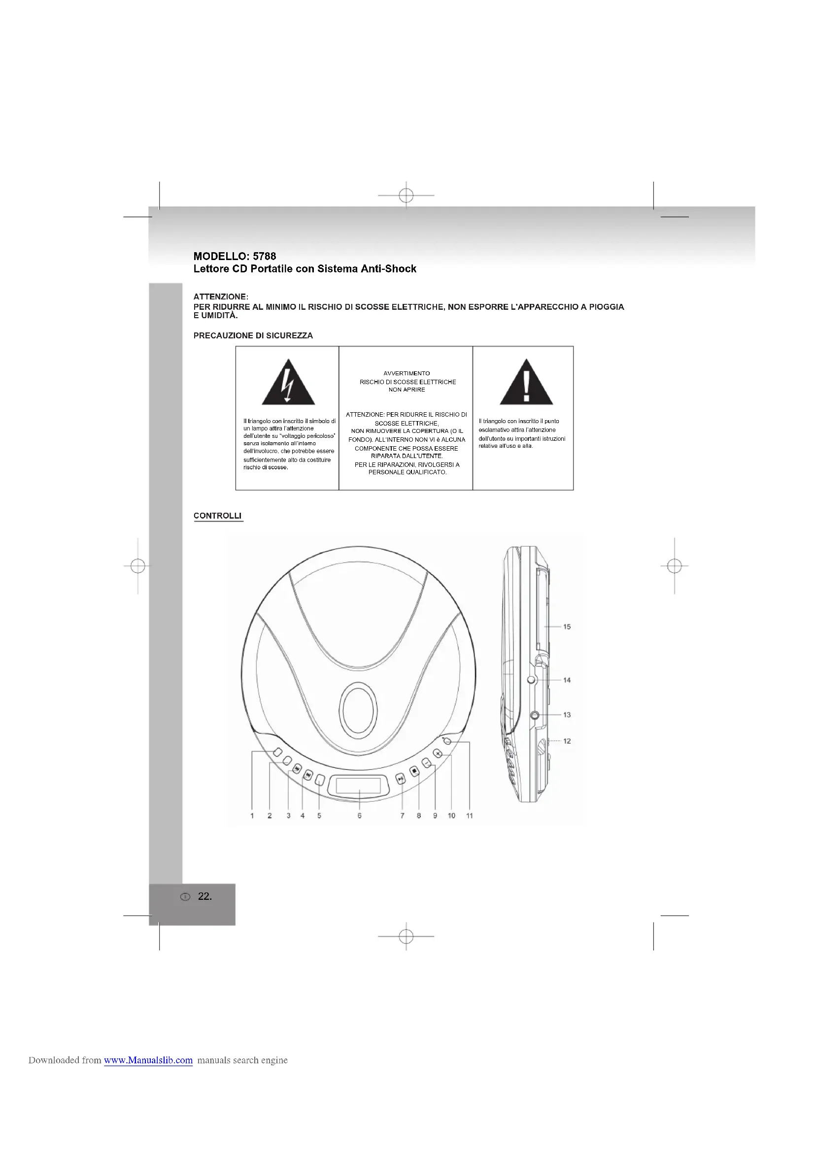 La vostra salute è importante per voi. Assicuratevi che il volume sia impostato in modo che sia impossibile incorrere in danni all’udito. Evitare volume ecessivo. Fare inoltre in modo che il volume sia accettabile quando la lettore è usata da bambini. Non inserire mai oggetti di alcun tipo attraverso le aperture del lettore; essi potrebbero toccare punti in cui è presente alto voltaggio o provocare cortocircuiti che possono risultare in incendi e scosse elettriche. Non versare mai liquidi di alcun genere sul prodotto. Utilizzare solo per gli scopi previsti. Leggere tutte le istruzioni relative alla sicurezza e al funzionamento prima di utilizzare il lettore. Il riciclo dei materiali contribuisce alla preservazione delle risorse naturali. Questo simbolo sul prodotto o sull’imballaggio indica che esso non deve essere trattato come rifiuto domestico. Diversamente, esso va smaltito nel punto di raccolta appropriato per il riciclo delle apparecchiature elettriche ed elettroniche. Smaltendo adeguatamente il prodotto, si assicura che esso non provochi conseguenze negative sull’ambiente e sulla salute delle persone, che potrebbero altrimenti essere causate se il prodotto è gettato nella pattumiera; assicuratevi che sia raccolto separatamente al fine di un adeguato riciclaggio in conformità con le normative locali. Calore Non esporre il lettore a raggi solari diretti o a sorgenti di calore quali radiatori e fuoco. Assicurarsi che i fori di ventilazione non siano bloccati. Il lettore non è impermeabile. Evitare che entri in contatto con acqua. Pulire esclusivamente con un panno leggermente umido. Non usare detergenti che contengano alcol, ammoniaca, benzene o sostanze abrasive. Smaltimento ecologico delle batterie Le batterie non fanno parte dei rifiuti domestici. Diversamente, esse devono essere smaltite nei punti di raccolta di batterie usate. Non gettare mai le batterie nel fuoco. Downloaded from www.Manualslib.com manuals search engine27. Un triángulo con un símbolo de rayo con punta dentro de un triángulo tiene el propósito de alertar al usuario de la presencia de voltaje “peligroso” no aislado dentro de la caja que puede ser de suficiente magnitud para constituir un riesgo de descarga eléctrica a los seres humanos.ADVERTENCIARIESGO DE DESCARGA ELÉCTRICAADVERTENCIA: PARA PREVENIR EL RIESGO DE SUFRIR UNA DESCARGA ELÉCTRICA, NO QUITE LA CUBIERTA. NO HAY PIEZAS A LAS QUE PUEDA DAR SERVICIO DENTRO. REFIERA TODO EL SERVICIO A PERSONALCUALIFICADO.Este signo de exclamación dentro de un triángulo tiene el propósito de alertar al usuario de la existenciade importantes instrucciones de operación y mantenimiento (servicio) en este manual. MODELO: 5788 Reproductor de CD portatil con sistema Anti Golpe CONTROLES ADVERTENCIA: PARA MINIMIZAR EL RIESGO DE ELECTROCUCIÓN, NO EXPONGA LA UNIDAD A LA LLUVIA NI A LA HUMEDAD.