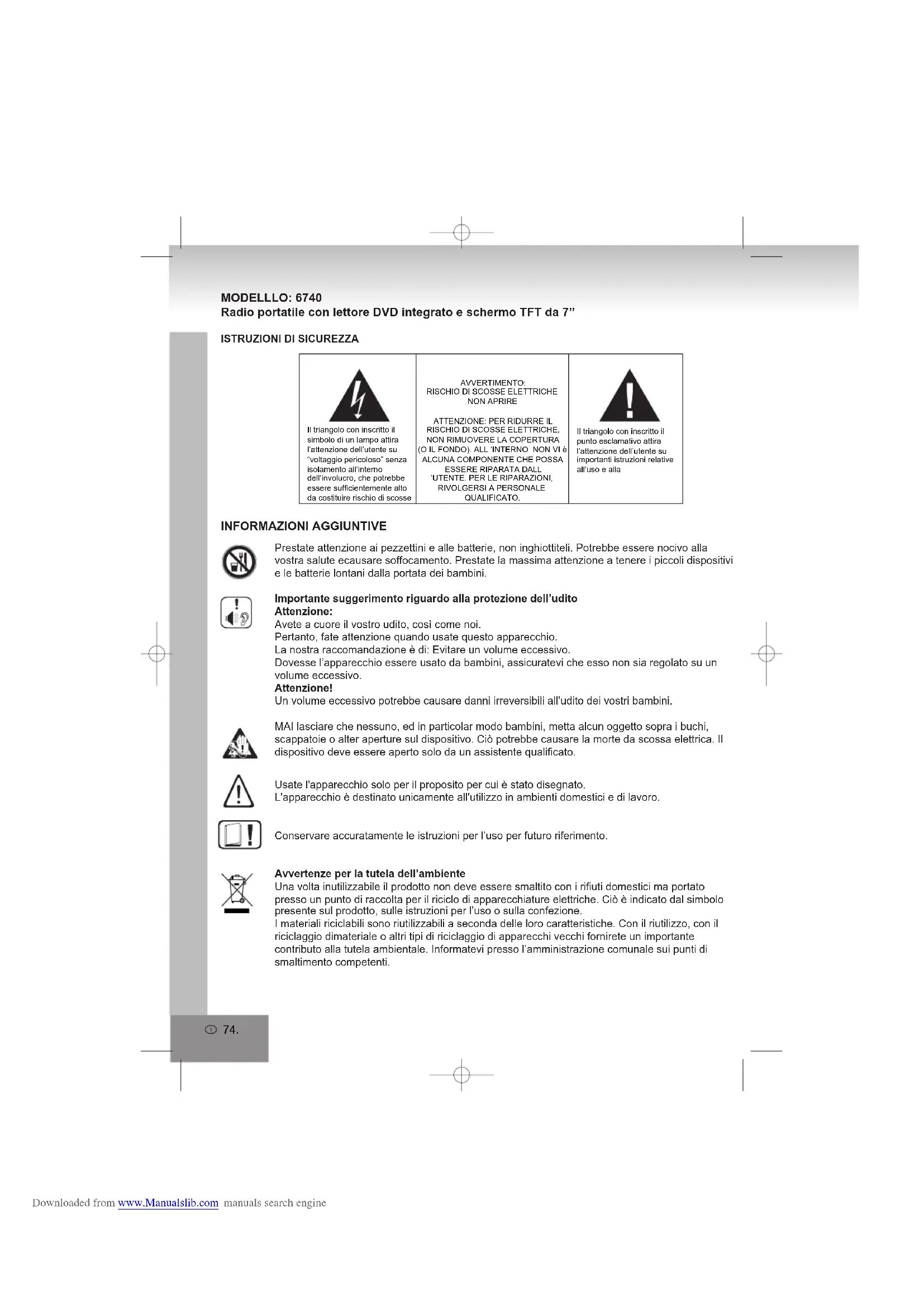 Downloaded from www.Manualslib.com manuals search engine74. MODELLLO: 6740 Radio portatile con lettore DVD integrato e schermo TFT da 7” ISTRUZIONI DI SICUREZZAAVVERTIMENTO:RISCHIO DI SCOSSE ELETTRICHE NON APRIREATTENZIONE: PER RIDURRE IL RISCHIO DI SCOSSE ELETTRICHE, NON RIMUOVERE LA COPERTURA (O IL FONDO). ALL ’INTERNO NON VI è ALCUNA COMPONENTE CHE POSSA ESSERE RIPARATA DALL’UTENTE. PER LE RIPARAZIONI, RIVOLGERSI A PERSONALE QUALIFICATO.Il triangolo con inscritto il punto esclamativo attira l’attenzione dell’utente su importanti istruzioni relative all’uso e alla Il triangolo con inscritto il simbolo di un lampo attira l’attenzione dell’utente su “voltaggio pericoloso” senza isolamento all’interno dell‘involucro, che potrebbe essere sufficientemente alto da costituire rischio di scosse Prestate attenzione ai pezzettini e alle batterie, non inghiottiteli. Potrebbe essere nocivo alla vostra salute ecausare soffocamento. Prestate la massima attenzione a tenere i piccoli dispositivi e le batterie lontani dalla portata dei bambini.Importante suggerimento riguardo alla protezione dell’uditoAttenzione:Avete a cuore il vostro udito, così come noi.Pertanto, fate attenzione quando usate questo apparecchio.La nostra raccomandazione è di: Evitare un volume eccessivo.Dovesse l’apparecchio essere usato da bambini, assicuratevi che esso non sia regolato su un volume eccessivo.Attenzione!Un volume eccessivo potrebbe causare danni irreversibili all’udito dei vostri bambini.MAI lasciare che nessuno, ed in particolar modo bambini, metta alcun oggetto sopra i buchi, scappatoie o alter aperture sul dispositivo. Ciò potrebbe causare la morte da scossa elettrica. Il dispositivo deve essere aperto solo da un assistente qualificato.Usate l'apparecchio solo per il proposito per cui è stato disegnato.L'apparecchio è destinato unicamente all'utilizzo in ambienti domestici e di lavoro.Conservare accuratamente le istruzioni per l’uso per futuro riferimento.Avvertenze per la tutela dell’ambienteUna volta inutilizzabile il prodotto non deve essere smaltito con i rifiuti domestici ma portato presso un punto di raccolta per il riciclo di apparecchiature elettriche. Ciò è indicato dal simbolo presente sul prodotto, sulle istruzioni per l’uso o sulla confezione.I materiali riciclabili sono riutilizzabili a seconda delle loro caratteristiche. Con il riutilizzo, con il riciclaggio dimateriale o altri tipi di riciclaggio di apparecchi vecchi fornirete un importante contributo alla tutela ambientale. Informatevi presso l’amministrazione comunale sui punti di smaltimento competenti. INFORMAZIONI AGGIUNTIVE Downloaded from www.Manualslib.com manuals search engine75. Non ostacolate la ventilazione del dispositivo. Assicuratevi che né tende, giornali, coperte o mobili blocchino le scappatoie della ventilazione dell’apparato. La ventilazione dev’essere costantemente assicurata! Un eventuale surriscaldamento potrebbe causare seri danni al dispositivo e ridurre sia le prestazioni che la durata del funzionamento.Riscaldamento e caloreNon esponete l’apparecchio a luce del sole diretta. Assicuratevi che l’apparecchio non sia soggetto a fonti di calore dirette come stufe o fiamme. Assicuratevi che le vie di ventilazione dell’apparecchio non siano coperte.Umidità e puliziaL’apparecchio non è subacqueo! Non immergete il lettore nell’acqua. Non lasciate che il lettore venga a contatto con acqua. Dell’acqua che dovesse incidentalmente cadere sul lettore potrebbe causare seri danni. Non usate detergenti che contengano alcool, ammoniaca, benzene o abrasivi in quanto questi potrebbero danneggiare il lettore. Per pulire, usate un panno soffice e umido.Riciclaggio professionaleLe batterie e l’imballaggio non fanno parte della vostra spazzatura casalinga. Le batterie devono essere passate ad un centro di raccolta per batterie usate. Disporre separatamente dei materiali d’imballaggio è un aiuto alla conservazione dell’ambiente.