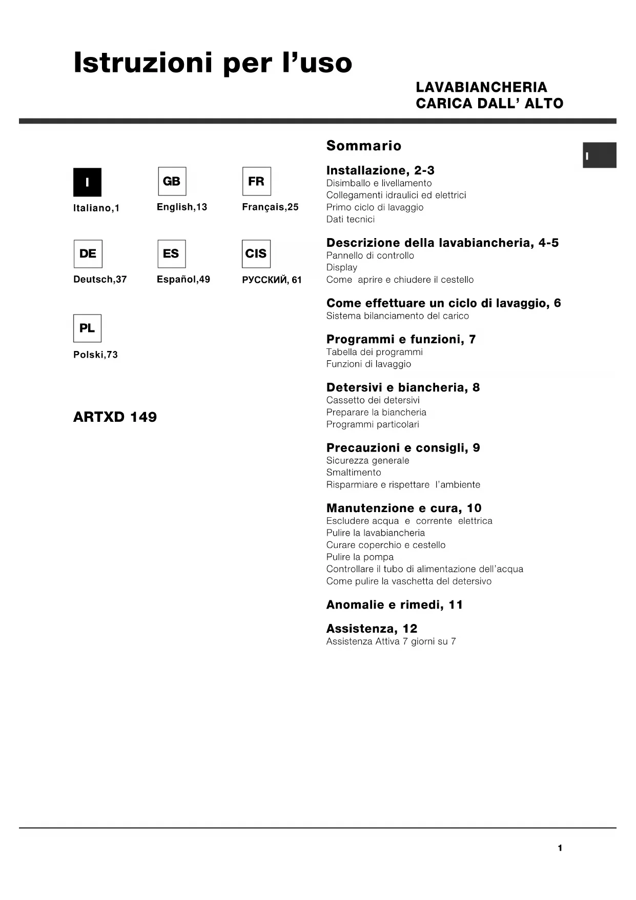 Italiano,1 Sommario Installazione, 2-3 Disimballo e livellamento Collegamenti idraulici ed elettrici Primo ciclo di lavaggio Dati tecnici Descrizione della lavabiancheria, 4-5 Pannello di controllo Display Come aprire e chiudere il cestello Come effettuare un ciclo di lavaggio, 6 Sistema bilanciamento del carico Programmi e funzioni, 7 Tabella dei programmi Funzioni di lavaggio Detersivi e biancheria, 8 Cassetto dei detersivi Preparare la biancheria Programmi particolari Precauzioni e consigli, 9 Sicurezza generale Smaltimento Risparmiare e rispettare lambiente Manutenzione e cura, 10 Escludere acqua e corrente elettrica Pulire la lavabiancheria Curare coperchio e cestello Pulire la pompa Controllare il tubo di alimentazione dellacqua Come pulire la vaschetta del detersivo Anomalie e rimedi, 11 Assistenza, 12 Assistenza Attiva 7 giorni su 7