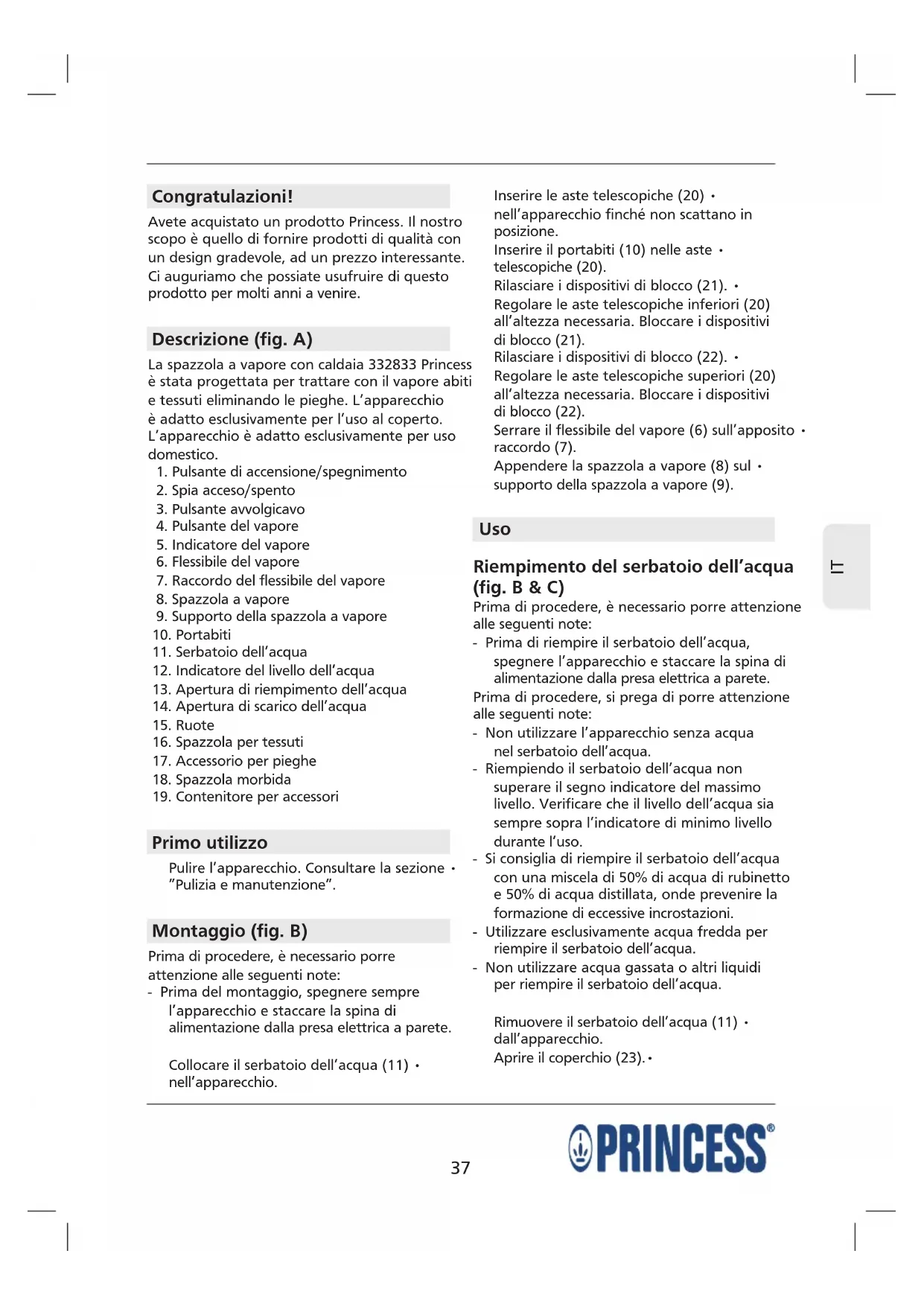 Congratulazioni! Avete acquistato un prodotto Princess. Il nostro scopo è quello di fornire prodotti di qualità con un design gradevole, ad un prezzo interessante. Ci auguriamo che possiate usufruire di questo prodotto per molti anni a venire. Descrizione (fig. A) La spazzola a vapore con caldaia 332833 Princess è stata progettata per trattare con il vapore abiti e tessuti eliminando le pieghe. L’apparecchio è adatto esclusivamente per l’uso al coperto. L’apparecchio è adatto esclusivamente per uso domestico.