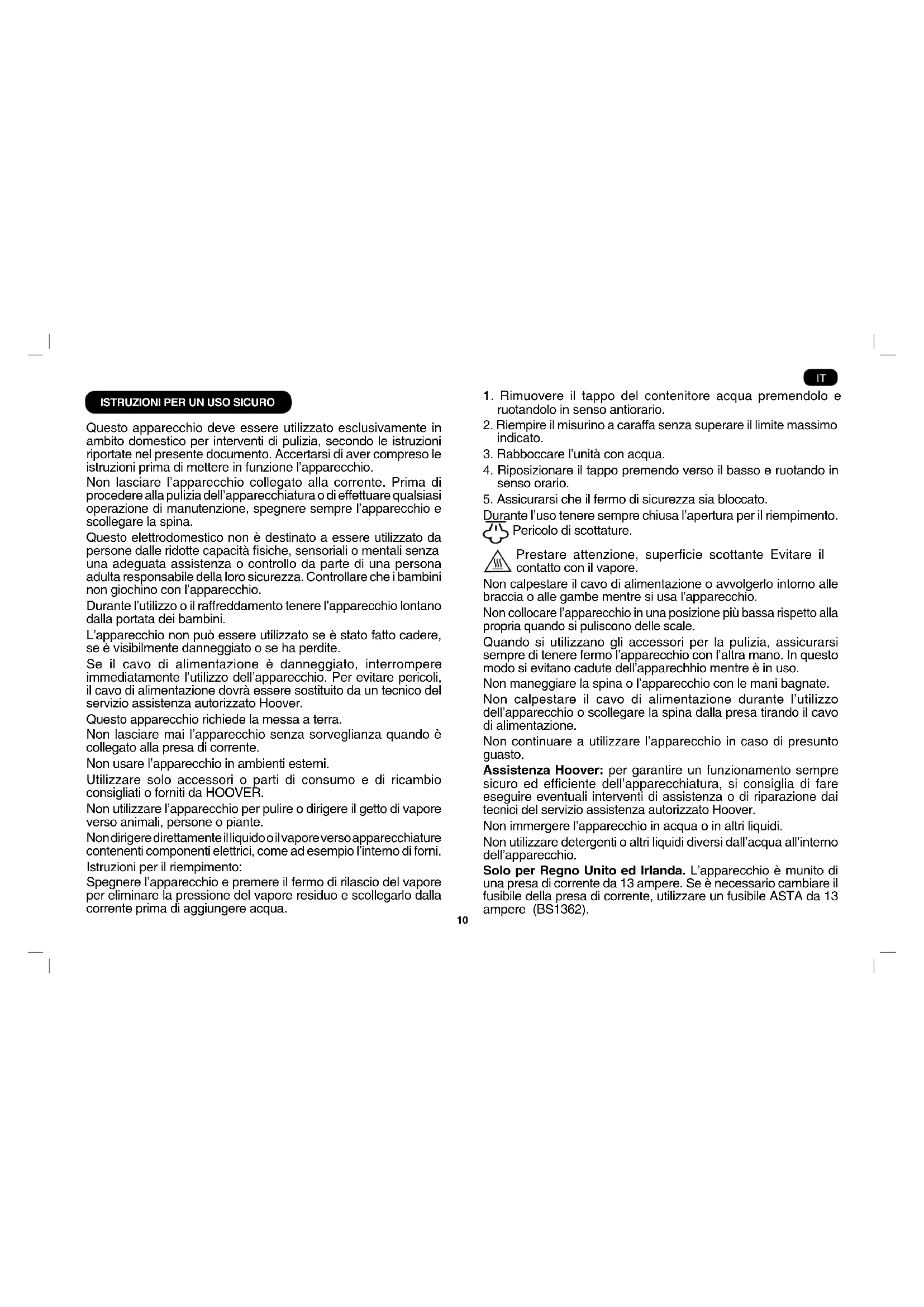 Questo apparecchio deve essere utilizzato esclusivamente in ambito domestico per interventi di pulizia, secondo le istruzioni riportate nel presente documento. Accertarsi di aver compreso le istruzioni prima di mettere in funzione l’apparecchio. Non lasciare l’apparecchio collegato alla corrente. Prima di procedere alla pulizia dell’apparecchiatura o di effettuare qualsiasi operazione di manutenzione, spegnere sempre l’apparecchio e scollegare la spina. Questo elettrodomestico non è destinato a essere utilizzato da personedalleridottecapacitàsiche,sensorialiomentalisenza una adeguata assistenza o controllo da parte di una persona adulta responsabile della loro sicurezza. Controllare che i bambini non giochino con l’apparecchio. Durante l’utilizzo o il raffreddamento tenere l’apparecchio lontano dalla portata dei bambini. L’apparecchio non può essere utilizzato se è stato fatto cadere, se è visibilmente danneggiato o se ha perdite. Se il cavo di alimentazione è danneggiato, interrompere immediatamente l’utilizzo dell’apparecchio. Per evitare pericoli, il cavo di alimentazione dovrà essere sostituito da un tecnico del servizio assistenza autorizzato Hoover. Questo apparecchio richiede la messa a terra. Non lasciare mai l’apparecchio senza sorveglianza quando è collegato alla presa di corrente. Non usare l’apparecchio in ambienti esterni. Utilizzare solo accessori o parti di consumo e di ricambio consigliati o forniti da HOOVER. Non utilizzare l’apparecchio per pulire o dirigere il getto di vapore verso animali, persone o piante. Non dirigere direttamente il liquido o il vapore verso apparecchiature contenenti componenti elettrici, come ad esempio l’interno di forni. Istruzioni per il riempimento: Spegnere l’apparecchio e premere il fermo di rilascio del vapore per eliminare la pressione del vapore residuo e scollegarlo dalla corrente prima di aggiungere acqua.