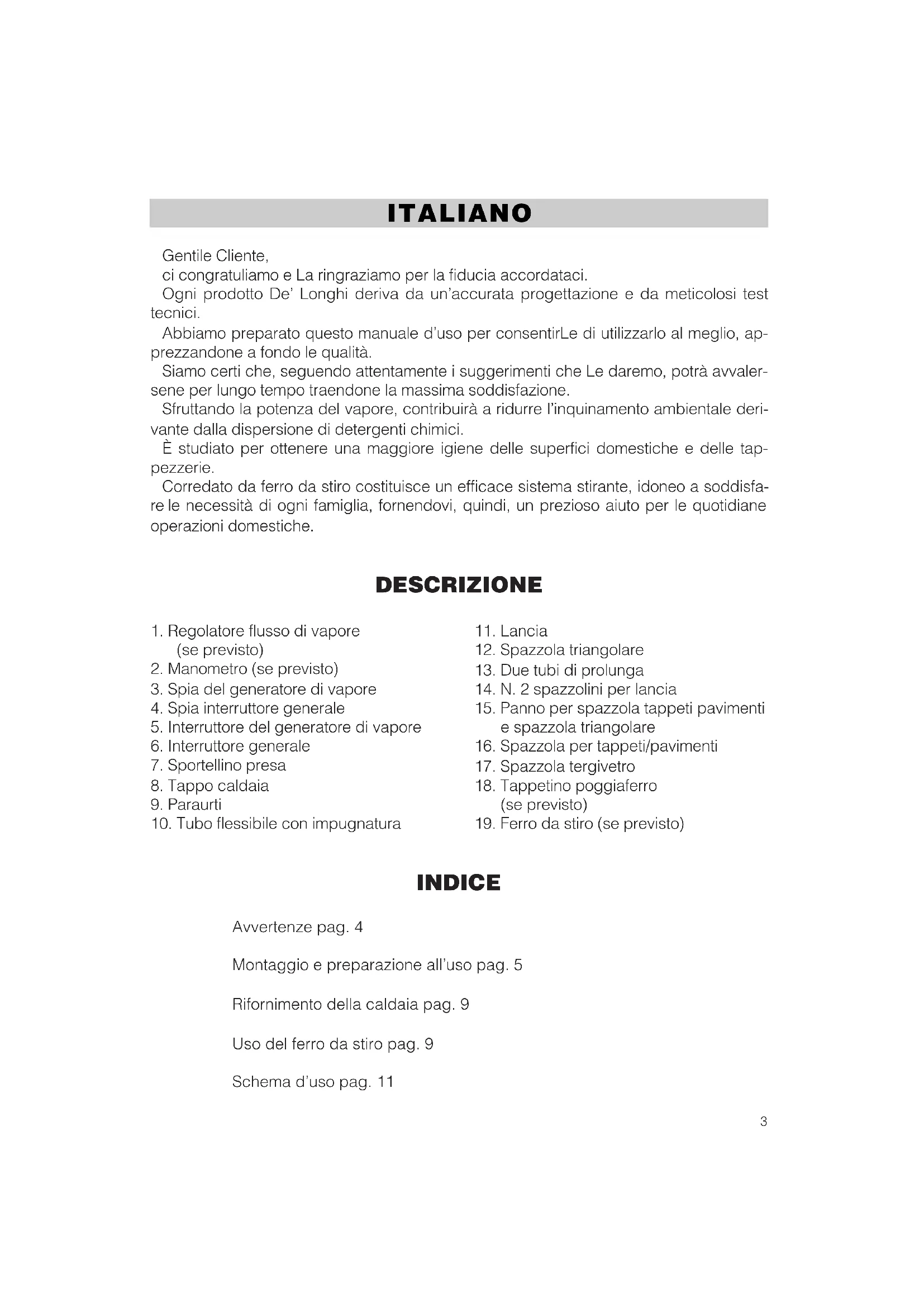 9Gentile Cliente, ci congratuliamo e La ringraziamo per la fiducia accordataci. Ogni prodotto De’ Longhi deriva da un’accurata progettazione e da meticolosi test tecnici. Abbiamo preparato questo manuale d’uso per consentirLe di utilizzarlo al meglio, ap- prezzandone a fondo le qualità. Siamo certi che, seguendo attentamente i suggerimenti che Le daremo, potrà avvaler- sene per lungo tempo traendone la massima soddisfazione. Sfruttando la potenza del vapore, contribuirà a ridurre l’inquinamento ambientale deri- vante dalla dispersione di detergenti chimici. È studiato per ottenere una maggiore igiene delle superfici domestiche e delle tap- pezzerie. Corredato da ferro da stiro costituisce un efficace sistema stirante, idoneo a soddisfa- re le necessità di ogni famiglia, fornendovi, quindi, un prezioso aiuto per le quotidiane operazioni domestiche. DESCRIZIONE