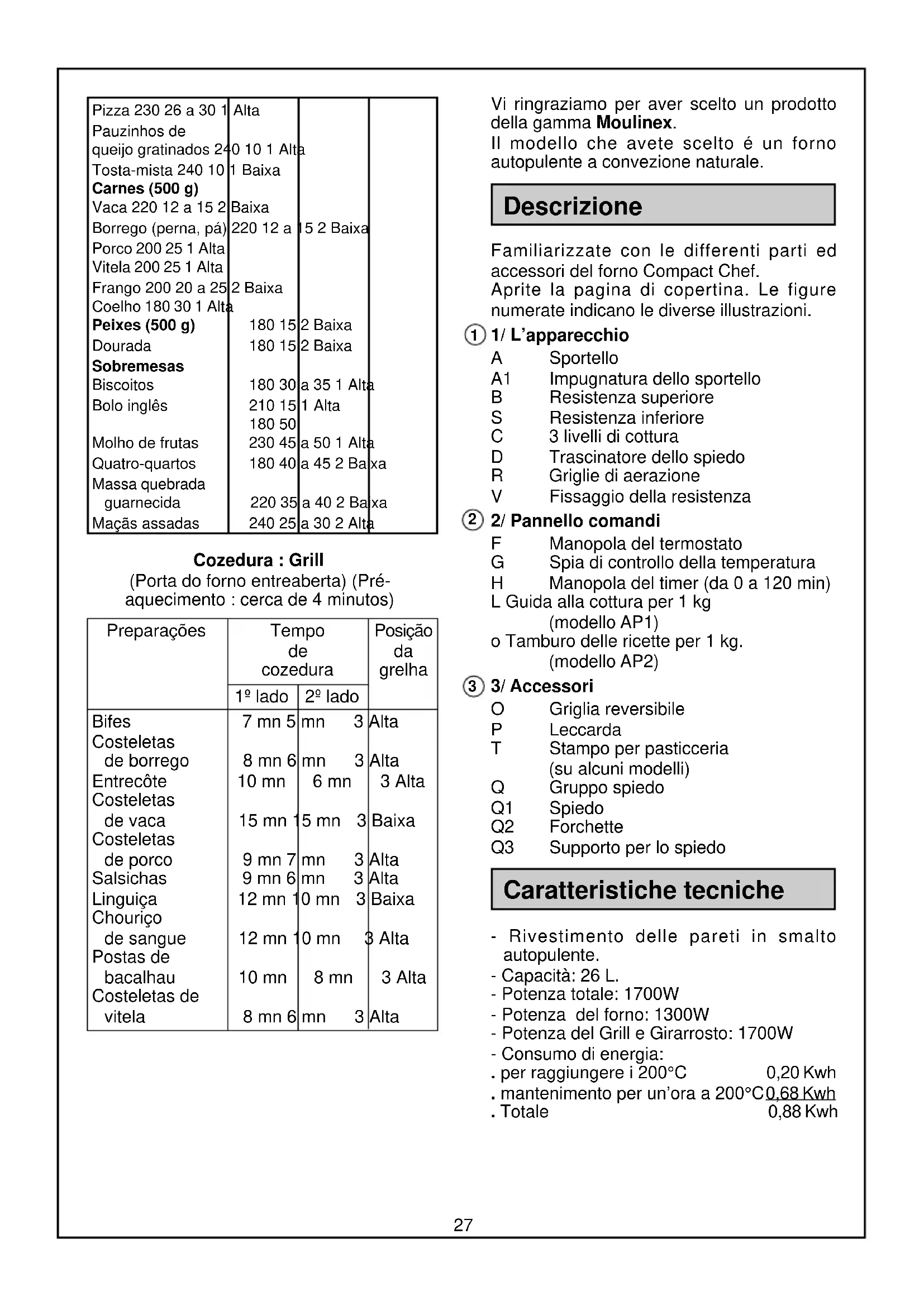 Molho de frutas 230 45 a 50 1 Alta Quatro-quartos 180 40 a 45 2 Baixa Massa quebrada guarnecida 220 35 a 40 2 Baixa Maçãs assadas 240 25 a 30 2 Alta Cozedura : Grill (Porta do forno entreaberta) (Pré- aquecimento : cerca de 4 minutos) Preparações Tempo Posição de da cozedura grelha 1º lado 2º lado Bifes 7 mn 5 mn 3 Alta Costeletas de borrego 8 mn 6 mn 3 Alta Entrecôte 10 mn 6 mn 3 Alta Costeletas de vaca 15 mn 15 mn 3 Baixa Costeletas de porco 9 mn 7 mn 3 Alta Salsichas 9 mn 6 mn 3 Alta Linguiça 12 mn 10 mn 3 Baixa Chouriço de sangue 12 mn 10 mn 3 Alta Postas de bacalhau 10 mn 8 mn 3 Alta Costeletas de vitela 8 mn 6 mn 3 Alta Vi ringraziamo per aver scelto un prodotto della gamma Moulinex. Il modello che avete scelto é un forno autopulente a convezione naturale. Descrizione Familiarizzate con le differenti parti ed accessori del forno Compact Chef. Aprite la pagina di copertina. Le figure numerate indicano le diverse illustrazioni. 1/ L’apparecchio A Sportello A1 Impugnatura dello sportello B Resistenza superiore S Resistenza inferiore C 3 livelli di cottura D Trascinatore dello spiedo R Griglie di aerazione V Fissaggio della resistenza 2/ Pannello comandi F Manopola del termostato G Spia di controllo della temperatura H Manopola del timer (da 0 a 120 min) L Guida alla cottura per 1 kg (modello AP1) o Tamburo delle ricette per 1 kg. (modello AP2) 3/ Accessori O Griglia reversibile P Leccarda T Stampo per pasticceria (su alcuni modelli) Q Gruppo spiedo Q1 Spiedo Q2 Forchette Q3 Supporto per lo spiedo Caratteristiche tecniche - Rivestimento delle pareti in smalto autopulente. - Capacità: 26 L. - Potenza totale: 1700W - Potenza del forno: 1300W - Potenza del Grill e Girarrosto: 1700W - Consumo di energia: . per raggiungere i 200°C 0,20 Kwh . mantenimento per un’ora a 200°C 0,68 Kwh . Totale 0,88 Kwh