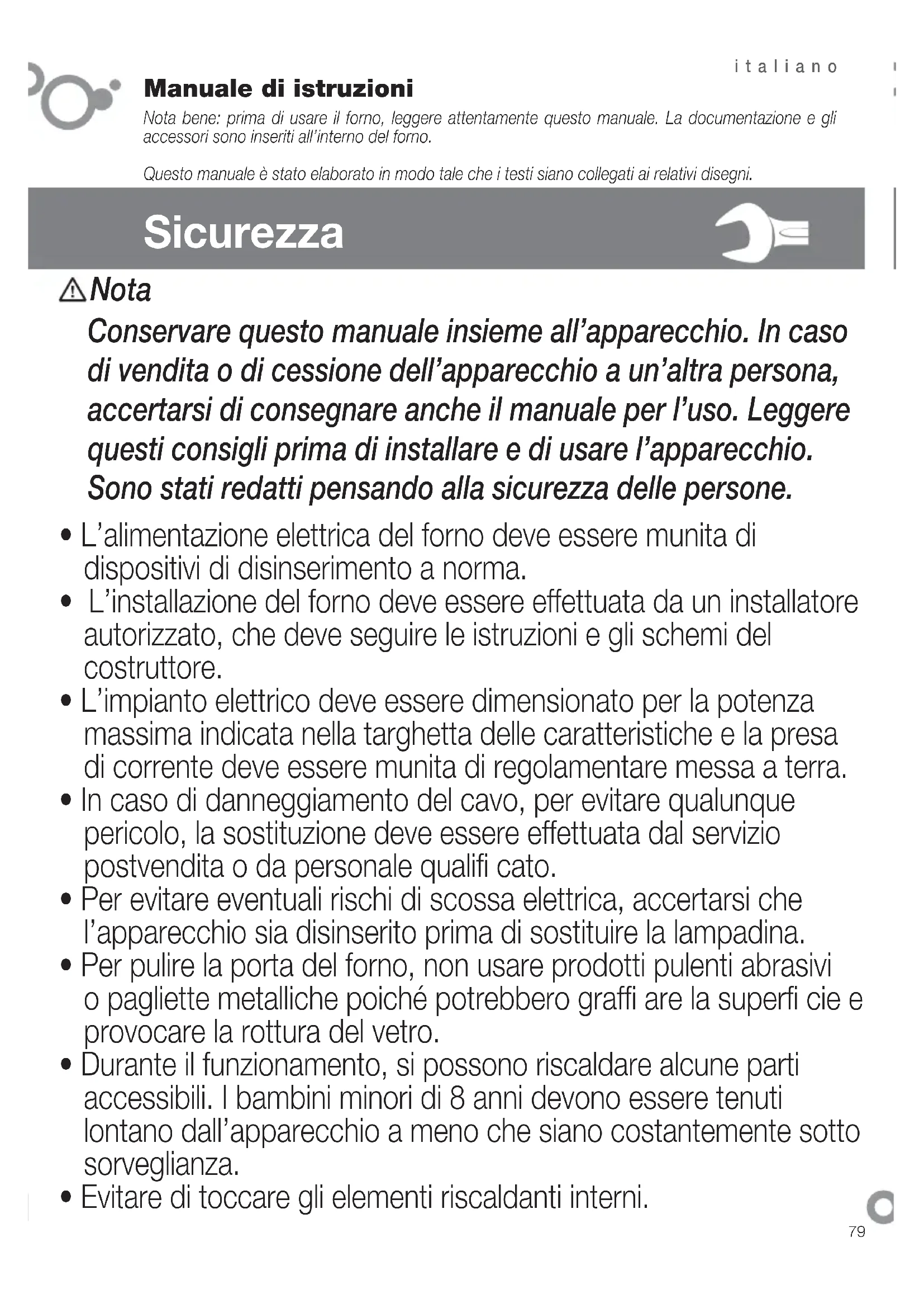 - Evitare di toccare gli elementi riscaldanti interni. Nota Conservare questo manuale insieme all’apparecchio. In caso di vendita o di cessione dell’apparecchio a un’altra persona, accertarsi di consegnare anche il manuale per l’uso. Leggere questi consigli prima di installare e di usare l’apparecchio. Sono stati redatti pensando alla sicurezza delle persone.80 italiano
