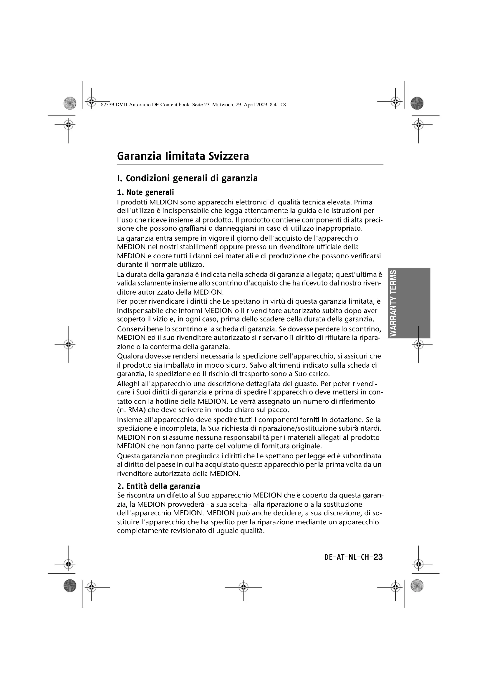 Se riscontra un difetto al Suo apparecchio MEDION che è coperto da questa garan- zia, la MEDION provvederà - a sua scelta - alla riparazione o alla sostituzione dell'apparecchio MEDION. MEDION può anche decidere, a sua discrezione, di so- stituire l'apparecchio che ha spedito per la riparazione mediante un apparecchio completamente revisionato di uguale qualità. 82339 DVD-Autoradio DE Content.book Seite 23 Mittwoch, 29. April 2009 8:41 08DE-AT-NL-CH-24 Tutte le parti del prodotto o le dotazioni sostituite da MEDION divengono la pro- prietà di MEDION. Le batterie usa e getta o ricaricabili hanno una garanzia di 6 mesi. I materiali di con- sumo, ossia i componenti che devono essere sostituiti ad intervalli regolari durante l'utilizzo dell'apparecchio, come ad es. la lampada del proiettore di un beamer, non sono coperti da garanzia. Un difetto dei pixel (punto sempre colorato, acceso o spento) non costituisce so- stanzialmente un vizio. Il numero massimo consentito di pixel difettosi è riportato nella guida dell'utente. MEDION non si assume nessuna garanzia per le immagini che si sono impresse sugli schermi al plasma o a cristalli liquidi a causa di un utilizzo inappropriato del prodotto. Nella guida dell'utente allegata trova una descrizione sull'uso corretto del prodotto. La garanzia non copre i difetti di riproduzione dei supporti di dati se ha utilizzato un formato non compatibile o un software inidoneo. Se durante la riparazione do- vesse emergere che il difetto rivendicato non è coperto dalla garanzia, MEDION si riserva il diritto di addebitarLe le spese sostenute sotto forma di un forfait di hand- ling e di inviarLe un preventivo di spesa per le riparazioni che MEDION dovrà ese- guire a titolo oneroso.