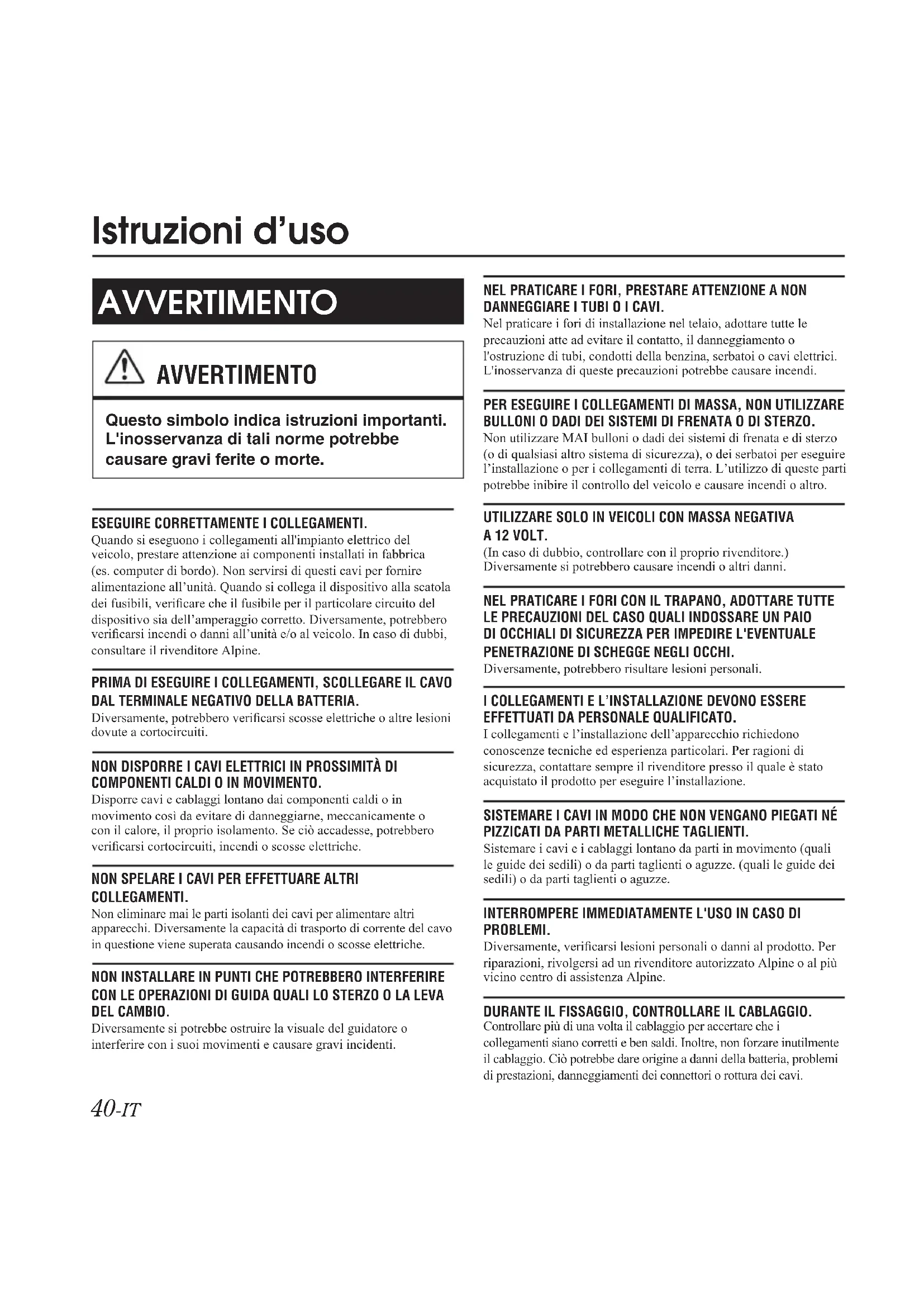 - Collegamenti del sistema LP13-0113_Alpine_TUE-DAB1U_ML.indb 39 7/12/2013 6:59:50 PM40-IT Istruzioni d’uso ESEGUIRE CORRETTAMENTE I COLLEGAMENTI.Quando si eseguono i collegamenti all'impianto elettrico del veicolo, prestare attenzione ai componenti installati in fabbrica (es. computer di bordo). Non servirsi di questi cavi per fornire alimentazione all’unità. Quando si collega il dispositivo alla scatola dei fusibili, vericare che il fusibile per il particolare circuito del dispositivo sia dell’amperaggio corretto. Diversamente, potrebbero vericarsi incendi o danni all’unità e/o al veicolo. In caso di dubbi, consultare il rivenditore Alpine.PRIMA DI ESEGUIRE I COLLEGAMENTI, SCOLLEGARE IL CAVO DAL TERMINALE NEGATIVO DELLA BATTERIA.Diversamente, potrebbero vericarsi scosse elettriche o altre lesioni dovute a cortocircuiti.NON DISPORRE I CAVI ELETTRICI IN PROSSIMITÀ DI COMPONENTI CALDI O IN MOVIMENTO.Disporre cavi e cablaggi lontano dai componenti caldi o in movimento così da evitare di danneggiarne, meccanicamente o con il calore, il proprio isolamento. Se ciò accadesse, potrebbero vericarsi cortocircuiti, incendi o scosse elettriche.NON SPELARE I CAVI PER EFFETTUARE ALTRI COLLEGAMENTI.Non eliminare mai le parti isolanti dei cavi per alimentare altri apparecchi. Diversamente la capacità di trasporto di corrente del cavo in questione viene superata causando incendi o scosse elettriche.NON INSTALLARE IN PUNTI CHE POTREBBERO INTERFERIRE CON LE OPERAZIONI DI GUIDA QUALI LO STERZO O LA LEVA DEL CAMBIO.Diversamente si potrebbe ostruire la visuale del guidatore o interferire con i suoi movimenti e causare gravi incidenti. AVVERTIMENTO AVVERTIMENTO Questo simbolo indica istruzioni importanti. L'inosservanza di tali norme potrebbe causare gravi ferite o morte. NEL PRATICARE I FORI, PRESTARE ATTENZIONE A NON DANNEGGIARE I TUBI O I CAVI.Nel praticare i fori di installazione nel telaio, adottare tutte le precauzioni atte ad evitare il contatto, il danneggiamento o l'ostruzione di tubi, condotti della benzina, serbatoi o cavi elettrici. L'inosservanza di queste precauzioni potrebbe causare incendi.PER ESEGUIRE I COLLEGAMENTI DI MASSA, NON UTILIZZARE BULLONI O DADI DEI SISTEMI DI FRENATA O DI STERZO.Non utilizzare MAI bulloni o dadi dei sistemi di frenata e di sterzo (o di qualsiasi altro sistema di sicurezza), o dei serbatoi per eseguire l’installazione o per i collegamenti di terra. L’utilizzo di queste parti potrebbe inibire il controllo del veicolo e causare incendi o altro.UTILIZZARE SOLO IN VEICOLI CON MASSA NEGATIVA A 12 VOLT.(In caso di dubbio, controllare con il proprio rivenditore.) Diversamente si potrebbero causare incendi o altri danni.NEL PRATICARE I FORI CON IL TRAPANO, ADOTTARE TUTTE LE PRECAUZIONI DEL CASO QUALI INDOSSARE UN PAIO DI OCCHIALI DI SICUREZZA PER IMPEDIRE L'EVENTUALE PENETRAZIONE DI SCHEGGE NEGLI OCCHI.Diversamente, potrebbero risultare lesioni personali.I COLLEGAMENTI E L’INSTALLAZIONE DEVONO ESSERE EFFETTUATI DA PERSONALE QUALIFICATO.I collegamenti e l’installazione dell’apparecchio richiedono conoscenze tecniche ed esperienza particolari. Per ragioni di sicurezza, contattare sempre il rivenditore presso il quale è stato acquistato il prodotto per eseguire l’installazione.SISTEMARE I CAVI IN MODO CHE NON VENGANO PIEGATI NÉ PIZZICATI DA PARTI METALLICHE TAGLIENTI.Sistemare i cavi e i cablaggi lontano da parti in movimento (quali le guide dei sedili) o da parti taglienti o aguzze. (quali le guide dei sedili) o da parti taglienti o aguzze.INTERROMPERE IMMEDIATAMENTE L'USO IN CASO DI PROBLEMI.Diversamente, vericarsi lesioni personali o danni al prodotto. Per riparazioni, rivolgersi ad un rivenditore autorizzato Alpine o al più vicino centro di assistenza Alpine.DURANTE IL FISSAGGIO, CONTROLLARE IL CABLAGGIO.Controllare più di una volta il cablaggio per accertare che i collegamenti siano corretti e ben saldi. Inoltre, non forzare inutilmente il cablaggio. Ciò potrebbe dare origine a danni della batteria, problemi di prestazioni, danneggiamenti dei connettori o rottura dei cavi.LP13-0113_Alpine_TUE-DAB1U_ML.indb 40 7/12/2013 6:59:50 PM41-IT p. 50
