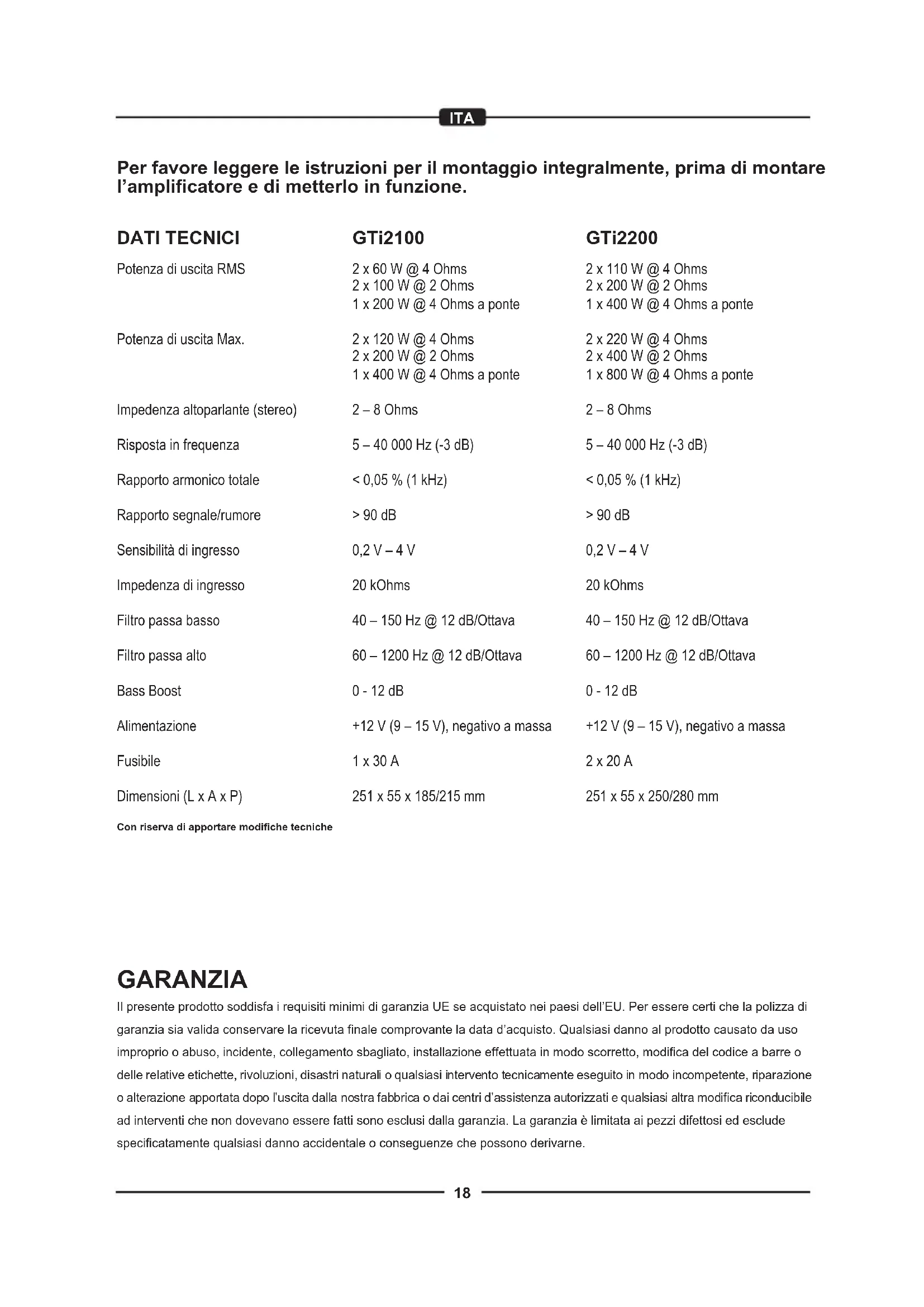 +12 V (9 – 15 V), negativo a massa 1 x 30 A 251 x 55 x 185/215 mm GARANZIA Il presente prodotto soddisfa i requisiti minimi di garanzia UE se acquistato nei paesi dell’EU. Per essere certi che la polizza di garanzia sia valida conservare la ricevuta finale comprovante la data d’acquisto. Qualsiasi danno al prodotto causato da uso improprio o abuso, incidente, collegamento sbagliato, installazione effettuata in modo scorretto, modifica del codice a barre o delle relative etichette, rivoluzioni, disastri naturali o qualsiasi intervento tecnicamente eseguito in modo incompetente, riparazione o alterazione apportata dopo l’uscita dalla nostra fabbrica o dai centri d’assistenza autorizzati e qualsiasi altra modifica riconducibile ad interventi che non dovevano essere fatti sono esclusi dalla garanzia. La garanzia è limitata ai pezzi difettosi ed esclude specificatamente qualsiasi danno accidentale o conseguenze che possono derivarne. GTi2200 2 x 110 W @ 4 Ohms 2 x 200 W @ 2 Ohms 1 x 400 W @ 4 Ohms a ponte 2 x 220 W @ 4 Ohms 2 x 400 W @ 2 Ohms 1 x 800 W @ 4 Ohms a ponte 2 – 8 Ohms 5 – 40 000 Hz (-3 dB) < 0,05 % (1 kHz) > 90 dB 0,2 V – 4 V 20 kOhms 40 – 150 Hz @ 12 dB/Ottava 60 – 1200 Hz @ 12 dB/Ottava
