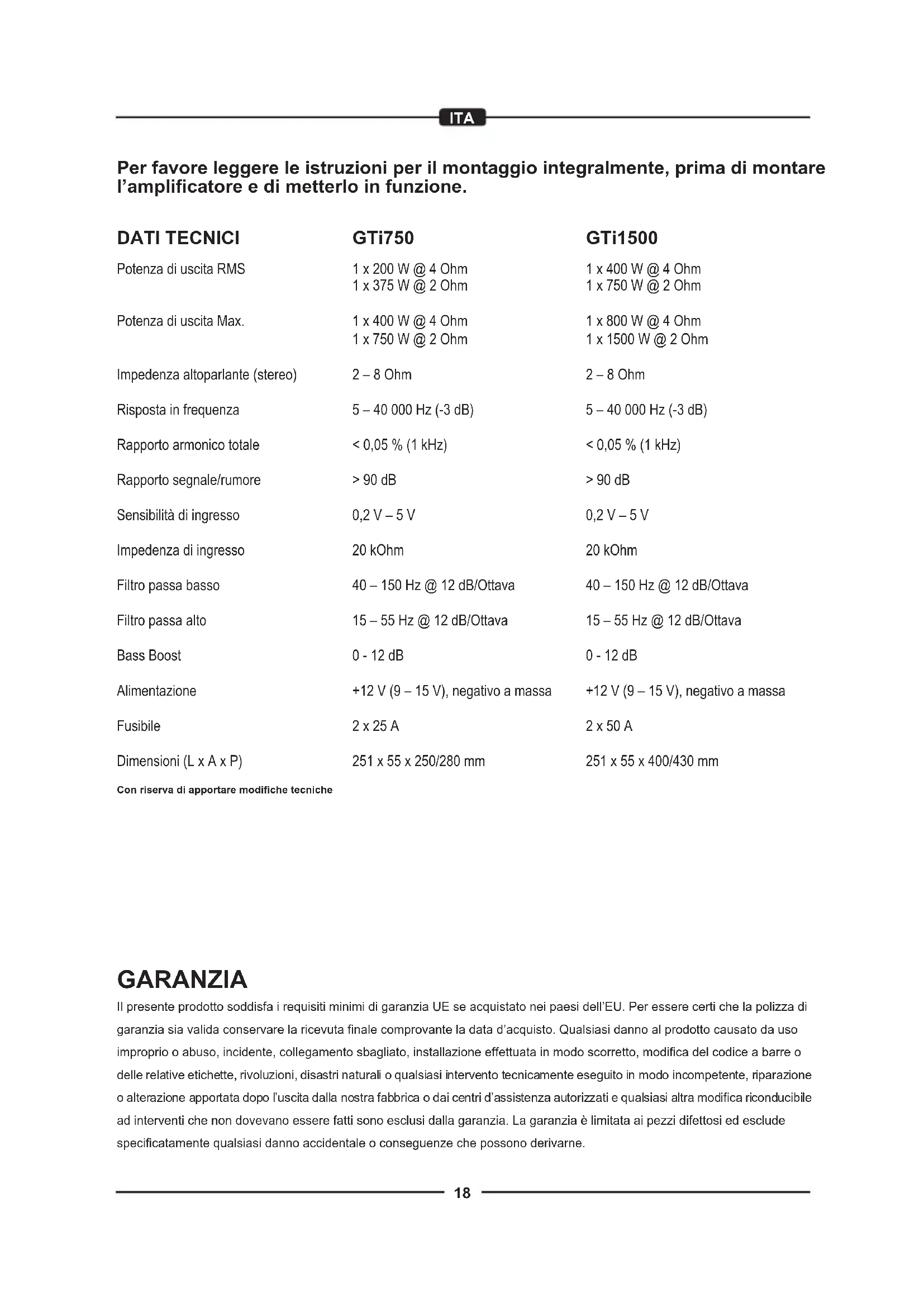 +12 V (9 – 15 V), negativo a massa 2 x 25 A 251 x 55 x 250/280 mm GARANZIA Il presente prodotto soddisfa i requisiti minimi di garanzia UE se acquistato nei paesi dell’EU. Per essere certi che la polizza di garanzia sia valida conservare la ricevuta finale comprovante la data d’acquisto. Qualsiasi danno al prodotto causato da uso improprio o abuso, incidente, collegamento sbagliato, installazione effettuata in modo scorretto, modifica del codice a barre o delle relative etichette, rivoluzioni, disastri naturali o qualsiasi intervento tecnicamente eseguito in modo incompetente, riparazione o alterazione apportata dopo l’uscita dalla nostra fabbrica o dai centri d’assistenza autorizzati e qualsiasi altra modifica riconducibile ad interventi che non dovevano essere fatti sono esclusi dalla garanzia. La garanzia è limitata ai pezzi difettosi ed esclude specificatamente qualsiasi danno accidentale o conseguenze che possono derivarne. GTi1500 1 x 400 W @ 4 Ohm 1 x 750 W @ 2 Ohm 1 x 800 W @ 4 Ohm 1 x 1500 W @ 2 Ohm 2 – 8 Ohm 5 – 40 000 Hz (-3 dB) < 0,05 % (1 kHz) > 90 dB 0,2 V – 5 V 20 kOhm 40 – 150 Hz @ 12 dB/Ottava 15 – 55 Hz @ 12 dB/Ottava