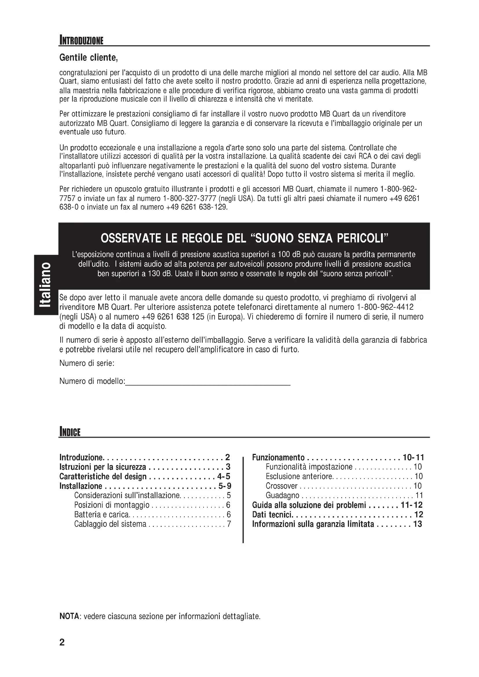 Benvenuti alla MB Quart! Il presente manuale contiene informazioni per il proprietario, il rivenditore e l'installatore. Per informazioni rapide sull'installazione di quello prodotto, leggere il capitolo Installazione. Per altre informazioni consultate l'indice. Alla MB Quart, abbiamo fatto quanto possible per assicurarci che tutte le informazioni contenate in quello manuale siano aggiornate; tuttavia, poiché siamo sempre alla ricerca di nuovi modi per migliorare i nostri prodotti, queste informazioni sono soggette a modificheenza preavviso