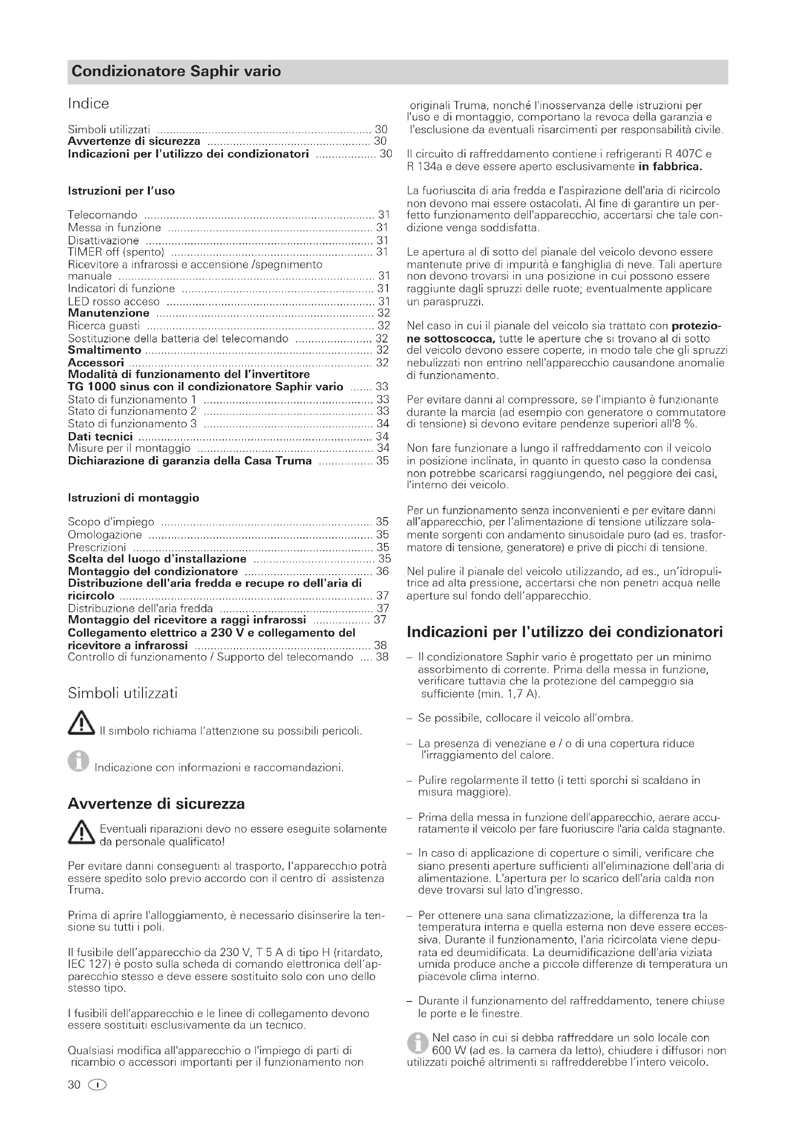 Enfoncer la fiche de câble secteur (15) dans la prise. L‘enclen- chement d‘un nez de maintien décharge automatiquement la traction exercée sur la fiche. Pour retirer la fiche, soulever le nez de maintien à l‘aide d‘un tournevis. Enfoncer la fiche pour récepteur IR dans la prise (16). La connexion (17) est requise si le climatiseur Saphir vario fonctionne au moyen d‘un convertisseur Truma TG 1000 sinus (prise com / communication a ou b). Fermer de nouveau le couvercle électronique et serrer de nouveau les vis (14). Les câbles doivent avoir suffisamment de jeu pour que l‘appa- reil avec ses câbles connectés puisse être retiré du faux-fond. Tous les câbles doivent être fixés à l'aide de brides ! Pour les travaux d'entretien et de réparation, un dispositif de coupure doit être disponible côté véhicule pour une décon- nexion sur tous les pôles du réseau avec au moins 3,5 mm d'écartement de contact. Vérification du fonctionnement / Support pour la télécommande Placer le support pour la télécommande si possible à proximi- té du récepteur (9) afin de pouvoir utiliser le climatiseur sans avoir à sortir la télécommande de son support. Il faut ensuite vérifier l'ensemble des fonctions de l'appareil conformément à la notice d'utilisation. Le mode d’emploi doit être remis au propriétaire du véhicule.30 Condizionatore Saphir vario Simboli utilizzati Il simbolo richiama l‘attenzione su possibili pericoli. Indicazione con informazioni e raccomandazioni. Avvertenze di sicurezza Eventuali riparazioni devo no essere eseguite solamente da personale qualificato! Per evitare danni conseguenti al trasporto, l‘apparecchio potrà essere spedito solo previo accordo con il centro di assistenza Truma. Prima di aprire l'alloggiamento, è necessario disinserire la ten- sione su tutti i poli. Il fusibile dell’apparecchio da 230 V, T 5 A di tipo H (ritardato, IEC 127) è posto sulla scheda di comando elettronica dell’ap- parecchio stesso e deve essere sostituito solo con uno dello stesso tipo. I fusibili dell'apparecchio e le linee di collegamento devono essere sostituiti esclusivamente da un tecnico. Qualsiasi modifica all'apparecchio o l'impiego di parti di ricambio o accessori importanti per il funzionamento non originali Truma, nonché l'inosservanza delle istruzioni per l'uso e di montaggio, comportano la revoca della garanzia e l'esclusione da eventuali risarcimenti per responsabilità civile. Il circuito di raffreddamento contiene i refrigeranti R 407C e R 134a e deve essere aperto esclusivamente in fabbrica. La fuoriuscita di aria fredda e l'aspirazione dell'aria di ricircolo non devono mai essere ostacolati. Al fine di garantire un per- fetto funzionamento dell'apparecchio, accertarsi che tale con- dizione venga soddisfatta. Le apertura al di sotto del pianale del veicolo devono essere mantenute prive di impurità e fanghiglia di neve. Tali aperture non devono trovarsi in una posizione in cui possono essere raggiunte dagli spruzzi delle ruote; eventualmente applicare un paraspruzzi. Nel caso in cui il pianale del veicolo sia trattato con protezio- ne sottoscocca, tutte le aperture che si trovano al di sotto del veicolo devono essere coperte, in modo tale che gli spruzzi nebulizzati non entrino nell'apparecchio causandone anomalie di funzionamento. Per evitare danni al compressore, se l'impianto è funzionante durante la marcia (ad esempio con generatore o commutatore di tensione) si devono evitare pendenze superiori all'8 %. Non fare funzionare a lungo il raffreddamento con il veicolo in posizione inclinata, in quanto in questo caso la condensa non potrebbe scaricarsi raggiungendo, nel peggiore dei casi, l'interno dei veicolo. Per un funzionamento senza inconvenienti e per evitare danni all’apparecchio, per l’alimentazione di tensione utilizzare sola- mente sorgenti con andamento sinusoidale puro (ad es. trasfor- matore di tensione, generatore) e prive di picchi di tensione. Nel pulire il pianale del veicolo utilizzando, ad es., un’idropuli- trice ad alta pressione, accertarsi che non penetri acqua nelle aperture sul fondo dell’apparecchio. Indicazioni per l'utilizzo dei condizionatori Il condizionatore Saphir vario è progettato per un minimo assorbimento di corrente. Prima della messa in funzione, verificare tuttavia che la protezione del campeggio sia sufficiente (min. 1,7 A). Se possibile, collocare il veicolo all'ombra. La presenza di veneziane e / o di una copertura riduce l'irraggiamento del calore. Pulire regolarmente il tetto (i tetti sporchi si scaldano in misura maggiore). Prima della messa in funzione dell'apparecchio, aerare accu- ratamente il veicolo per fare fuoriuscire l'aria calda stagnante. In caso di applicazione di coperture o simili, verificare che siano presenti aperture sufficienti all'eliminazione dell'aria di alimentazione. L'apertura per lo scarico dell'aria calda non deve trovarsi sul lato d'ingresso. Per ottenere una sana climatizzazione, la differenza tra la temperatura interna e quella esterna non deve essere ecces- siva. Durante il funzionamento, l'aria ricircolata viene depu- rata ed deumidificata. La deumidificazione dell'aria viziata umida produce anche a piccole differenze di temperatura un piacevole clima interno. Durante il funzionamento del raffreddamento, tenere chiuse le porte e le finestre. Nel caso in cui si debba raffreddare un solo locale con 600 W (ad es. la camera da letto), chiudere i diffusori non utilizzati poiché altrimenti si raffredderebbe l’intero veicolo.