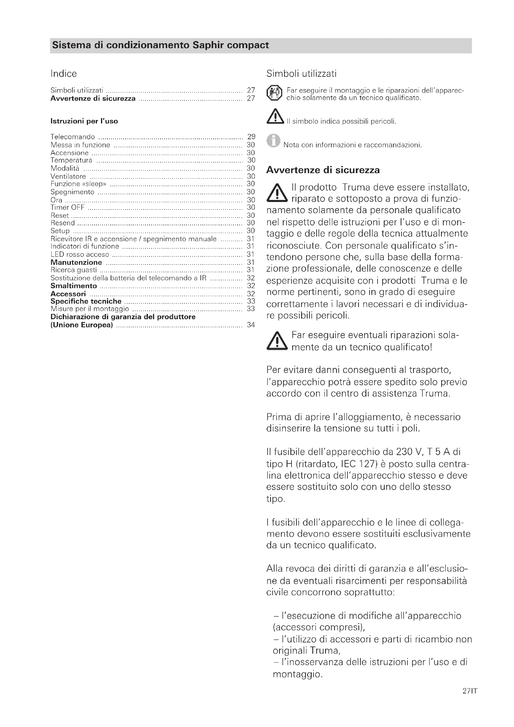 - Le recours en garantie doit être formé auprès d’un partenaire SAV agréé ou du centre de service après-vente Truma. Vous trouverez adresses et numéros de téléphone sur www.truma.com à la rubrique « Service ». Adresse du fabricant : Truma Gerätetechnik GmbH & Co. KG Truma Servicezentrum Wernher-von-Braun-Straße 12 85640 Putzbrunn, Allemagne Afin d’assurer le bon déroulement de la garantie, prière de fournir les informations suivantes au moment où vous pren- drez contact : – description détaillée du défaut – numéro de série de l’appareil – date d’achat Le partenaire SAV agréé ou le centre de service après-vente Truma décideront au cas par cas de la marche à suivre. Afin de prévenir tous dommages dus au transport, l’appareil ne de- vra être expédié qu’après concertation avec le partenaire SAV agréé ou le centre de service après-vente Truma. Si le recours en garantie est accepté par le fabricant, ce der- nier prend en charge les frais de transport. Si le dommage n’est pas couvert par la garantie, le consommateur en sera informé et les frais de réparation et de transport seront à sa charge. Prière de ne rien retourner sans avoir pris contact avec nous au préalable.27IT Sistema di condizionamento Saphir compact Simboli utilizzati Far eseguire il montaggio e le riparazioni dell’apparec- chio solamente da un tecnico qualificato. Il simbolo indica possibili pericoli. Nota con informazioni e raccomandazioni. Avvertenze di sicurezza Il prodotto Truma deve essere installato, riparato e sottoposto a prova di funzio- namento solamente da personale qualificato nel rispetto delle istruzioni per l’uso e di mon- taggio e delle regole della tecnica attualmente riconosciute. Con personale qualificato s’in- tendono persone che, sulla base della forma- zione professionale, delle conoscenze e delle esperienze acquisite con i prodotti Truma e le norme pertinenti, sono in grado di eseguire correttamente i lavori necessari e di individua- re possibili pericoli. Far eseguire eventuali riparazioni sola- mente da un tecnico qualificato! Per evitare danni conseguenti al trasporto, l’apparecchio potrà essere spedito solo previo accordo con il centro di assistenza Truma. Prima di aprire l’alloggiamento, è necessario disinserire la tensione su tutti i poli. Il fusibile dell’apparecchio da 230 V, T 5 A di tipo H (ritardato, IEC 127) è posto sulla centra- lina elettronica dell’apparecchio stesso e deve essere sostituito solo con uno dello stesso tipo. I fusibili dell’apparecchio e le linee di collega- mento devono essere sostituiti esclusivamente da un tecnico qualificato. Alla revoca dei diritti di garanzia e all’esclusio- ne da eventuali risarcimenti per responsabilità civile concorrono soprattutto: – l’esecuzione di modifiche all’apparecchio (accessori compresi), – l’utilizzo di accessori e parti di ricambio non originali Truma, – l’inosservanza delle istruzioni per l’uso e di montaggio. Indice Simboli utilizzati p. 27