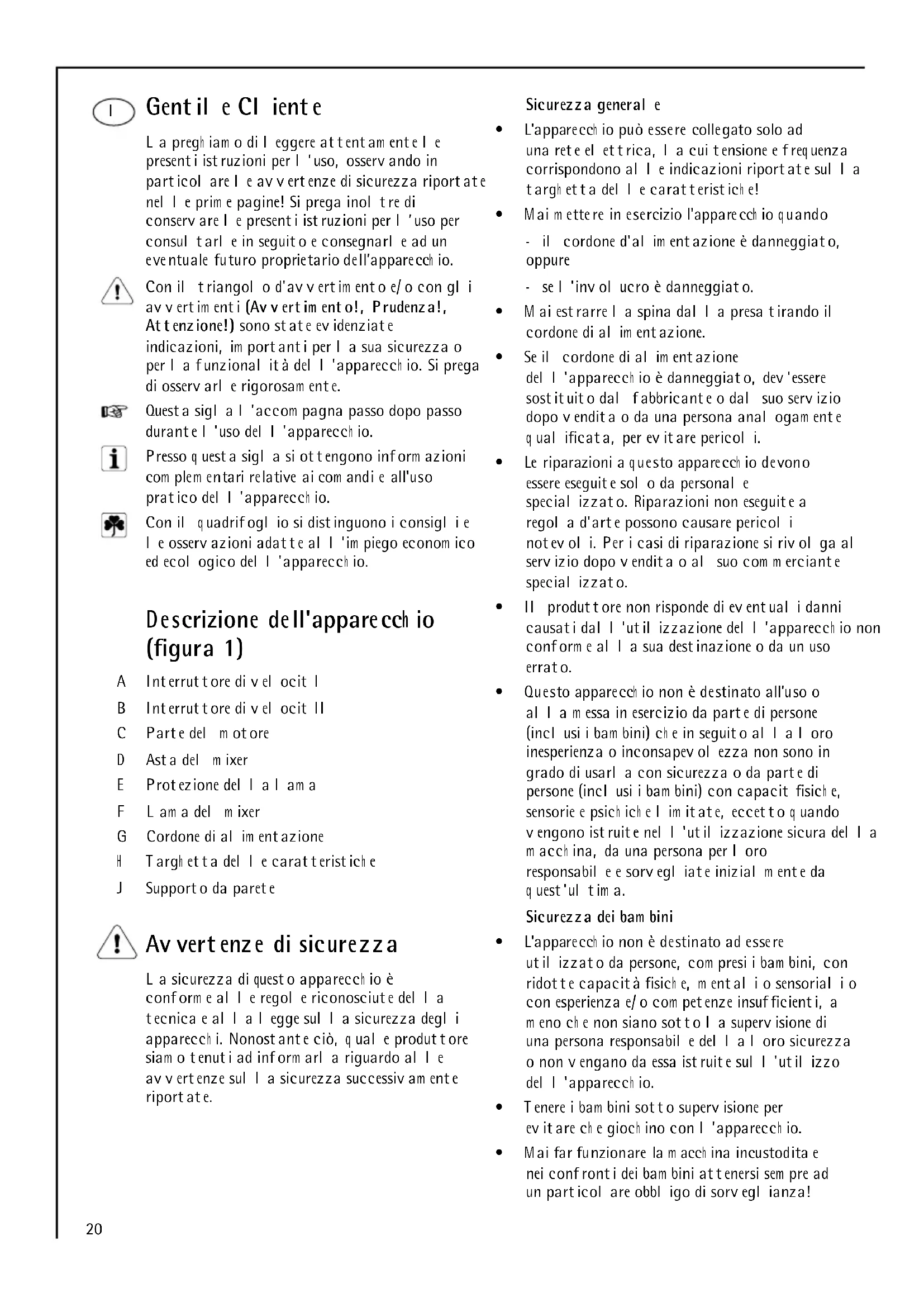 - EM C- rich tlijn 89 /336/EEC m et toevoeging 9 2/31/EEC en 9 3/68/EEC20 Gentile Cliente La pregh iam o di leggere attentam ente le presenti istruzioni per l’uso, osservando in particolare le avvertenze di sicurezza riportate nelle prim e pagine! Si prega inoltre di conservare le presenti istruzioni per l’uso per consultarle in seguito e consegnarle ad un eventuale futuro proprietario dell’apparecch io. Con il triangolo d'avvertim ento e/o con gli avvertim enti (Avvertim ento!, Prudenza!, Attenzione!) sono state evidenziate indicazioni, im portanti per la sua sicurezza o per la funzionalità dell'apparecch io. Si prega di osservarle rigorosam ente. Questa sigla l'accom pagna passo dopo passo durante l'uso dell'apparecch io. Presso q uesta sigla si ottengono inform azioni com plem entari relative ai com andi e all'uso pratico dell'apparecch io. Con il q uadrifoglio si distinguono i consigli e le osservazioni adatte all'im piego econom ico ed ecologico dell'apparecch io. Descrizione dell'apparecch io (figura 1) A Interruttore di velocit I B Interruttore di velocit II C Parte del m otore D Asta del m ixer E Protezione della lam a F Lam a del m ixer G Cordone di alim entazione H Targh etta delle caratteristich e J Supporto da parete Avvertenze di sicurezza La sicurezza di questo apparecch io è conform e alle regole riconosciute della tecnica e alla legge sulla sicurezza degli apparecch i. Nonostante ciò, q uale produttore siam o tenuti ad inform arla riguardo alle avvertenze sulla sicurezza successivam ente riportate. Sicurezza generale