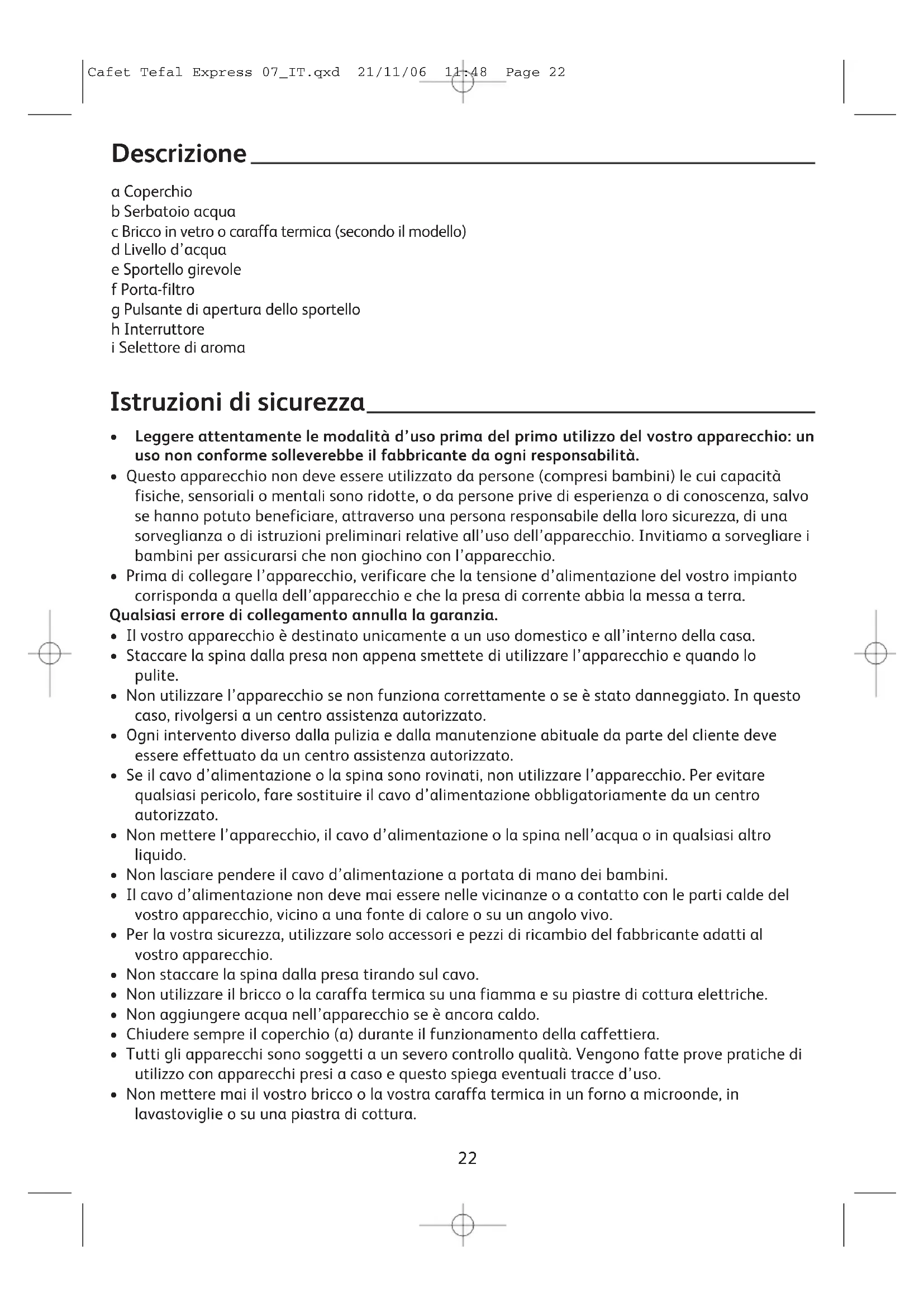 Descrizione a Coperchio b Serbatoio acqua c Bricco in vetro o caraffa termica (secondo il modello) d Livello d’acqua e Sportello girevole f Porta-filtro g Pulsante di apertura dello sportello h Interruttore i Selettore di aroma Cafet Tefal Express 07_IT.qxd 21/11/06 11:48 Page 22• Non mettere mai la mano all’interno della caraffa termica.