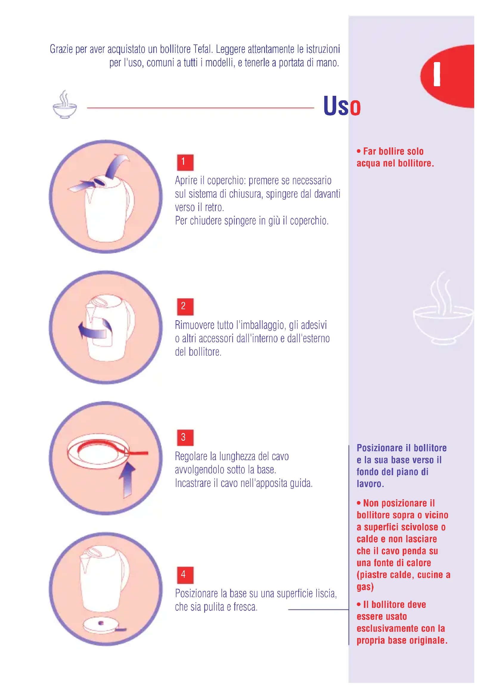 - Far bollire solo acqua nel bollitore. Uso Grazie per aver acquistato un bollitore Tefal. Leggere attentamente le istruzioni per l'uso, comuni a tutti i modelli, e tenerle a portata di mano. IIl bollitore può essere riempito attraverso il beccuccio per mantenere il filtro in buone condizioni. L'acqua deve almeno coprire la resistenza (o il fondo del bollitore).