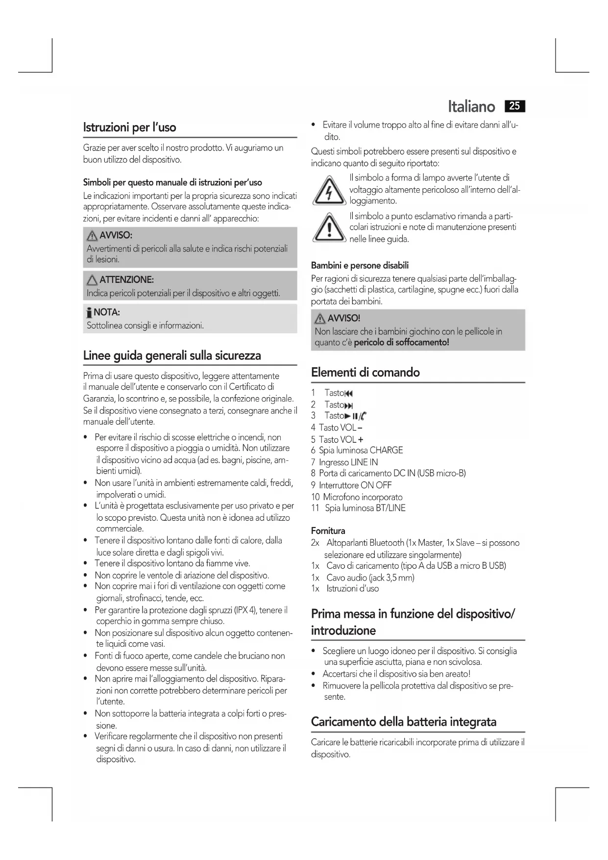 4 Tasto VOL – 5 Tasto VOL + 6 Spia luminosa CHARGE 7 Ingresso LINE IN 8 Porta di caricamento DC IN (USB micro-B) 9 Interruttore ON OFF 10 Microfono incorporato 11 Spia luminosa BT/LINE Fornitura 2x AltoparlantiBluetooth(1xMaster,1xSlave–sipossono selezionare ed utilizzare singolarmente) 1x Cavodicaricamento(tipoAdaUSBamicroBUSB) 1x Cavoaudio(jack3,5mm) 1x Istruzionid’uso Prima messa in funzione del dispositivo/ introduzione