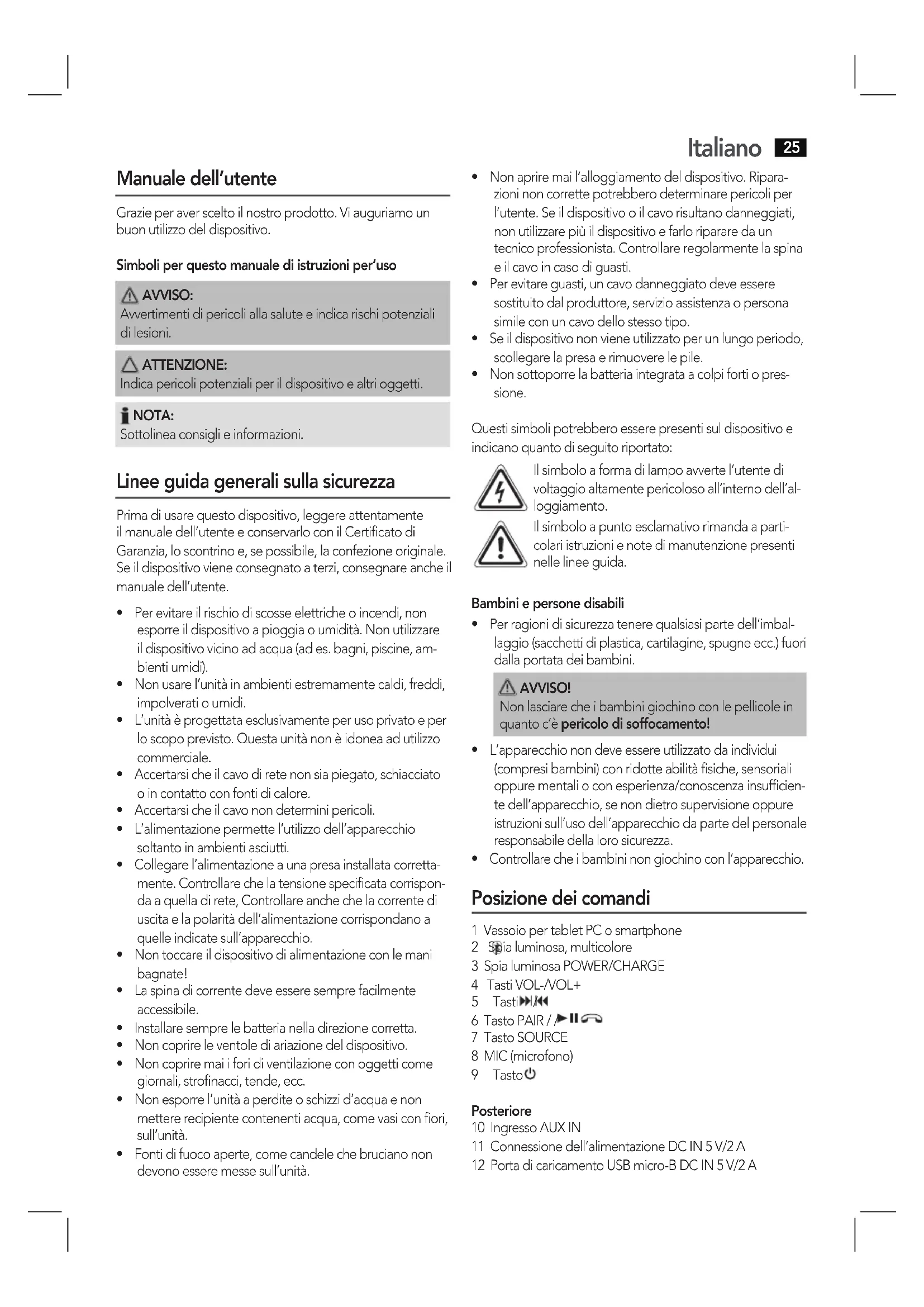 Difetto Causa Soluzione L’altoparlante nonpuòessere connesso L’accoppia- mento non funzione Controllare se la fonte au- dio supporta il protocollo A2DP. La fonte audio èspenta Accendere la fonte audio IlBluetoothè spento sulla fonte audio. Accendere la funzione Bluetooth nella fonte audio. La versione Bluetooth non èsupportata. Usare una diversa unità di riproduzione. Specifiche tecniche Modello: .............................................................................. BSS 4820 Funzionamento della batteria: .............................3,7V, 1000mAh Alimentazione (Adattatore CA): .................. DC 5V, 2A Consumo di potenza: ............................................................12,5 W Classe di protezione: ...................................................................... III Peso netto: ......................................................................ca. 0,895 kg Adattatore AC Classe di protezione: ....................................................................... II Ingresso: .................................................. AC 100-240 V~ 50/60 Hz Uscita: .................................................................................DC 5V, 2A Polarità: ................................................................................. Bluetooth Supporto Bluetooth: .....................................................V2.1 + EDR Gamma: .................................................................... ca. 10-15 metri Frequenza di trasmissione: .................................................2,4 GHz Protocolli: ....................................................................A2DP, AVRCP Si riserva il diritto di apportare modifiche tecniche e di design nel corso dello sviluppo del prodotto. Questo dispositivo risponde a tutte le direttive della CE, come la direttiva sulla compatibilità elettromagnetica e quella sulbassovoltaggioedèprodottosecondolepiùrecenti norme di sicurezza. Smaltimento Smaltimento batterie L’apparecchioèdotatodibatteriaricaricabile. Non gettare batterie e accumulatori insieme ai rifiuti domestici. Le batterie/gli accumulatori devono essere ri- mossi prima di gettare l’apparecchio. Contatta- re un tecnico qualificato per questa operazione. Protezione ambientale Non gettare il dispositivo insieme ai rifiuti domestici al termine della sua vita utile, ma con- segnarlo a un punto di riciclaggio autorizzato. In questo modo sarà possible proteggere meglio l’ambeinte.English