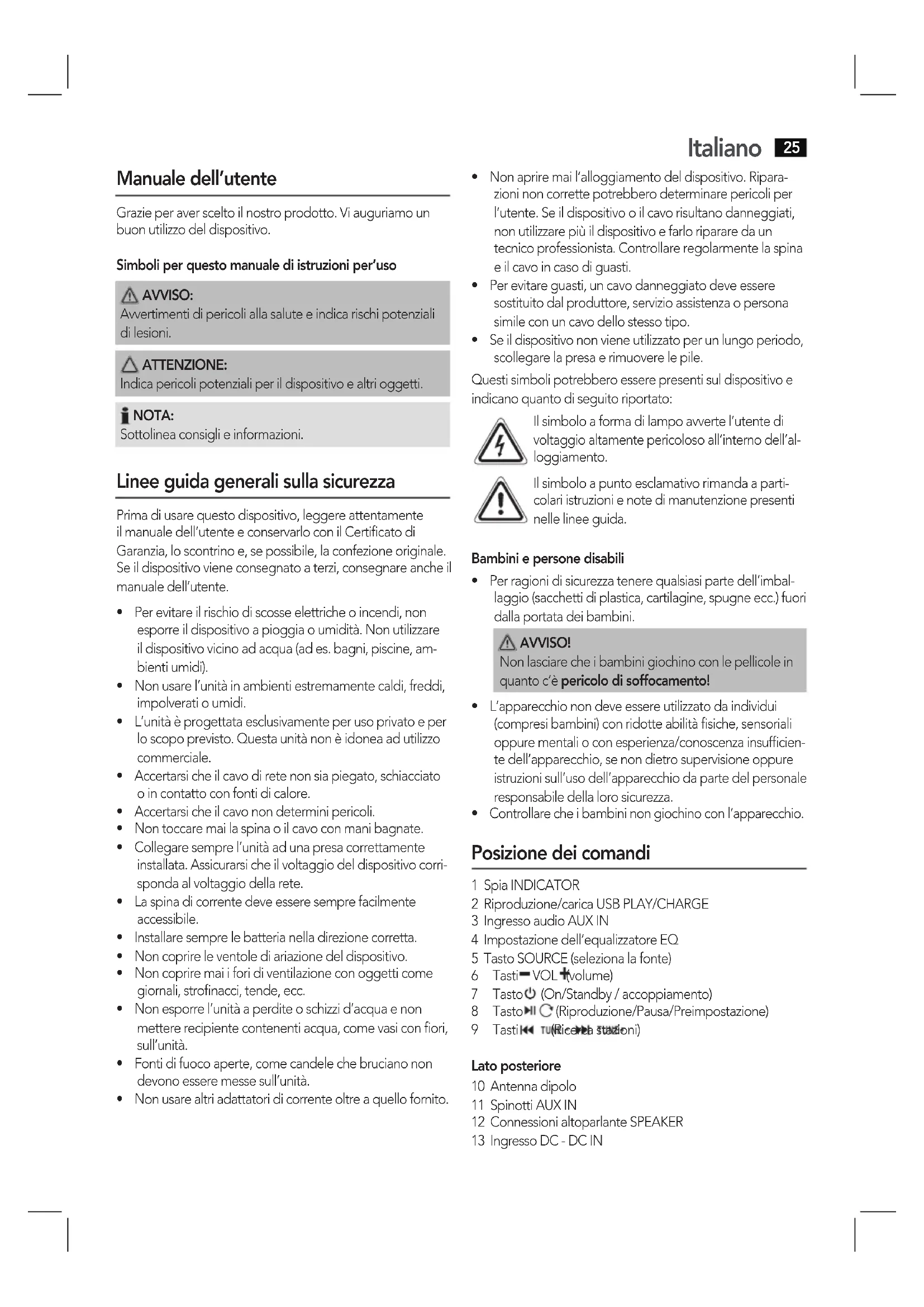 Non aprire mai l'alloggiamento del dispositivo. Riparazioni non corrette potrebbero determinare pericoli per l'utente. Se il dispositivo o il cavo risultano danneggiati, non utilizzato più il dispositivo e farlo riparare da un technician professionista. Controllare regolamente la spina e il cavo in caso di quasti.