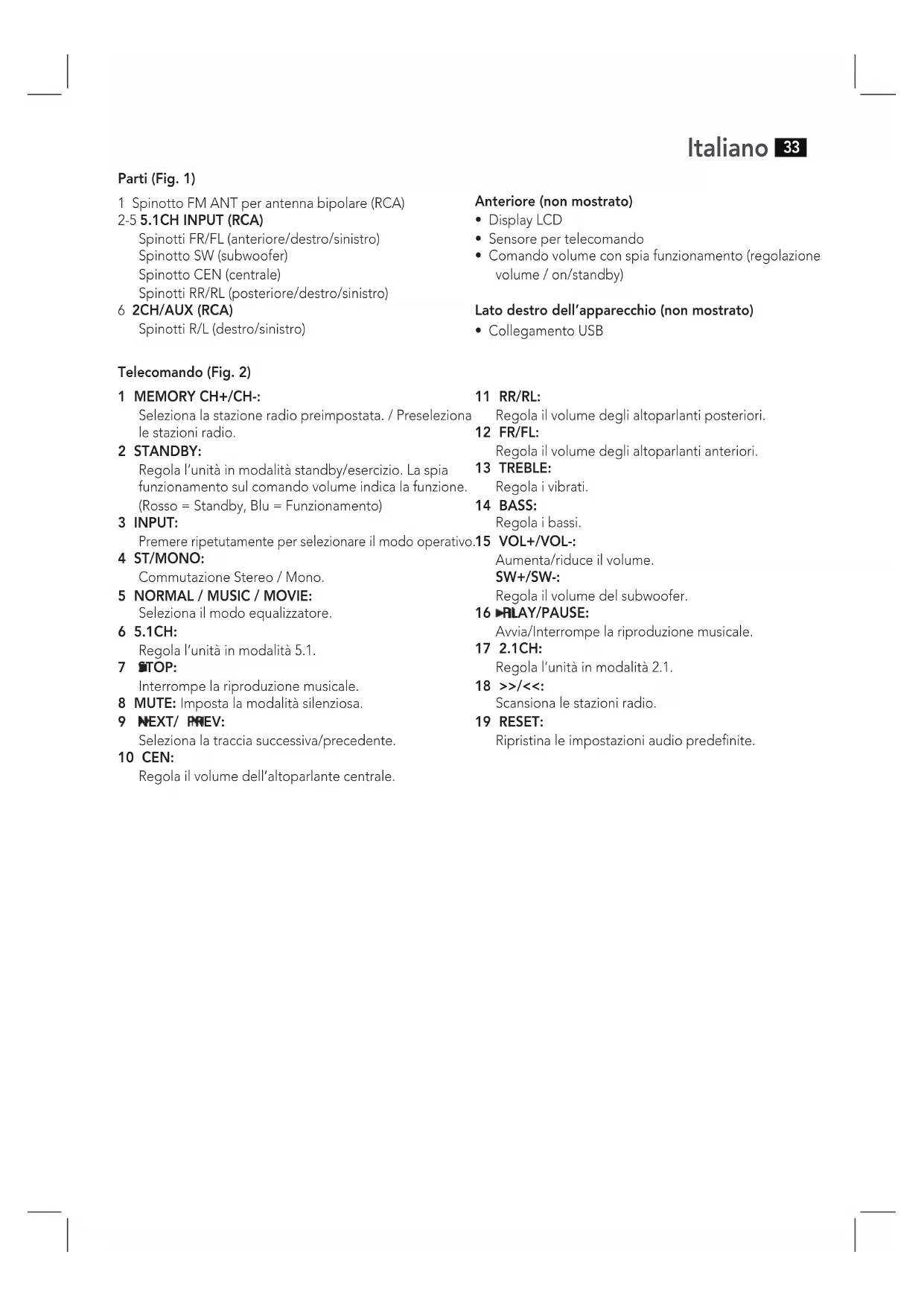 - Collegamento USB Telecomando (Fig. 2) 1 MEMORY CH+/CH-: Seleziona la stazione radio preimpostata. / Preseleziona le stazioni radio. 2 STANDBY: Regola l‘unità in modalità standby/esercizio. La spia funzionamento sul comando volume indica la funzione. (Rosso = Standby, Blu = Funzionamento) 3 INPUT: Premere ripetutamente per selezionare il modo operativo. 4 ST/MONO: Commutazione Stereo / Mono. 5 NORMAL / MUSIC / MOVIE: Seleziona il modo equalizzatore. 6 5.1CH: Regola l‘unità in modalità 5.1. 7 STOP: Interrompe la riproduzione musicale. 8 MUTE: Imposta la modalità silenziosa. 9 NEXT/ PREV: Seleziona la traccia successiva/precedente. 10 CEN: Regola il volume dell’altoparlante centrale. 11 RR/RL: Regola il volume degli altoparlanti posteriori. 12 FR/FL: Regola il volume degli altoparlanti anteriori. 13 TREBLE: Regola i vibrati. 14 BASS: Regola i bassi. 15 VOL+/VOL-: Aumenta/riduce il volume. SW+/SW-: Regola il volume del subwoofer. 16 PLAY/PAUSE: Avvia/Interrompe la riproduzione musicale. 17 2.1CH: Regola l‘unità in modalità 2.1. 18 >>/<<: Scansiona le stazioni radio. 19 RESET: Ripristina le impostazioni audio predenite.Italiano