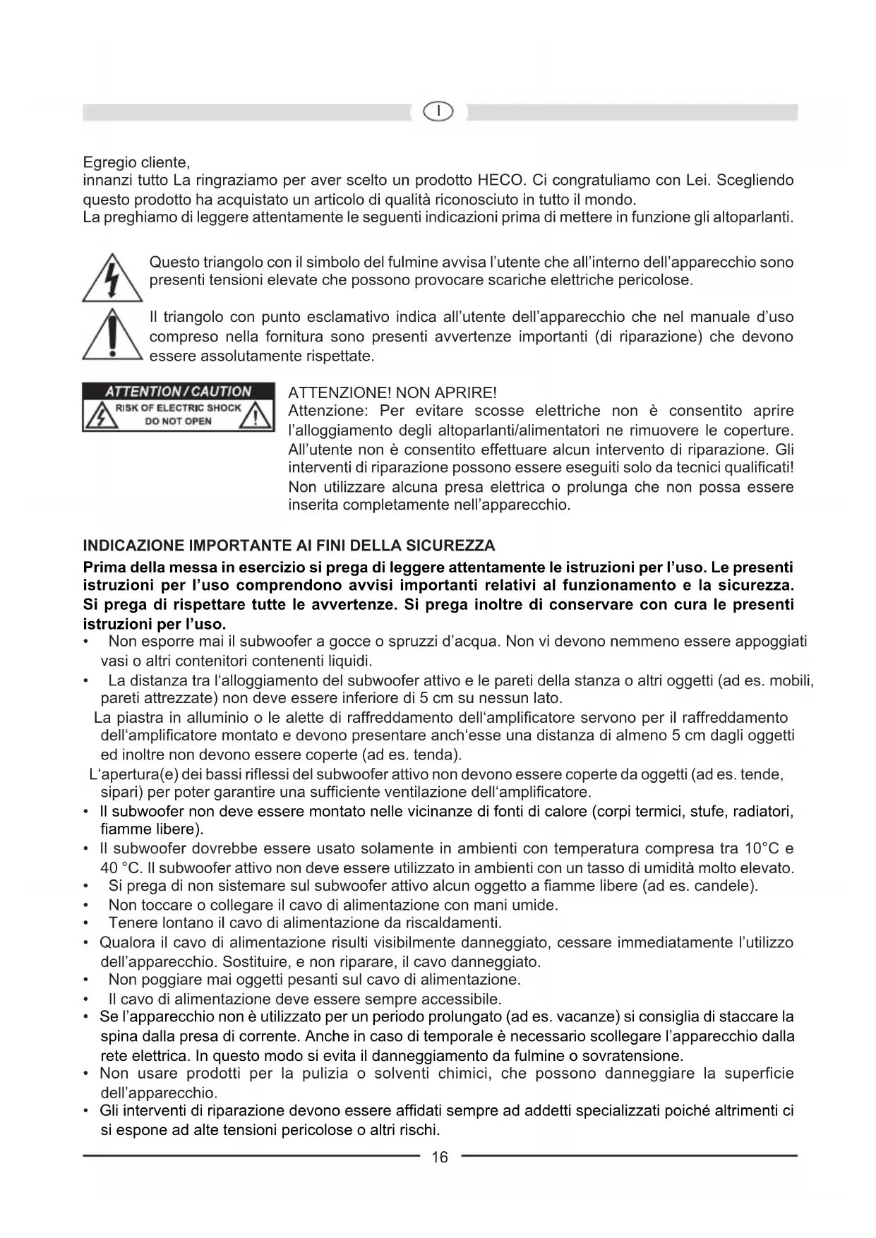 - Gli interventi di riparazione devono essere affidati sempre ad addetti specializzati poiché altrimenti ci si espone ad alte tensioni pericolose o altri rischi. 16I IL SUBWOOFER ATTIVO HECO PHALANX MICRO 200A Prima di collegare gli altoparlanti è necessario assicurarsi che tutti gli apparecchi siano disattivati. Inoltre assicurarsi che tutti i cavi degli altoparlanti abbiano una polarizzazione corretta, vale a dire che il polo positivo della relativa uscita sia collegato col polo positivo della rispettiva entrata ed il polo negativo con il rispettivo polo negativo. Si prega inoltre di osservare le indicazioni dettate nel manuale d’uso del proprio ricevitore/amplificatore e degli altoparlanti. MONTAGGIO La frequenza trasmessa dal subwoofer non è percepibile dall‘udito umano e per questo in generale il montaggio non risulta particolarmente difficile. Si consiglia tuttavia una sistemazione davanti alla postazione di ascolto vicino agli altoparlanti frontali. Si consiglia inoltre di mantenere una distanza laterale verso oggetti e pareti di almeno 30 cm ed una distanza dalla parte posteriore di almeno 20 cm. In caso contrario potrebbe essere compromessa la riproduzione dei bassi. GLI ELEMENTI DI CONTROLLO DEL SUBWOOFER (FIGURA 1) Collegamento alla rete (1) Essendo un subwoofer con amplificatore integrato, deve essere collegato alla rete mediante il cavo fornito in dotazione. Interruttore di rete (2), Spia di accensione (3), Interruttore di accensione (4) Interruttore di rete ON Interruttore di rete OFF Interruttore di accensione ON Subwoofer in funzionamento continuo, la spia di accensione è verde. Impostazione pratica per la riproduzione di programmi con lunghi passaggi silenziosi (si evita uno spegnimento involontario del subwoorfer). Subwoofer disattivato, spia di accensione spenta. Quando l’apparecchio non viene utilizzato per un periodo prolungato, si consiglia di scegliere questa impostazione. Interruttore di accensione AUTO Subwoofer inizialmente in modalità di standby, la spia di accensione è rossa. Quando il subwoofer riceve un segnale dal ricevitore, questi si accende automaticamente e la spia di accensione è verde. Quando il subwoofer non riceve più alcun segnale, dopo circa 15 min. passa automaticamente in modalità standby, la spia di accensione ridiventa rossa. Impostazione consigliata. Ingresso line (5) Per il collegamento ad uscite di livelli bassi di un ricevitore/amplificatore (funzionamento stereo). Vedere figura 2. Per il collegamento ad un ricevitore AV con uscita subwoofer per bassi, vedere figura 3. Uscite line (6) Per il collegamento ad ingressi di livelli sonori bassi di un ricevitore/amplificatore (funzionamento stereo), vede-re Figura 2, o per il collegamento di un ulteriore subwoofers.
