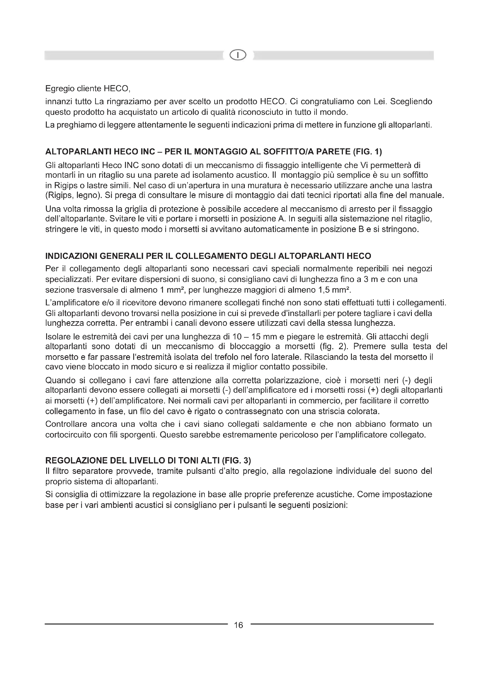 15Egregio cliente HECO, innanzi tutto La ringraziamo per aver scelto un prodotto HECO. Ci congratuliamo con Lei. Scegliendo questo prodotto ha acquistato un articolo di qualità riconosciuto in tutto il mondo. La preghiamo di leggere attentamente le seguenti indicazioni prima di mettere in funzione gli altoparlanti. ALTOPARLANTI HECO INC – PER IL MONTAGGIO AL SOFFITTO/A PARETE (FIG. 1) Gli altoparlanti Heco INC sono dotati di un meccanismo di ssaggio intelligente che Vi permetterà di montarli in un ritaglio su una parete ad isolamento acustico. Il montaggio più semplice è su un softto in Rigips o lastre simili. Nel caso di un’apertura in una muratura è necessario utilizzare anche una lastra (Rigips, legno). Si prega di consultare le misure di montaggio dai dati tecnici riportati alla ne del manuale. Una volta rimossa la griglia di protezione è possibile accedere al meccanismo di arresto per il ssaggio dell’altoparlante. Svitare le viti e portare i morsetti in posizione A. In seguiti alla sistemazione nel ritaglio, stringere le viti, in questo modo i morsetti si avvitano automaticamente in posizione B e si stringono. INDICAZIONI GENERALI PER IL COLLEGAMENTO DEGLI ALTOPARLANTI HECO Per il collegamento degli altoparlanti sono necessari cavi speciali normalmente reperibili nei negozi specializzati. Per evitare dispersioni di suono, si consigliano cavi di lunghezza no a 3 m e con una sezione trasversale di almeno 1 mm², per lunghezze maggiori di almeno 1,5 mm². L’amplicatore e/o il ricevitore devono rimanere scollegati nché non sono stati effettuati tutti i collegamenti. Gli altoparlanti devono trovarsi nella posizione in cui si prevede d’installarli per potere tagliare i cavi della lunghezza corretta. Per entrambi i canali devono essere utilizzati cavi della stessa lunghezza. Isolare le estremità dei cavi per una lunghezza di 10 – 15 mm e piegare le estremità. Gli attacchi degli altoparlanti sono dotati di un meccanismo di bloccaggio a morsetti (g. 2). Premere sulla testa del morsetto e far passare l‘estremità isolata del trefolo nel foro laterale. Rilasciando la testa del morsetto il cavo viene bloccato in modo sicuro e si realizza il miglior contatto possibile. Quando si collegano i cavi fare attenzione alla corretta polarizzazione, cioè i morsetti neri (-) degli altoparlanti devono essere collegati ai morsetti (-) dell’amplicatore ed i morsetti rossi (+) degli altoparlanti ai morsetti (+) dell’amplicatore. Nei normali cavi per altoparlanti in commercio, per facilitare il corretto collegamento in fase, un lo del cavo è rigato o contrassegnato con una striscia colorata. Controllare ancora una volta che i cavi siano collegati saldamente e che non abbiano formato un cortocircuito con li sporgenti. Questo sarebbe estremamente pericoloso per l’amplicatore collegato. REGOLAZIONE DEL LIVELLO DI TONI ALTI (FIG. 3) Il ltro separatore provvede, tramite pulsanti d’alto pregio, alla regolazione individuale del suono del proprio sistema di altoparlanti. Si consiglia di ottimizzare la regolazione in base alle proprie preferenze acustiche. Come impostazione base per i vari ambienti acustici si consigliano per i pulsanti le seguenti posizioni: