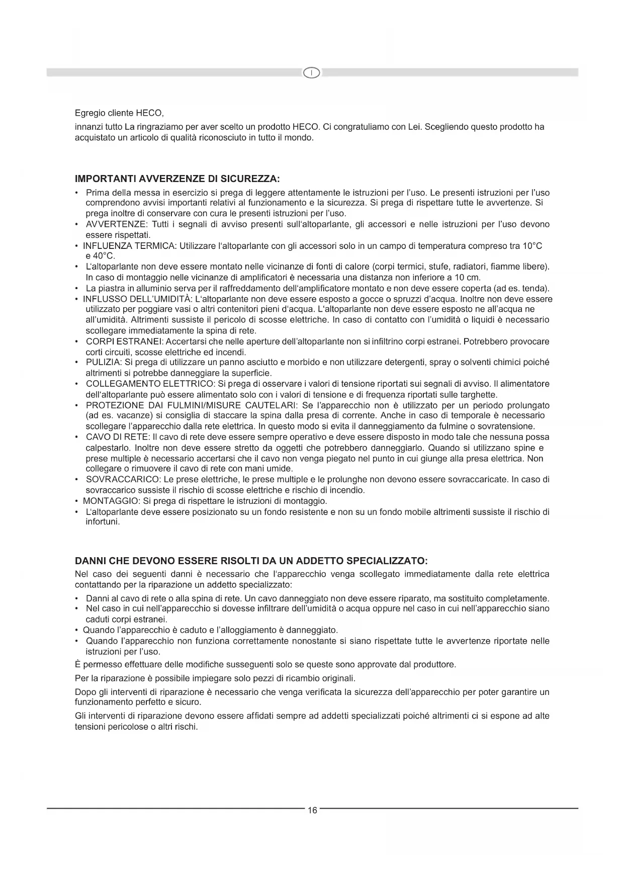Conguration: 3 voies, stéréo Puissance de sortie RMS/Max.: 80/160 Watt Bande passante: 32 — 28000 Hz Fréquence séparatrice: 180 Hz, 3800 Hz Dimensions (LxHxP): 380 x 222 x 263 mm Poids: 5,8 kg SOUS TOUTES RÉSERVES DE MODIFICATIONS TECHNIQUES16 Egregio cliente HECO, innanzi tutto La ringraziamo per aver scelto un prodotto HECO. Ci congratuliamo con Lei. Scegliendo questo prodotto ha acquistato un articolo di qualità riconosciuto in tutto il mondo. IMPORTANTI AVVERZENZE DI SICUREZZA: